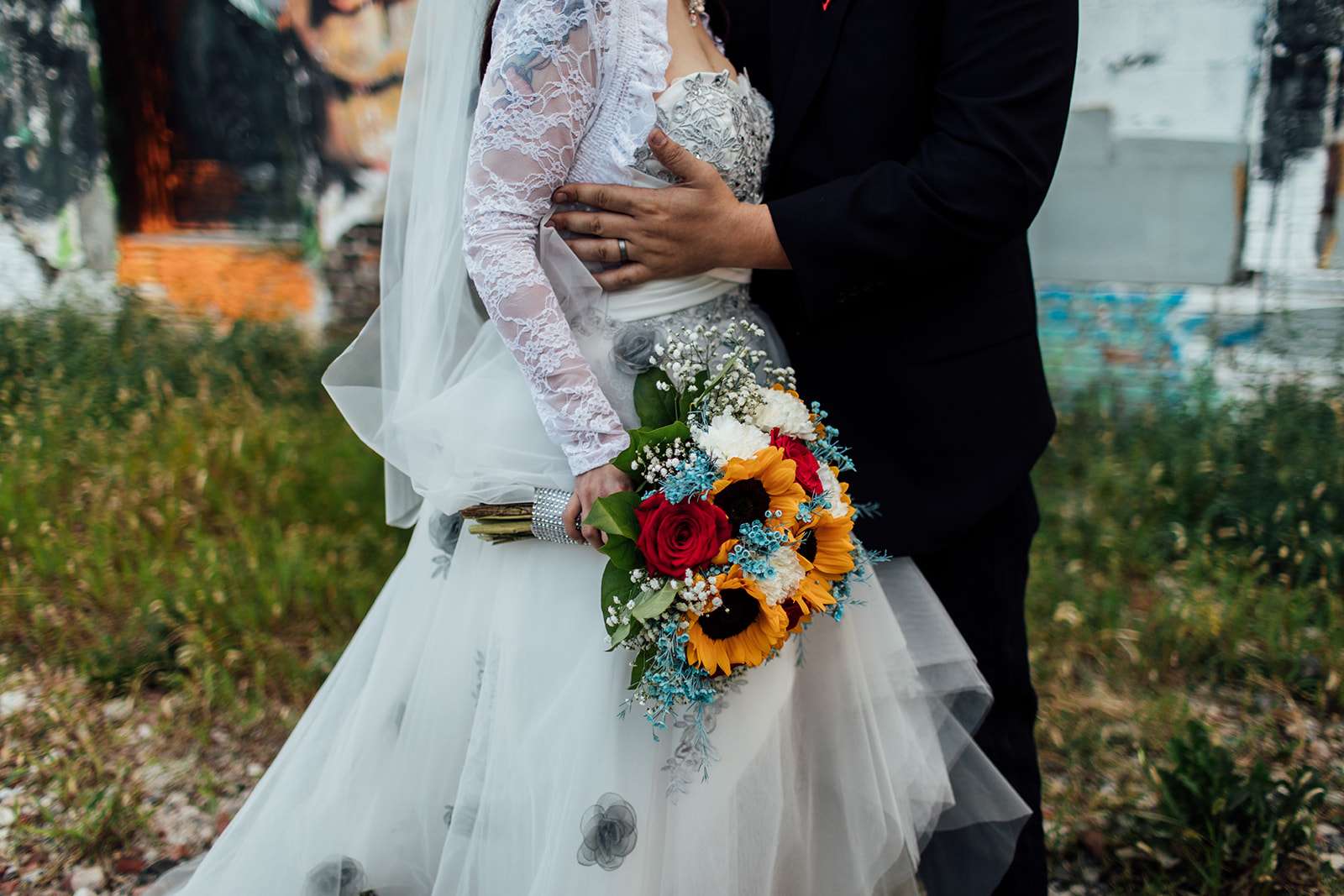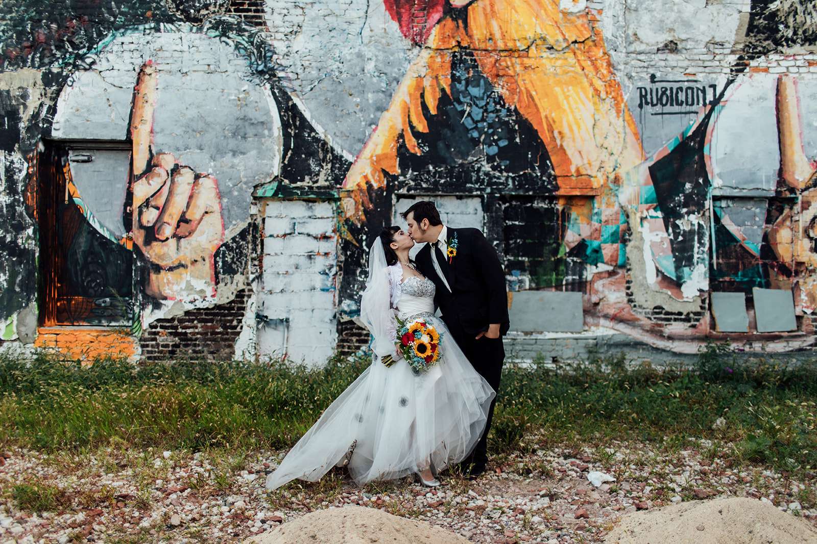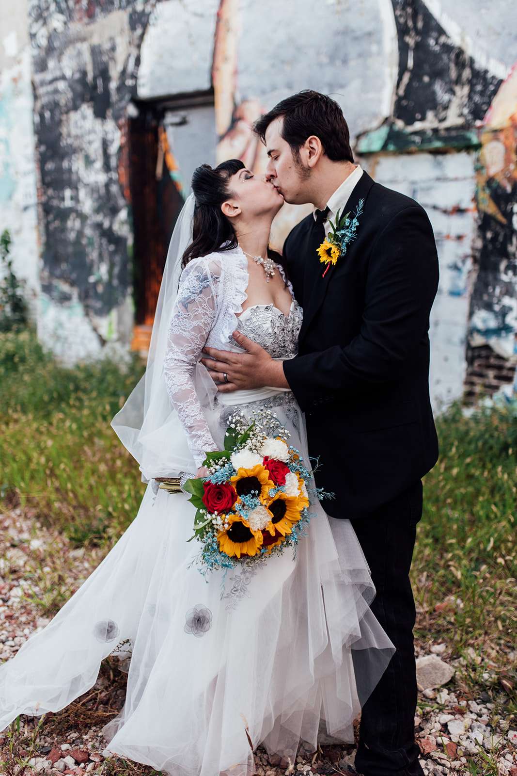 “I have been enchanted with Philadelphia’s Magic Gardens for many years,” the bride began, “so when we decided to go for a centre city wedding I jumped at the chance to have our ceremony there. It held it’s own beauty and whimsy. As a quirky couple into into art and fantasy as well as alternative punk scene, it was a deal. We exchanged vows in a fashion that is us and Bill even quoted Doug Stanhope ‘Baby I love you so much I want to get the government involved.’ Everyone had a chuckle from that! We walked out to a lovely instrumental version of Ho Hey From the Lumineers. We had a bubble send off and record shaped hand fan programs. It was a truly a magical experience.”