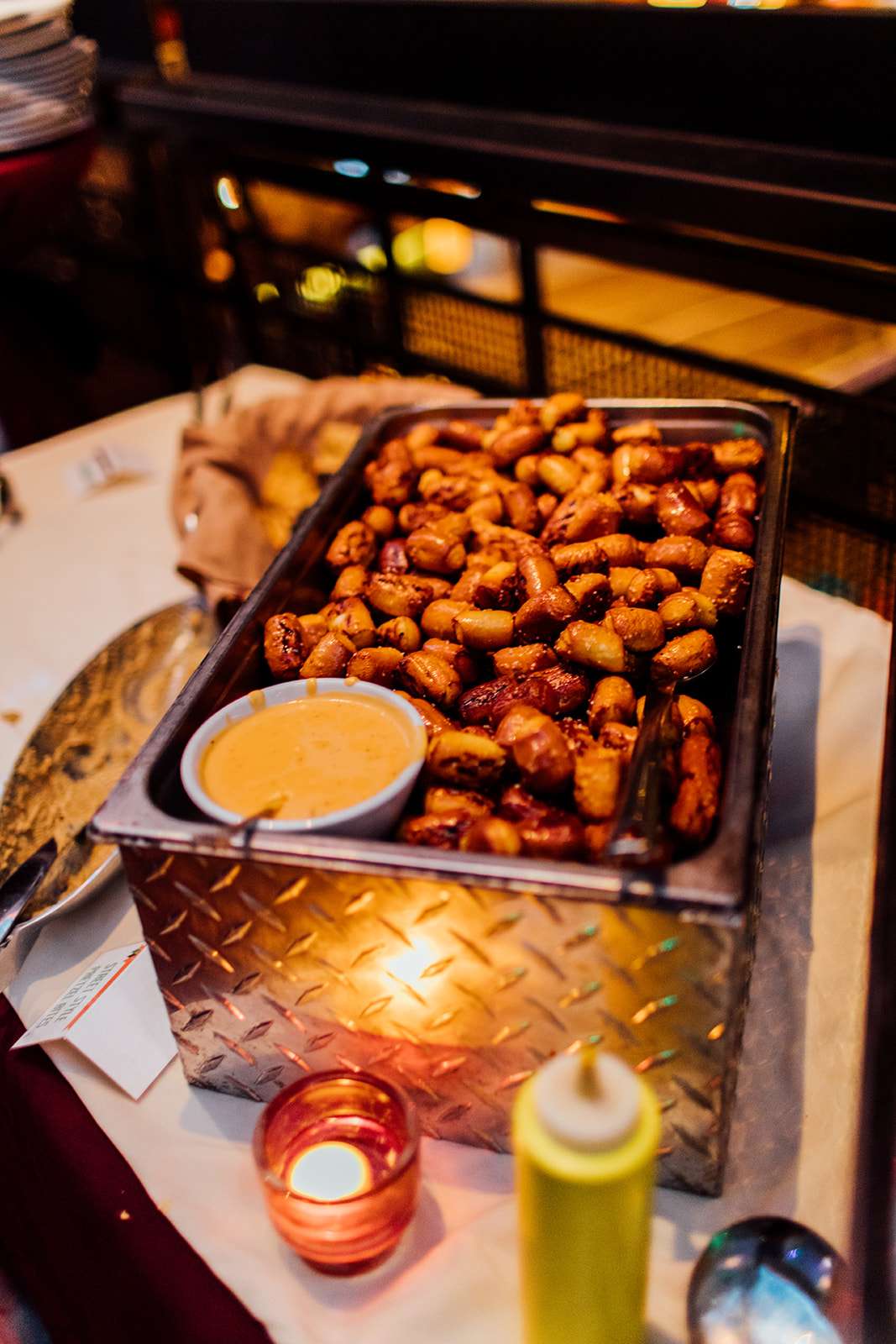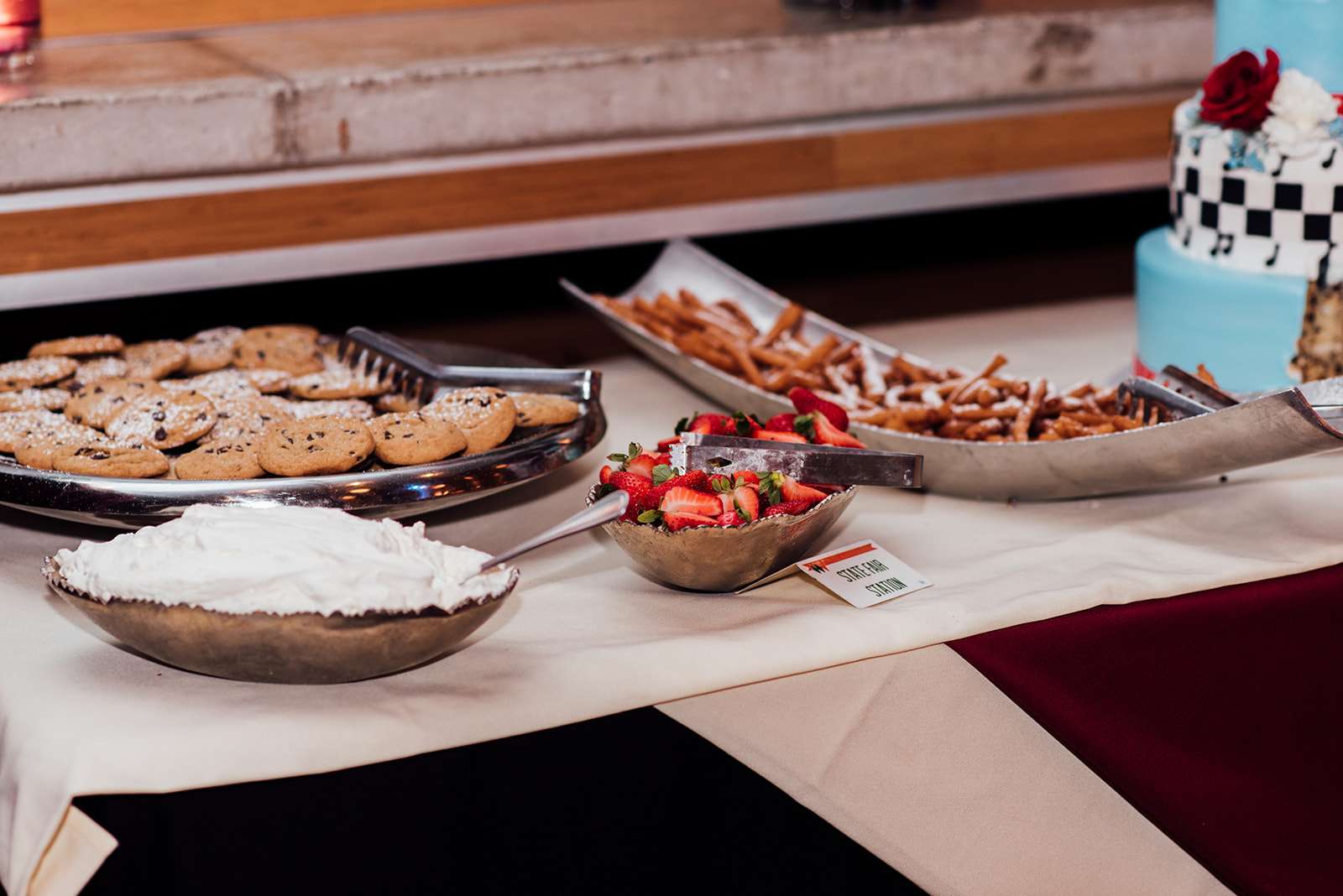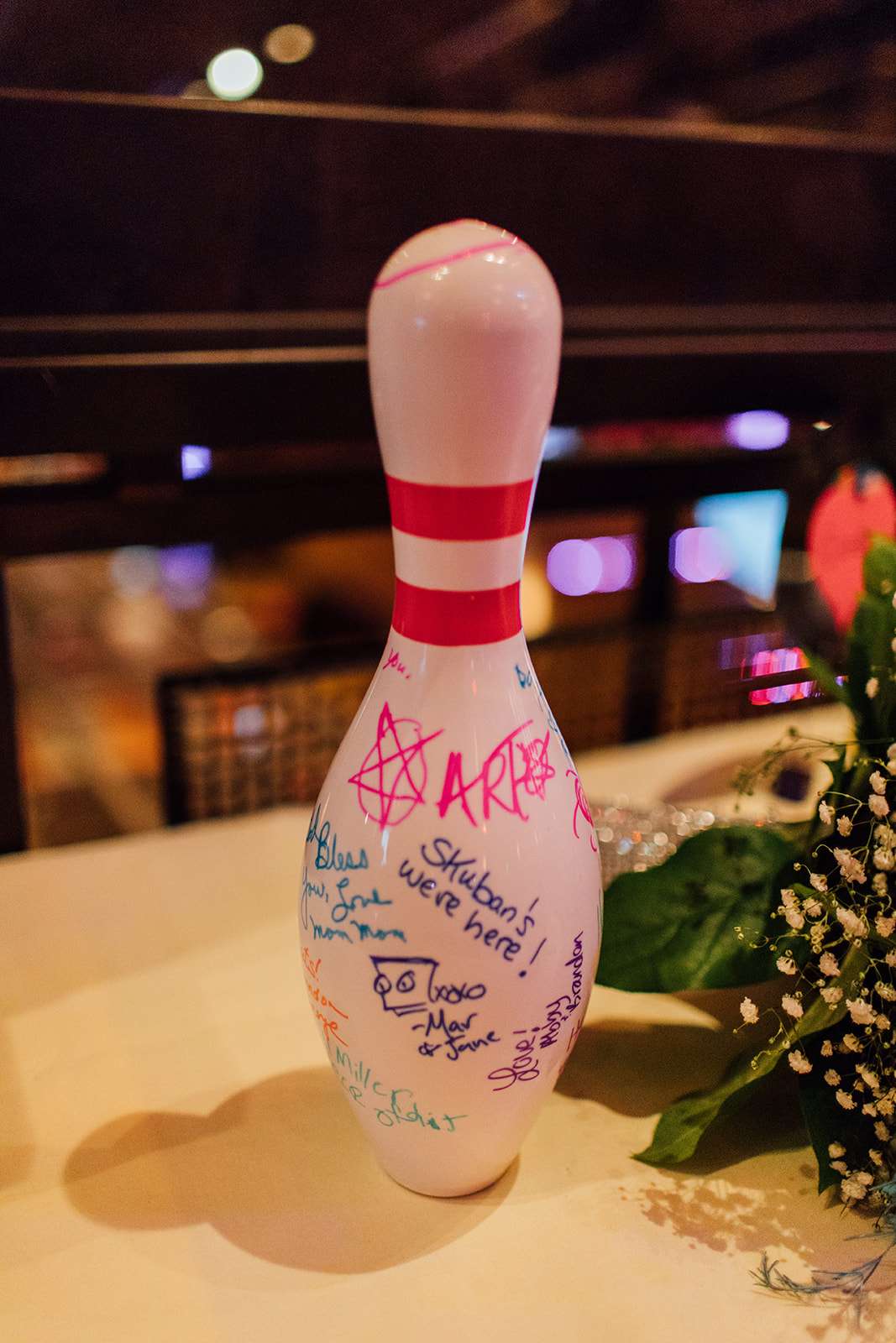 “I think the idea of having a wedding reception with arcade games, bowling, pool tables and dancing made our wedding very unique”, she continued. “The buffet had fun food options too, like corn dogs, mac & cheese with gold fish, veggie dogs, meatloaf and sides of mashed potato bar. We wanted food that people love and we didn’t want them to be hungry!”