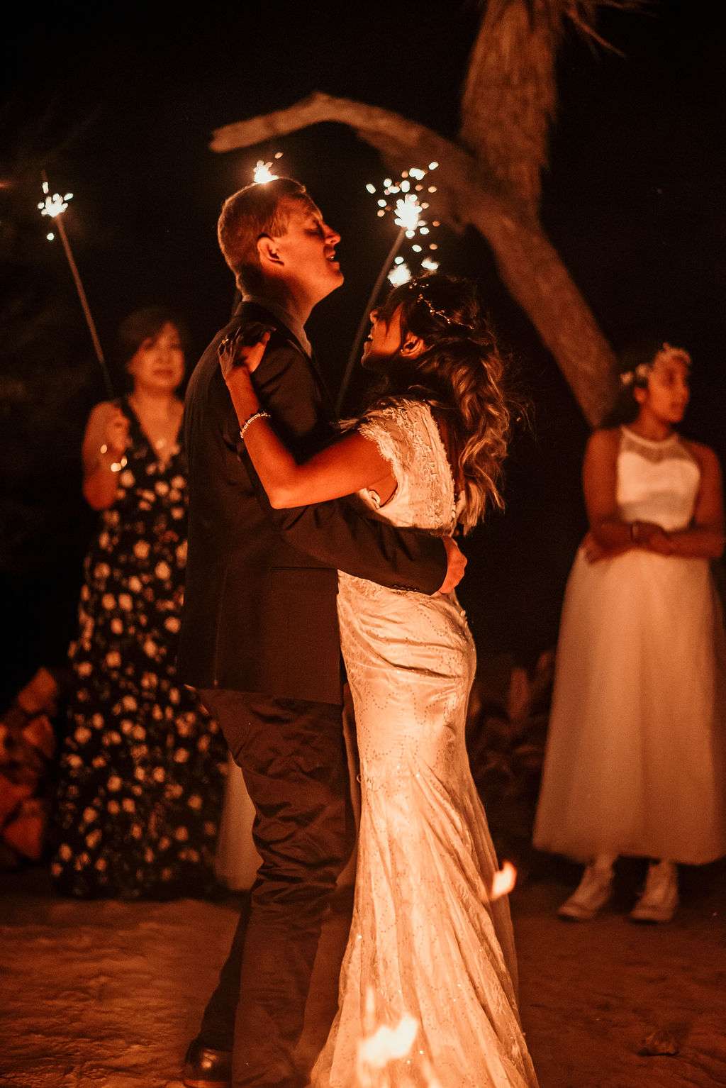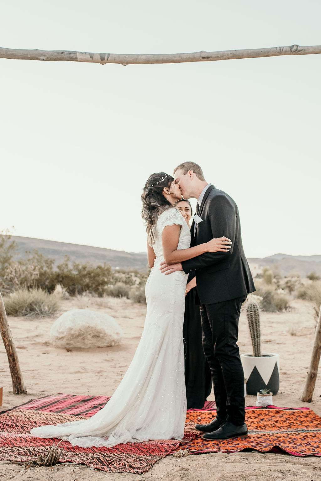 Samantha and Jason didn’t want a big fuss and they certainly didn’t want their wedding to overtake their lives. So instead of taking the traditional route, they decided to rent an AirBnB in Yucca Valley and have a low key yet perfectly ‘them’ wedding in the desert. Both lovers of this environment, they’ve spent many vacations exploring places such as Joshua Tree, Mojave, Red Rock and Death Valley. Surrounded by their nearest and dearest they said their “I do’s” under a homemade arch, with the ceremony officiated by the bride’s sister.