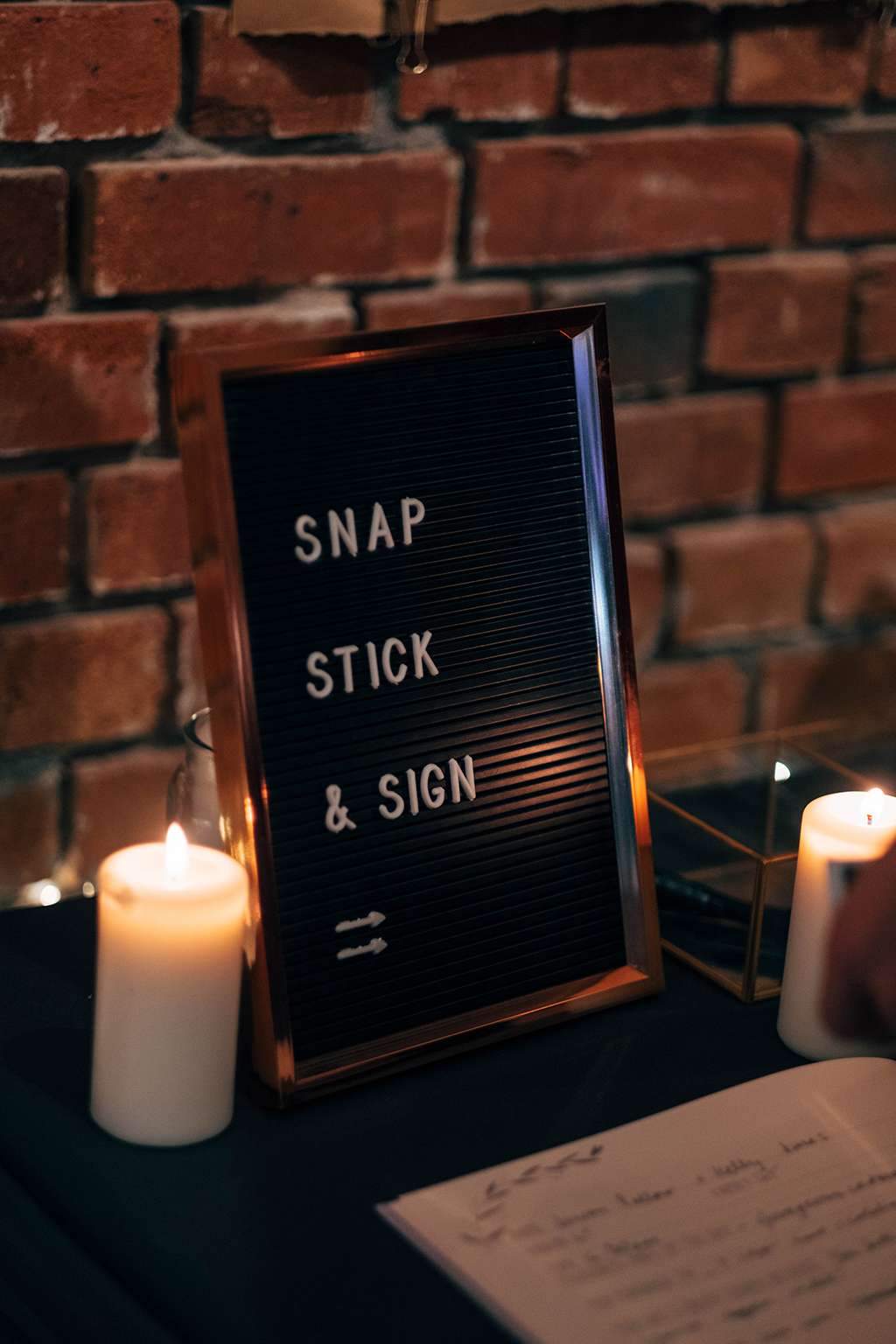 Most of their house is charcoal grey and covered with an an obscene amount of plants, so coupled with the previous work of their florist, their moorland setting and their love of greenery this was the basis for their aesthetics. They filled glass jars and lanterns with pillar candles to make the rustic old cow shed venue feel warm and inviting, and hired an epic neon sign to compliment the incredible floral arch they got married in front of.