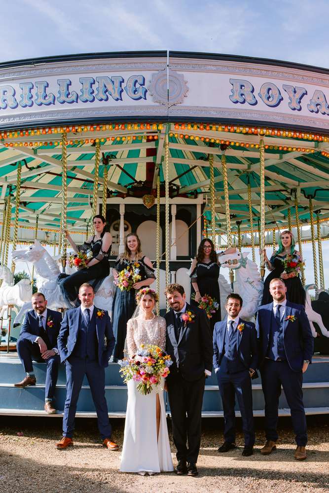 Holly and Simon go to a lot of gigs and festivals together, so they wanted to incorporate this into their September wedding. Making things as colourful and fun as possible was their main priority – they wanted a festival-esque party with a carousel, cassettes, live music and fresh flowers. They were married at the incredible Preston Court in Kent which ticked all their boxes – it even had its own vintage carousel!