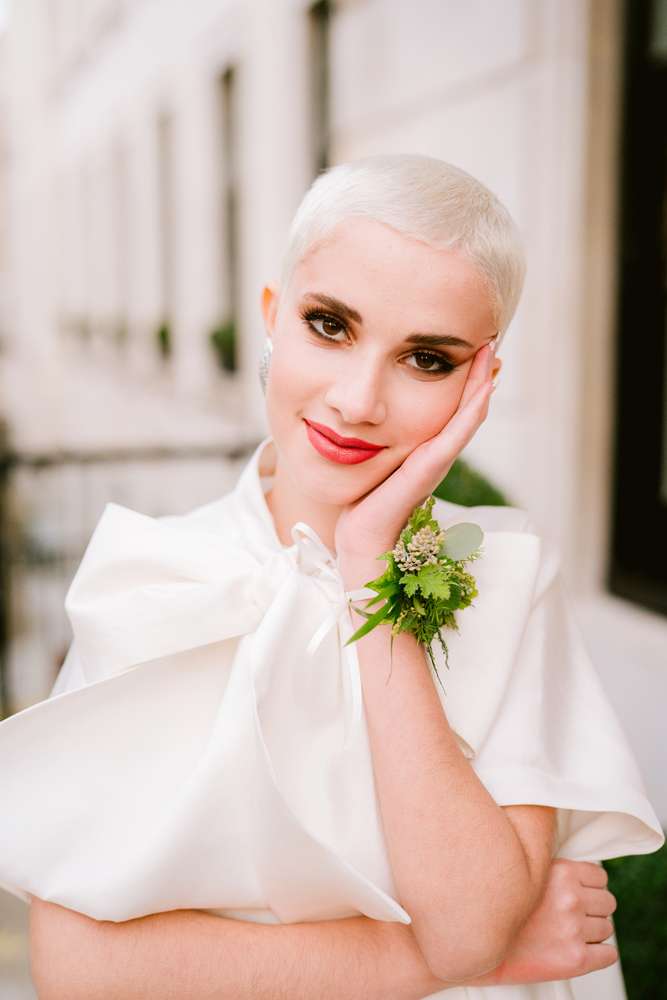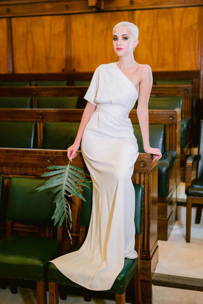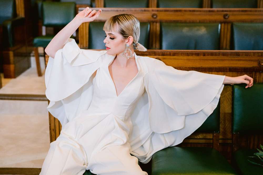 If you’re not one to wear a dress on your wedding day, then why not try experimenting with jumpsuits, sheer shirts, statement blazers and wide legged trousers or cigarette-style pants? Adding layers of texture with different fabrics will also add interest whilst retaining the feeling of simplicity.