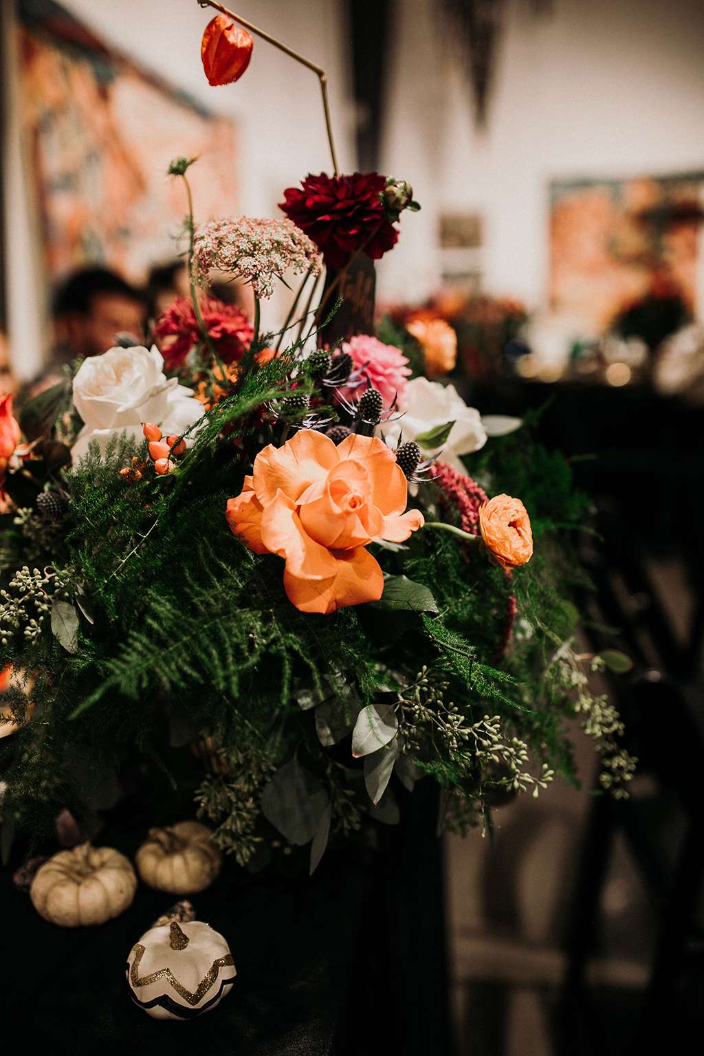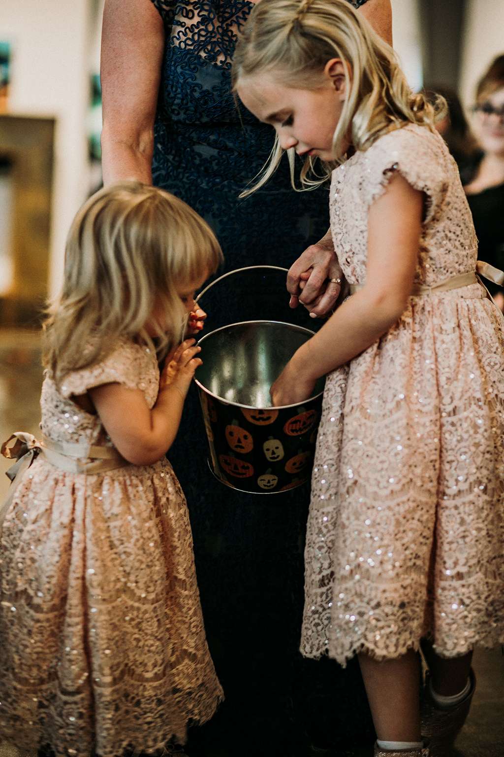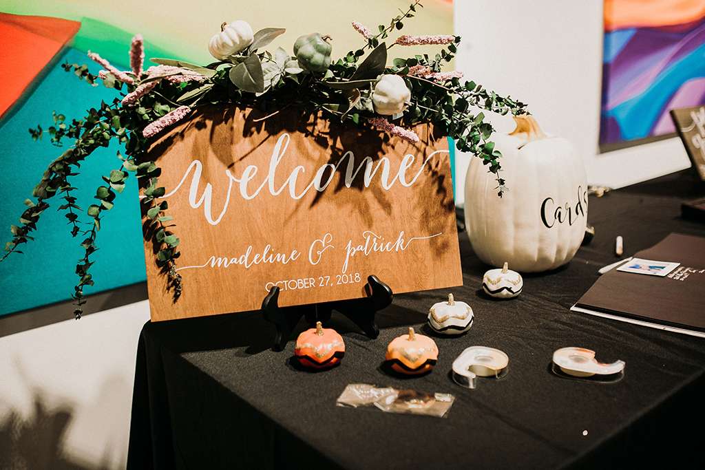 They included a lot of unique, handmade details from themselves and talented friends and family – from the homemade agate wedding arch by Madeline’s dad to her veil by her mum. They had homemade wildflower seed bombs and Halloween candy bags as wedding favours. They used rocks as place names that they’d spent forever collecting, and hand-lettered pumpkins for signage. Their guests got to drink from a different coloured glass goblet that the couple had spent years hunting for in the thrift stores. They made a Polaroid guest book in lieu of a photo booth. It was important to the couple that they had full creative control over one of the most important days of their lives.