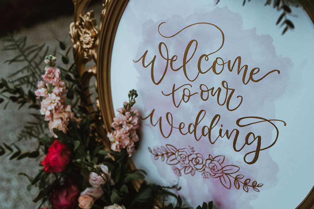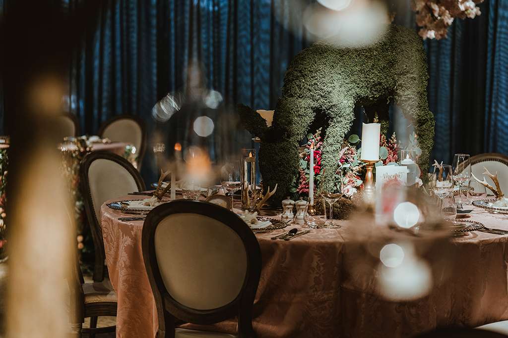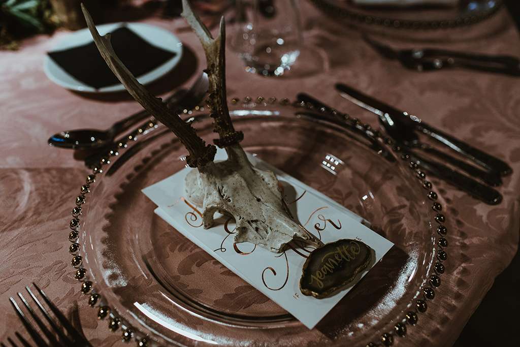 The dress’ floral embroidery inspired the sumptuous blooms used throughout their day – provided by the bride’s own business, Fleur Couture Floral Design. They interspersed florals with antlers and skulls in their invitation designs, complete with hand-stamped wax seals, and filled the venue with foliage covered light up letters and hearts, and lit everything in an ethereal pink glow. “Being in the job I’m in, there was a certain pressure to show something a little out of the box with the visuals,” said Hollie, “but to be honest we just chose what we loved, and my motto if people didn’t like it was ‘well at least they’ll remember it!’”