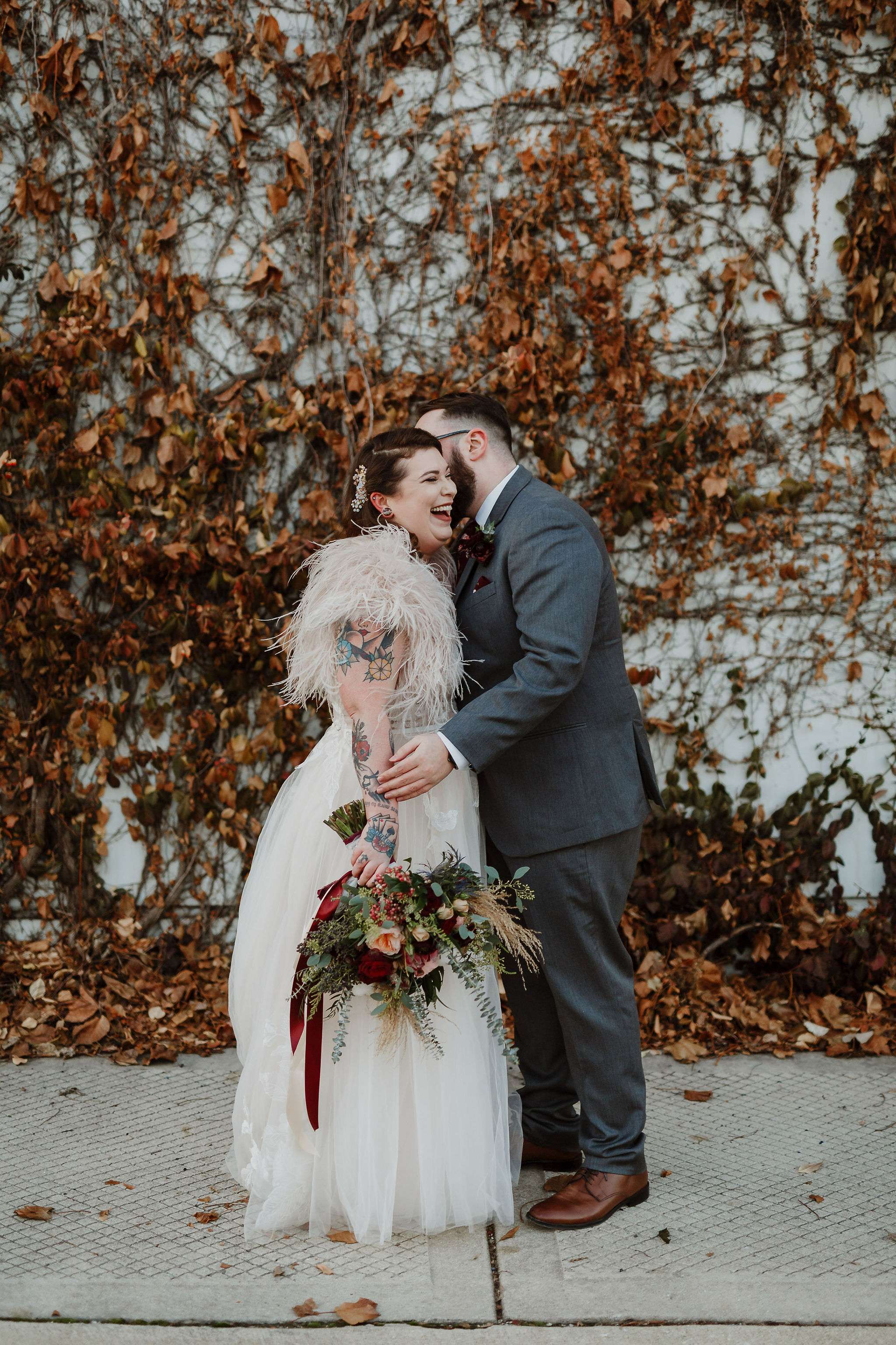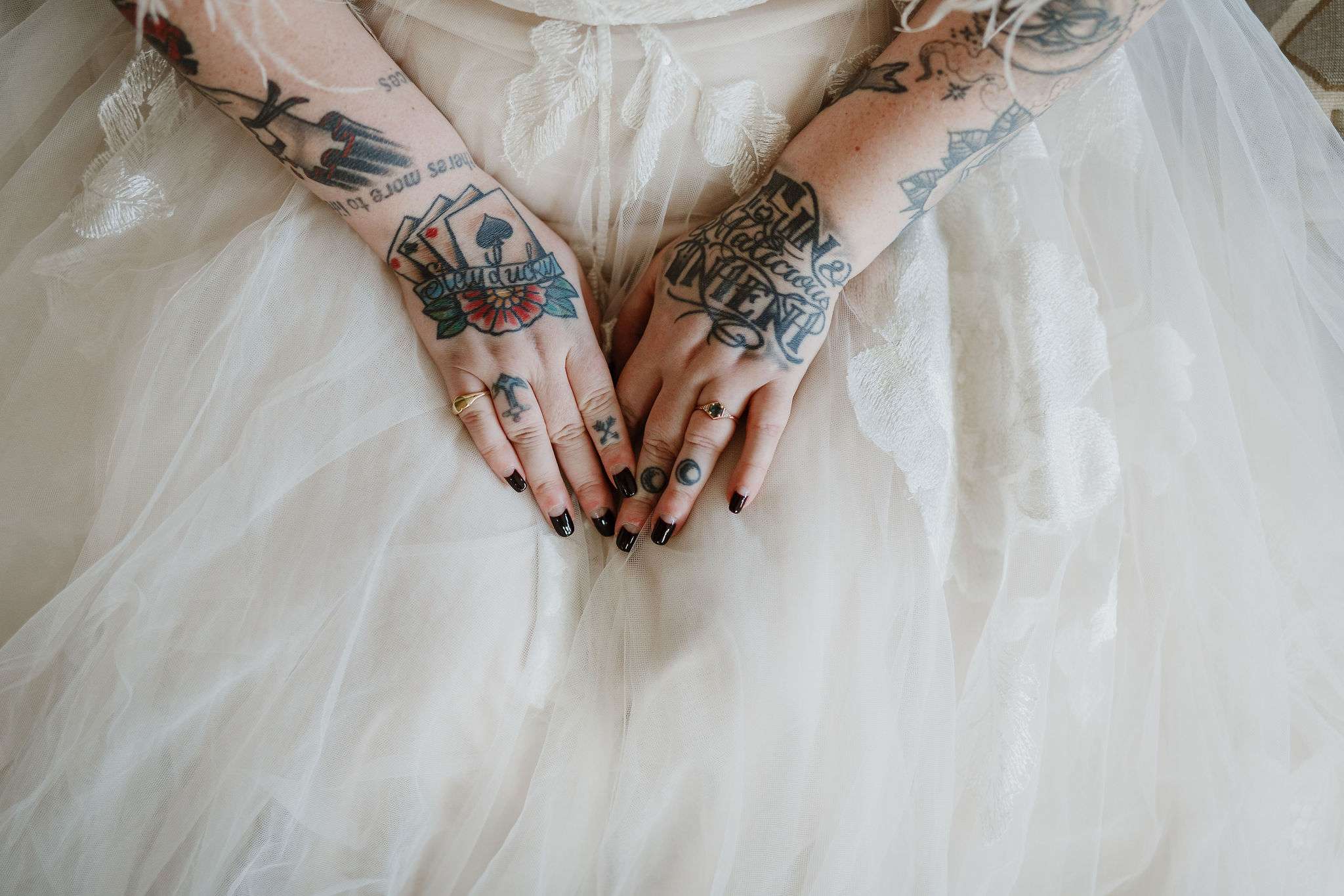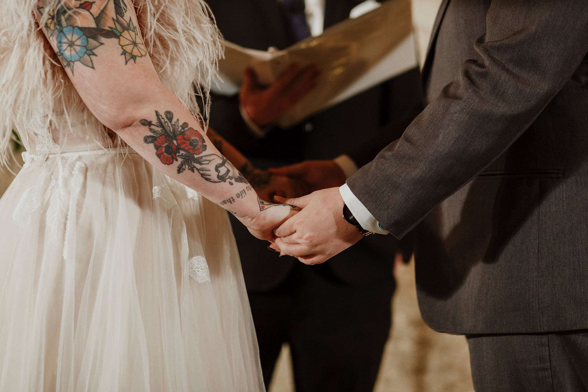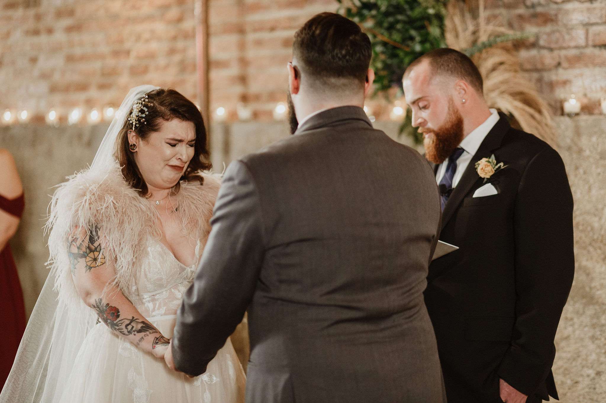 “My favourite part of the day was hearing Justin’s vows for the first time. I had no idea what direction he would go in and was very emotional over his words. Justin’s favourite part was getting to be with each other and with our best friends. Weddings are scary, and no bride or groom should ever have to go through it without the support of each other or their companions. Every time we were able to retreat to our private bridal suite with our friends was a much needed breather, and really helped keep anxiety at bay.”