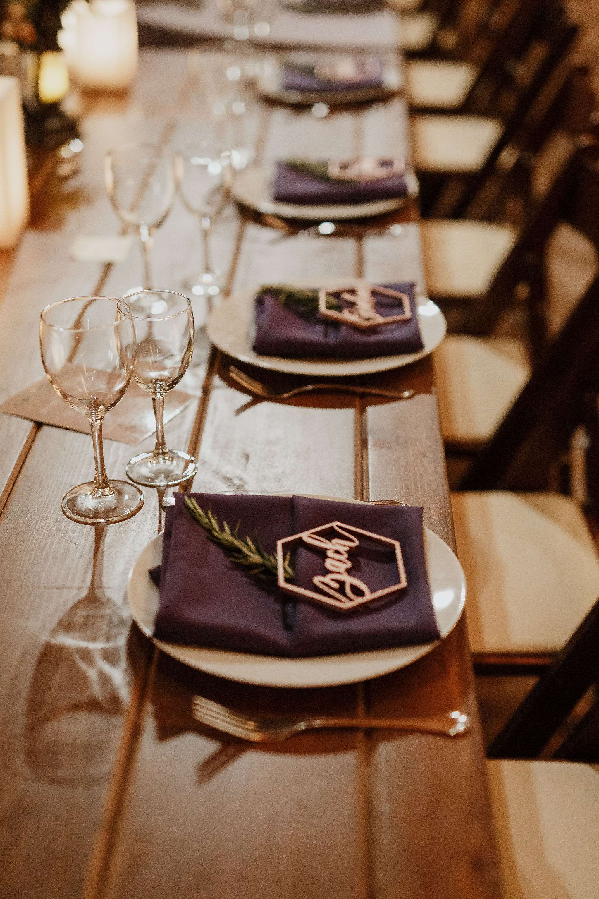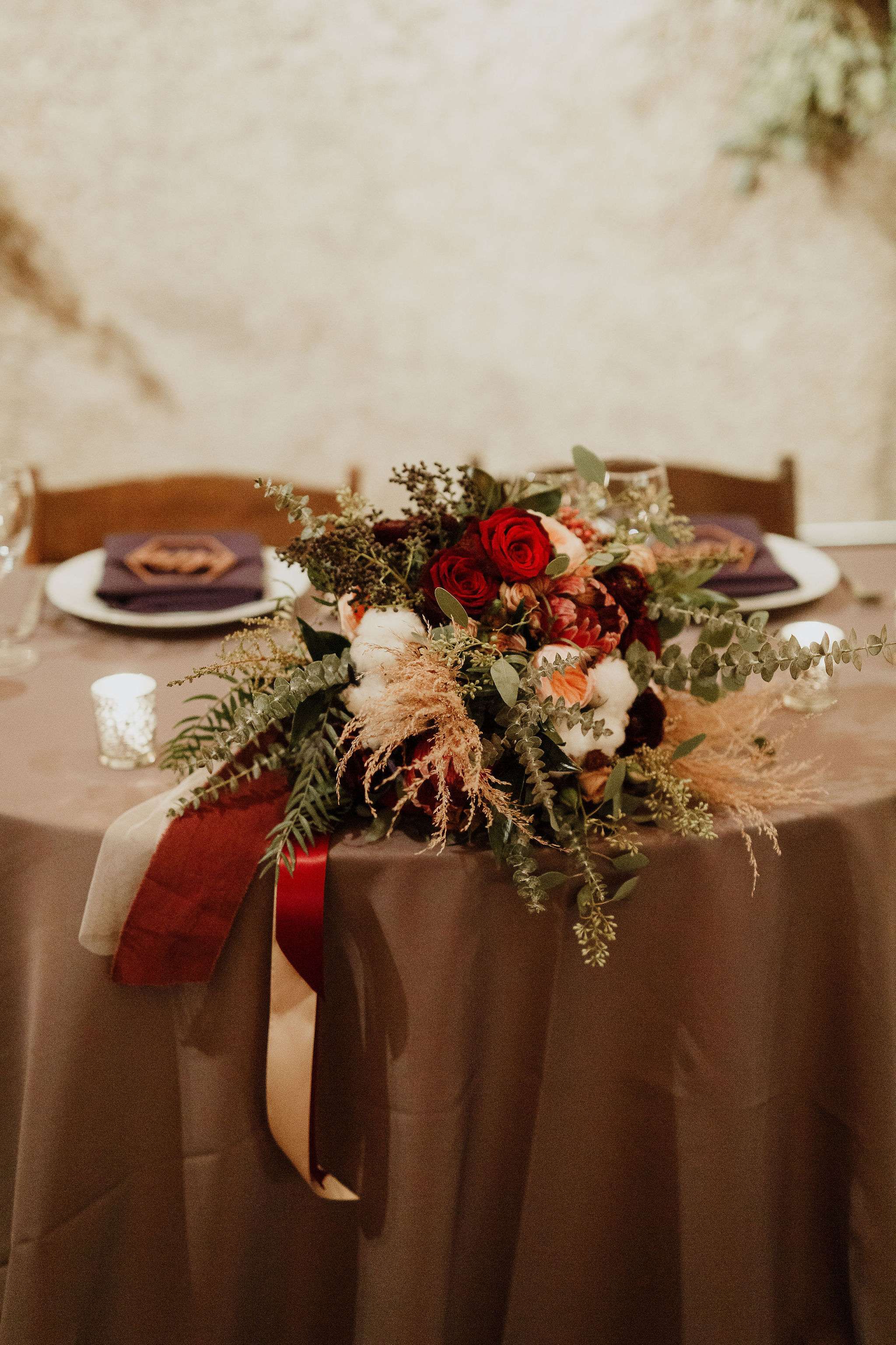 “We were shooting for a theme that seemed wintery, but not in a Christmas or holiday sense”, Whitney began, “and we came up with the idea of Midnight Garden. We worked with our vendors to elicit a focus on warm dim lights, white cotton, burgundy and lush greenery. I would describe our ‘look’ as a rustic outdoor garden at nighttime – only indoors!”