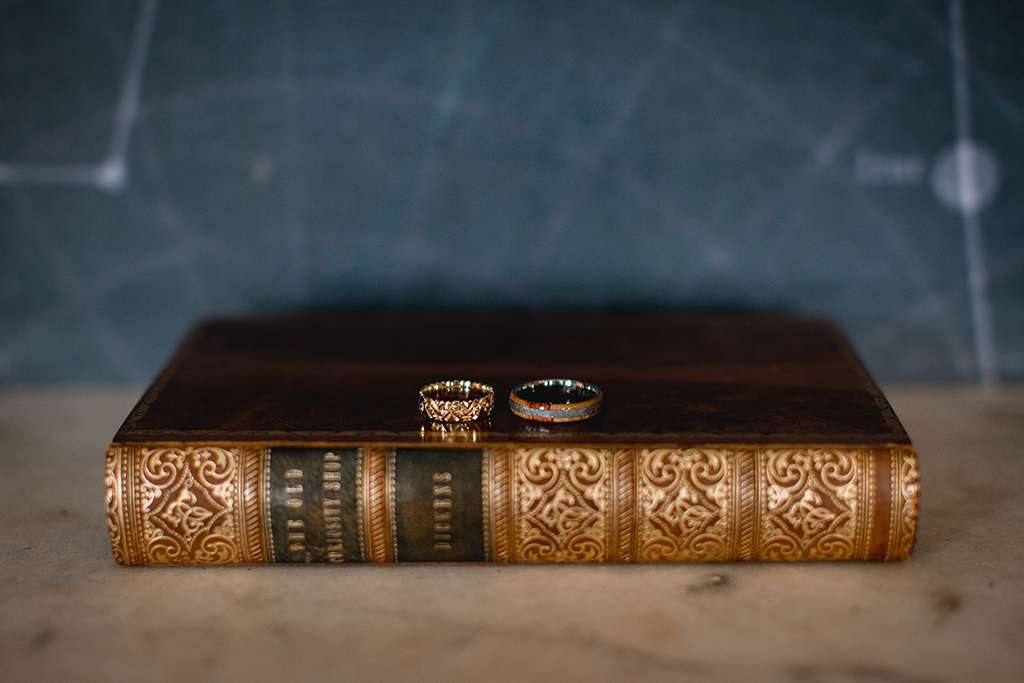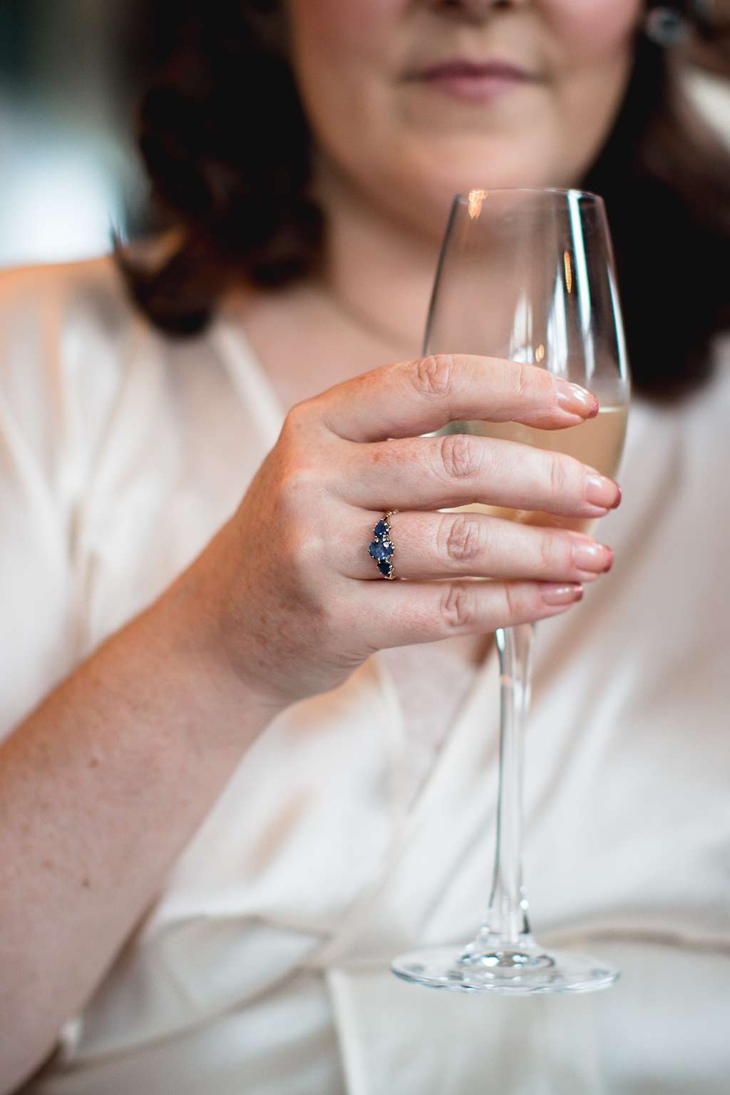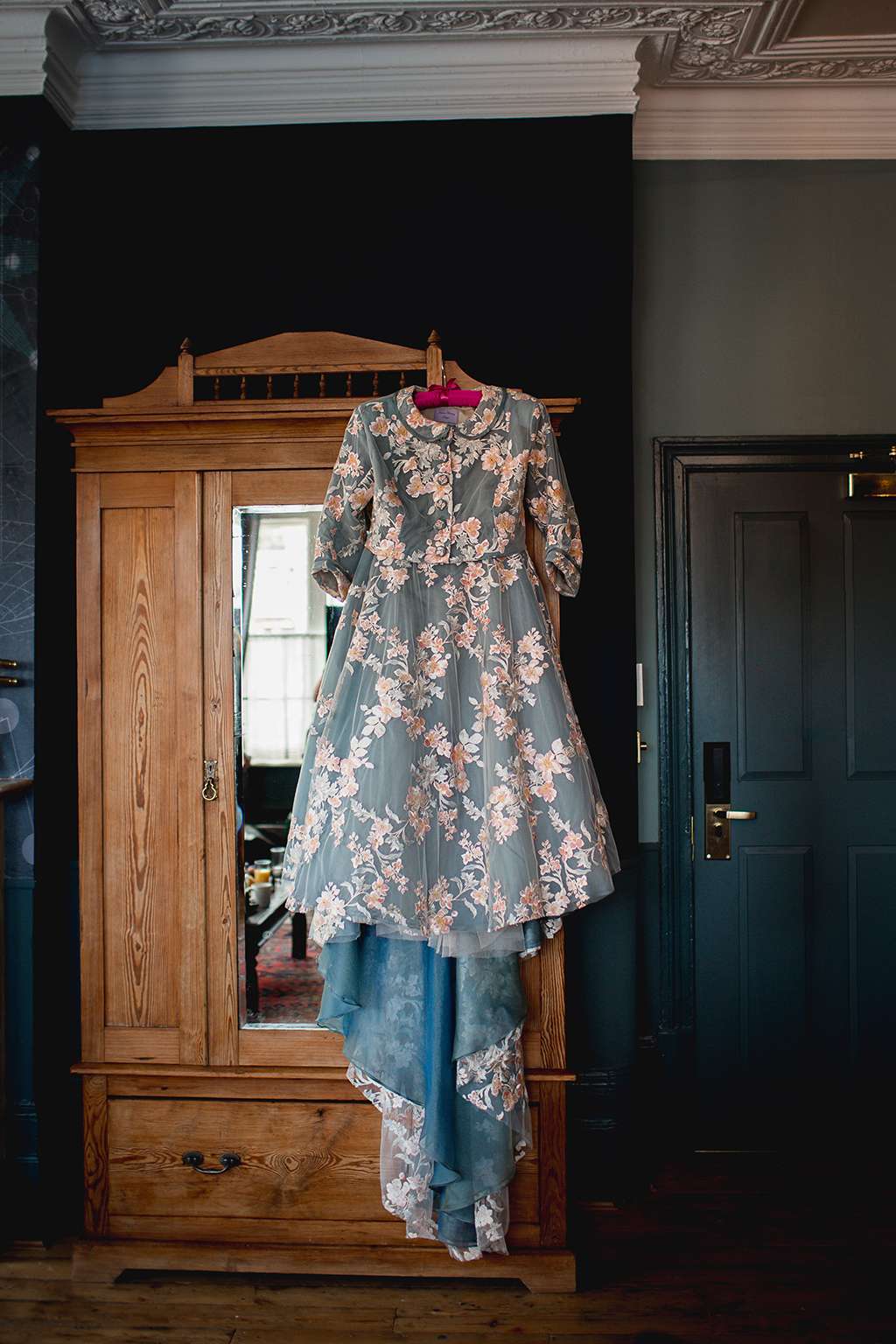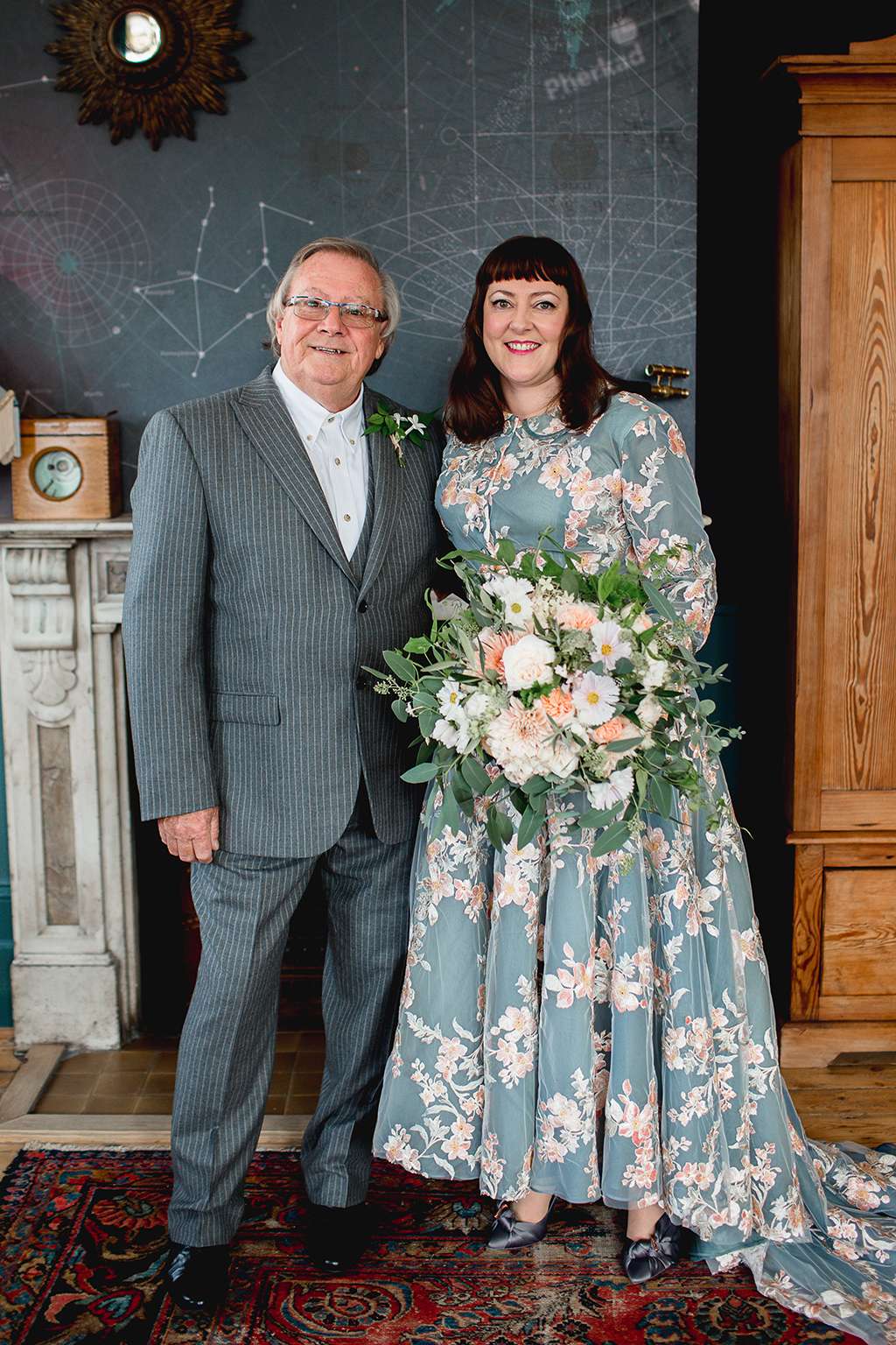 The bride also wanted something really unique to wear. She worked with Joanne Fleming to create her one-of-a-kind blue floral dream dress. It was a two-piece, hand-painted and made of French silk. She opted for a two-piece so she could potentially wear it again. “I don’t ever wear white or cream so didn’t even try on any traditional wedding dresses”, she explained. “From the moment that I found Jo and her designs and knew she was the designer for me. I knew I would like something with colour and I adore full 1950s skirts with pockets and a tops/jackets with a collar.” Ian opted for an informal tweed suit from Tweed Addict and the bridesmaid were in navy dresses or jumpsuits, again chosen so they’d be able to wear them again.