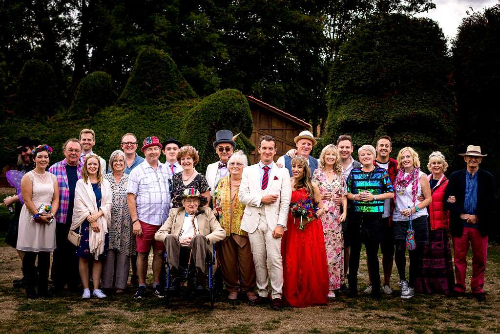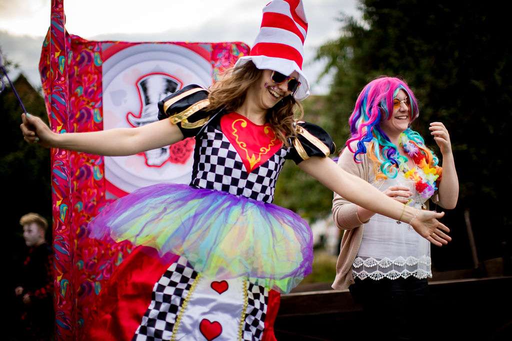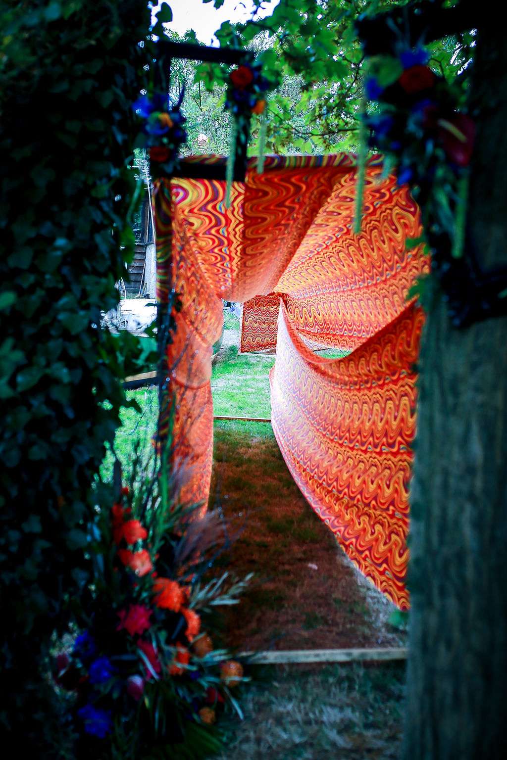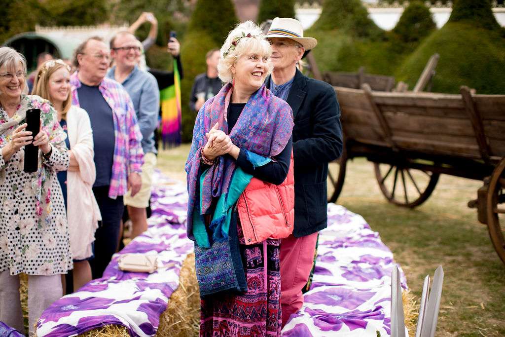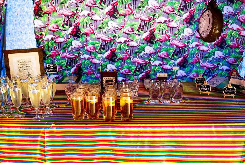 Peter and Vicky, along with friends and family, DIY’d almost all the decorations for their day – including building the stage, decorating the marquee with coloured fabric like a circus tent, and the Alice in Wonderland rabbit hole walkway which the guests entered the wedding through! It was filled with Alice-themed props – little furniture, distorted photos of the couple printed with ‘Everyone’s Mad Here’ and their trip ended with a drinks on a table with ‘Drink Me’ labels. They even had a dressing up table with a light-up mirror, wigs, glittery festival make-up, and fancy-dress costumes – all for the guests to help themselves and wear during the wedding after the ceremony.