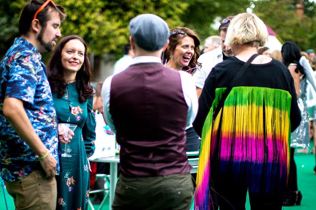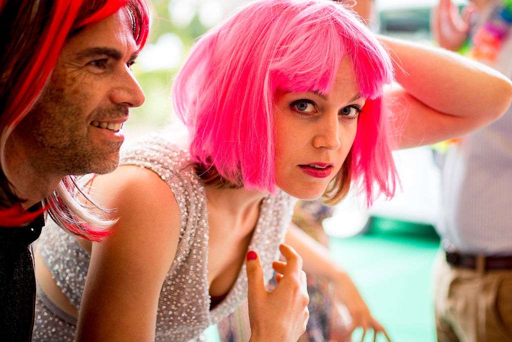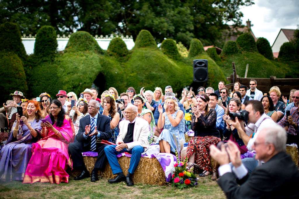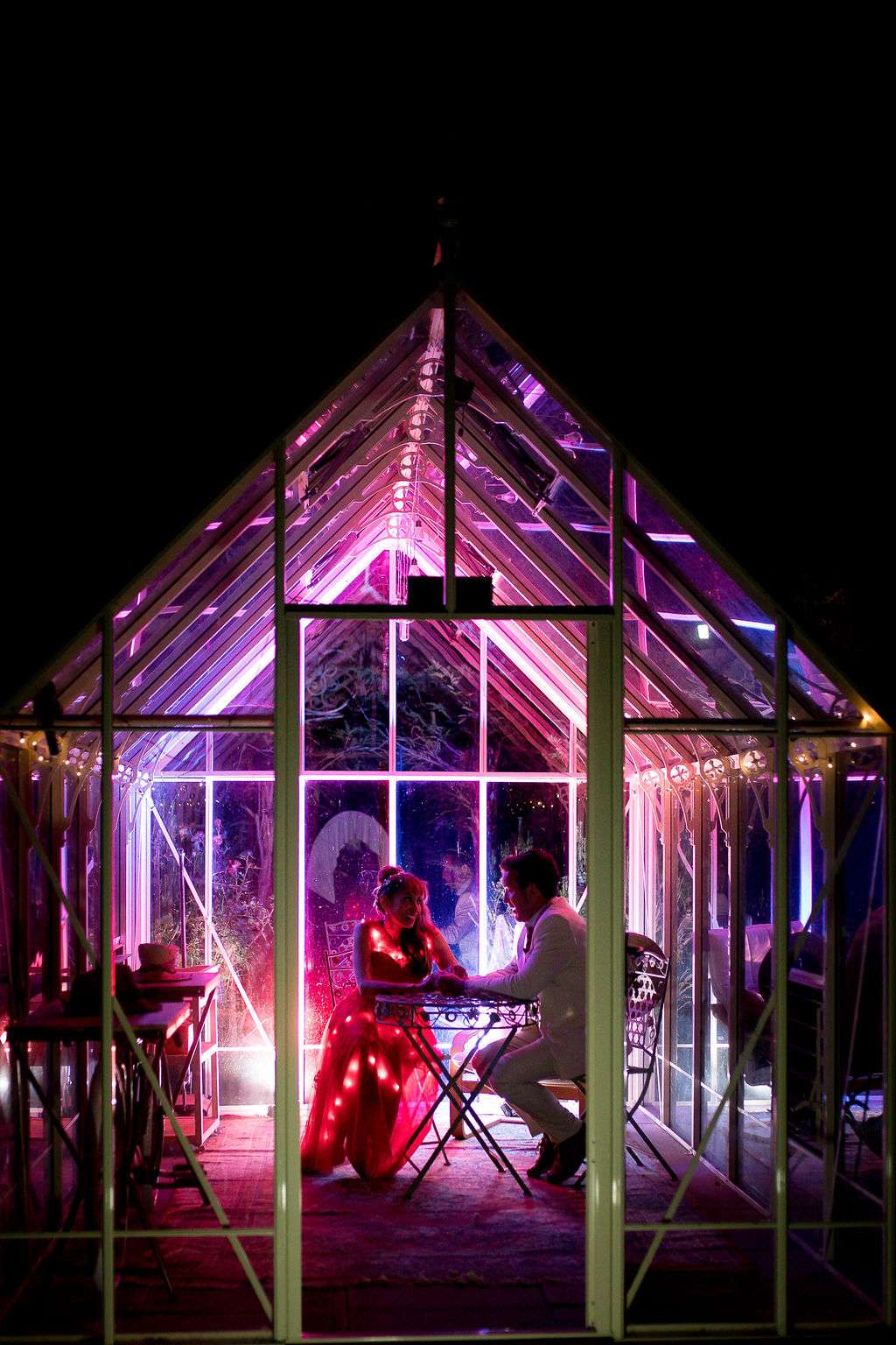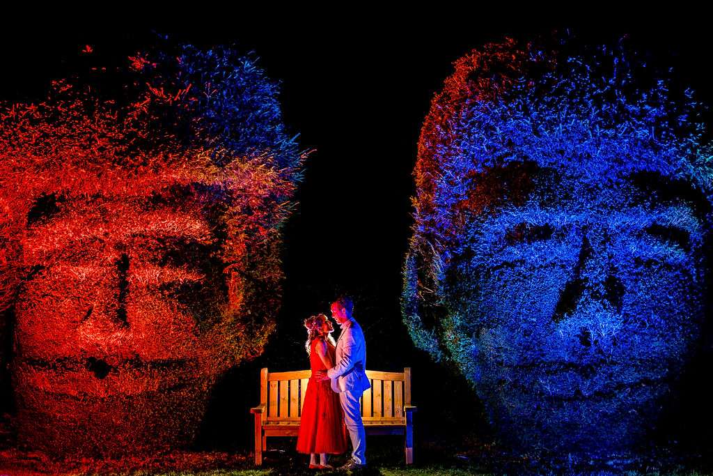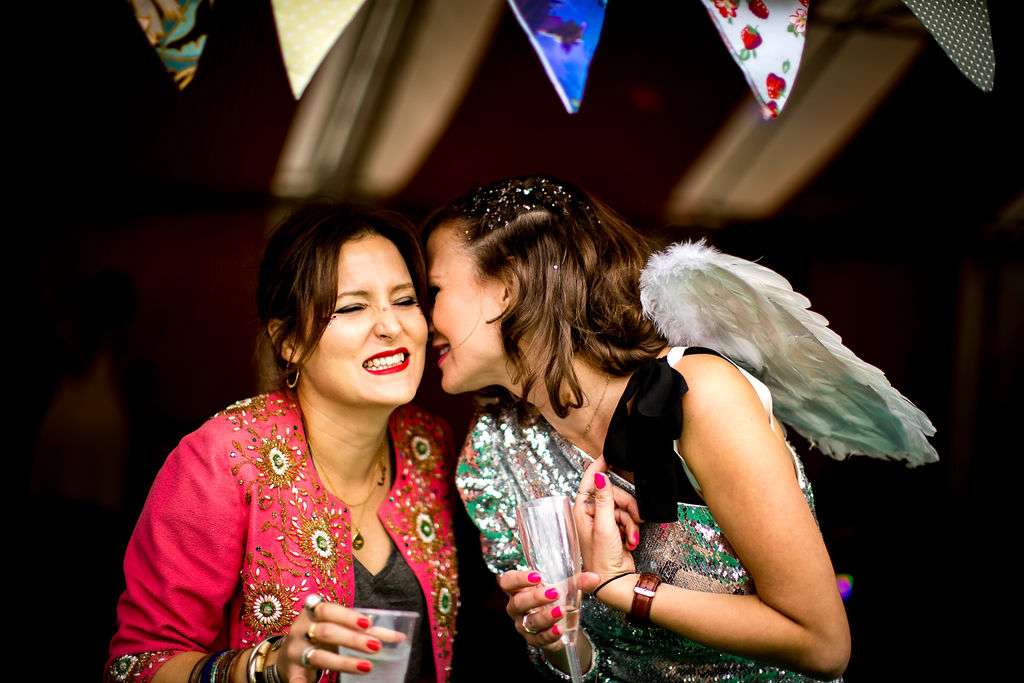 Peter and Vicky, along with friends and family, DIY’d almost all the decorations for their day – including building the stage, decorating the marquee with coloured fabric like a circus tent, and the Alice in Wonderland rabbit hole walkway which the guests entered the wedding through! It was filled with Alice-themed props – little furniture, distorted photos of the couple printed with ‘Everyone’s Mad Here’ and their trip ended with a drinks on a table with ‘Drink Me’ labels. They even had a dressing up table with a light-up mirror, wigs, glittery festival make-up, and fancy-dress costumes – all for the guests to help themselves and wear during the wedding after the ceremony.
