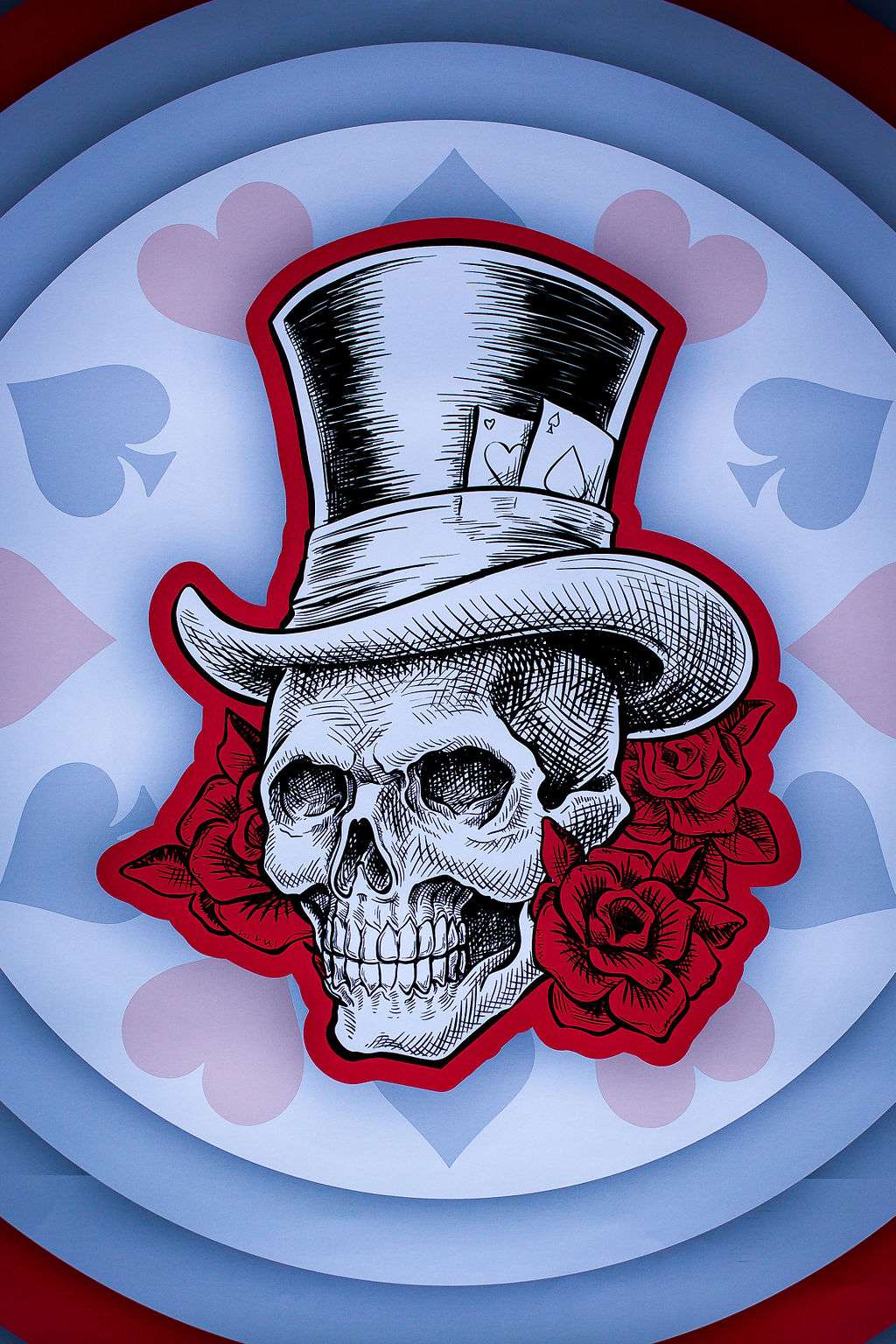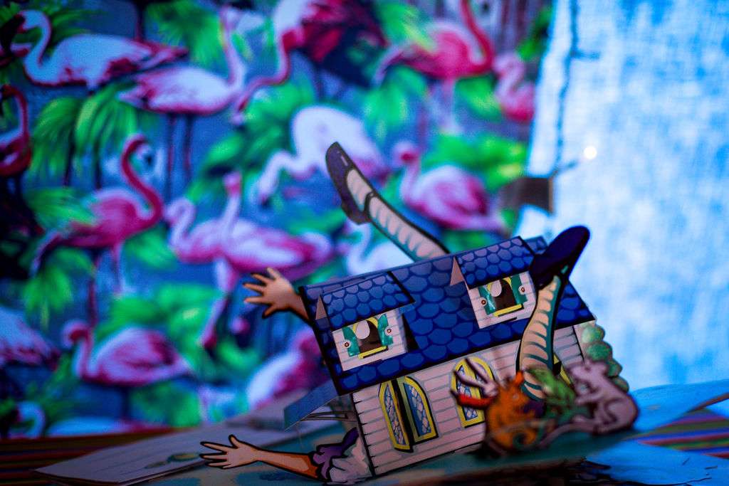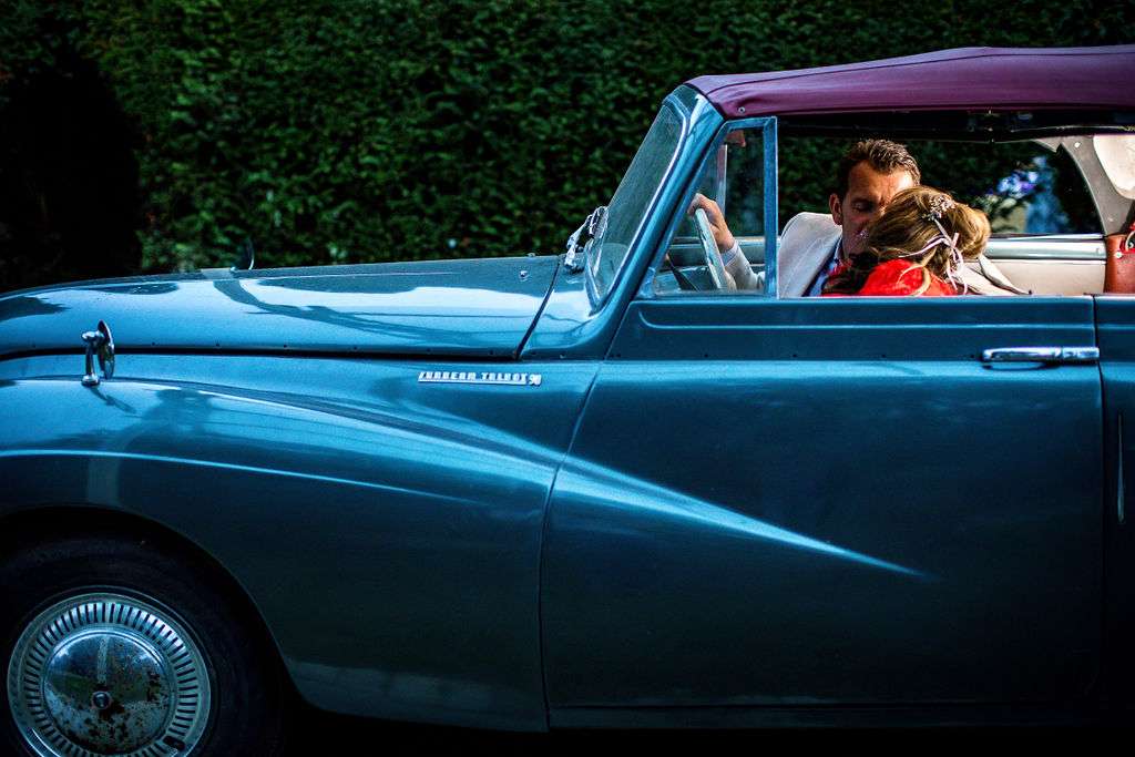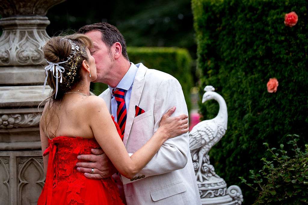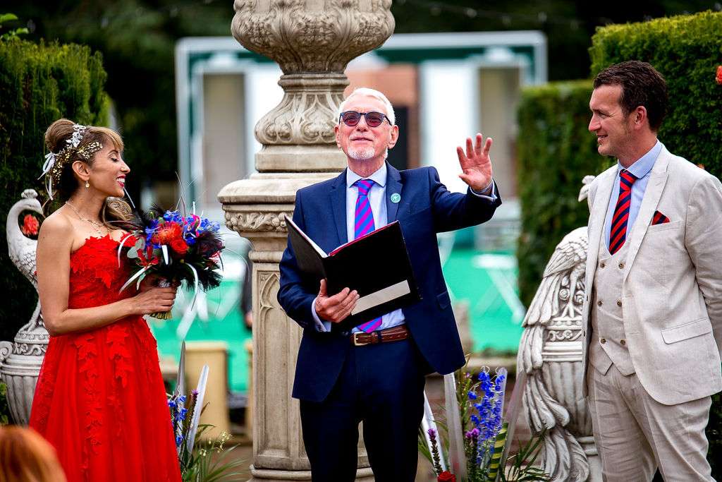 Peter and Vicky, along with friends and family, DIY’d almost all the decorations for their day – including building the stage, decorating the marquee with coloured fabric like a circus tent, and the Alice in Wonderland rabbit hole walkway which the guests entered the wedding through! It was filled with Alice-themed props – little furniture, distorted photos of the couple printed with ‘Everyone’s Mad Here’ and their trip ended with a drinks on a table with ‘Drink Me’ labels. They even had a dressing up table with a light-up mirror, wigs, glittery festival make-up, and fancy-dress costumes – all for the guests to help themselves and wear during the wedding after the ceremony.
