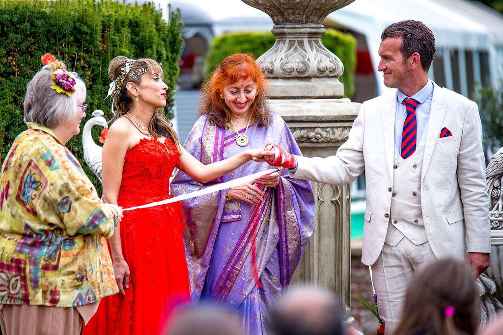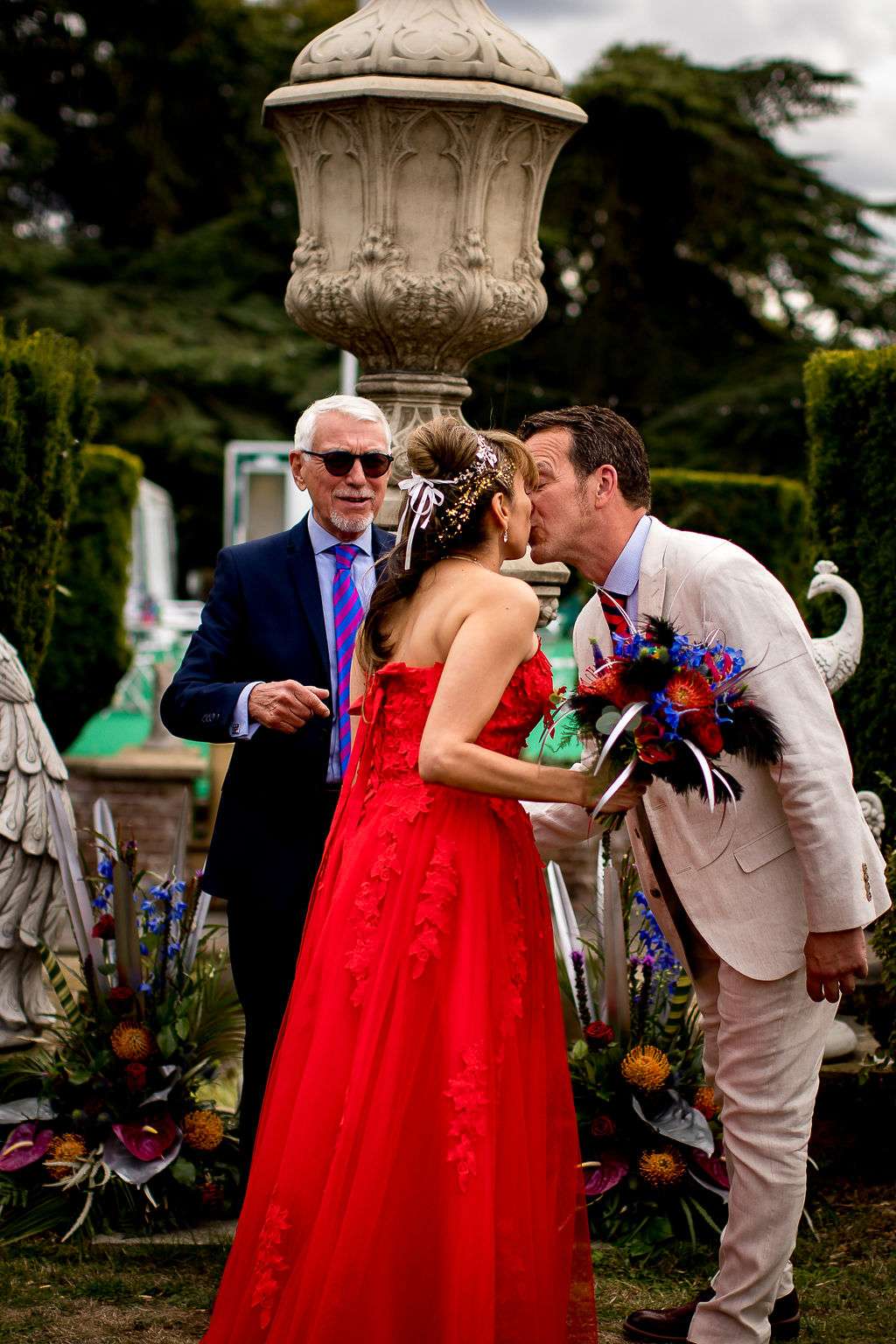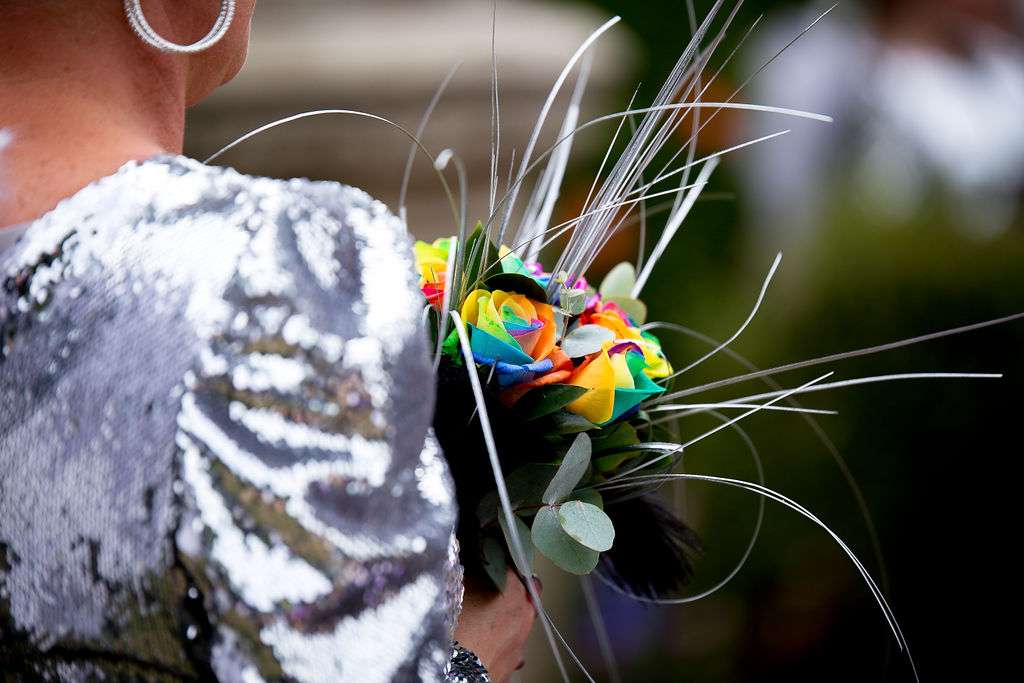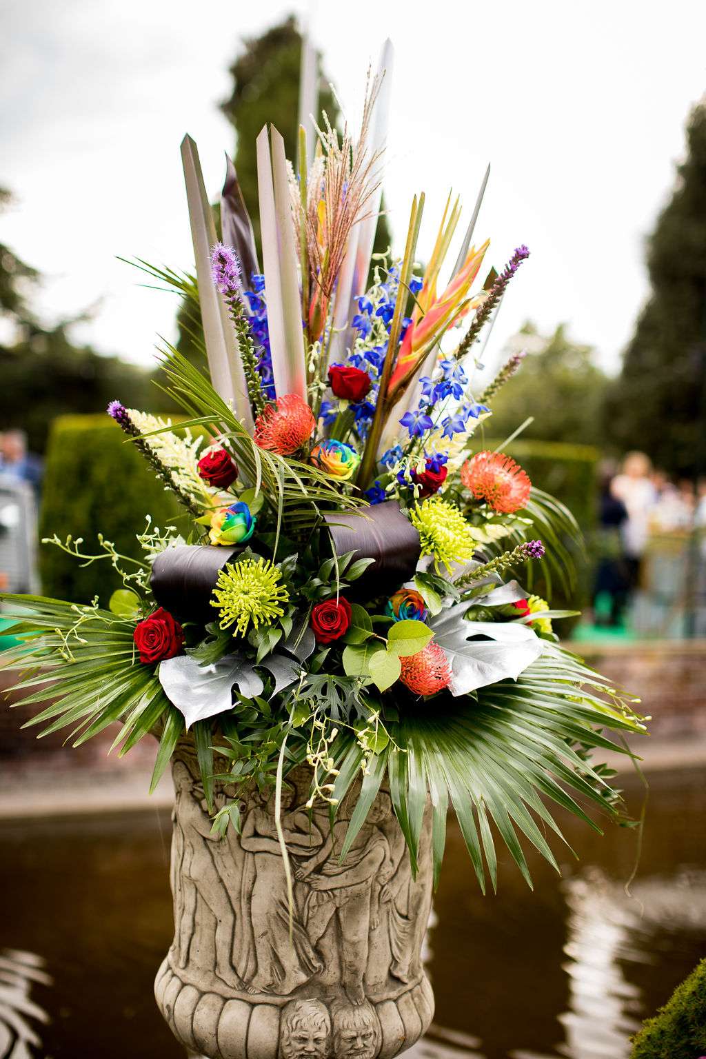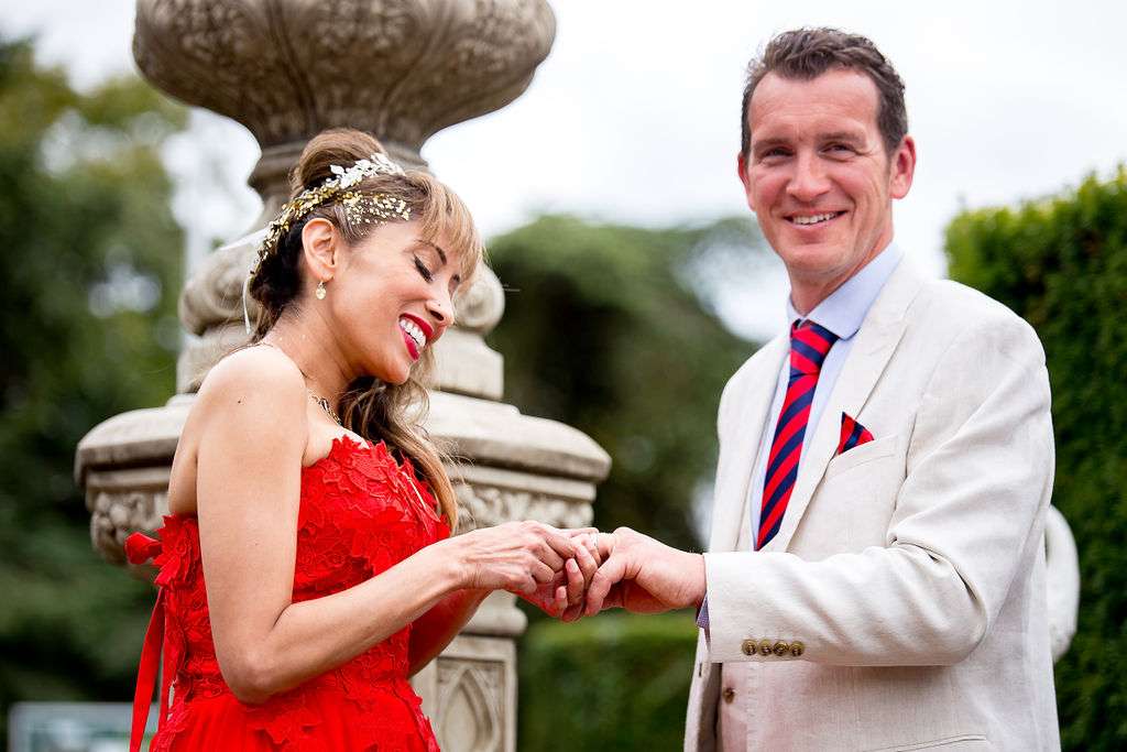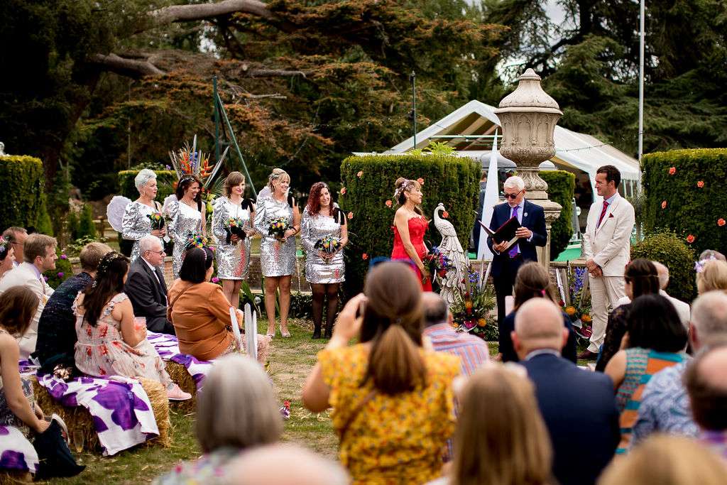 Their ceremony was an outdoor, non-religious, humanist ceremony, that focused on a celebration of love. Their guests sat in a semi-circle on hay bales and blankets. Vicky followed her ten (!) bridesmaids to the makeshift ceremony area that was decorated with large floral arrangements, ornamental urns and silver feathers. The celebrant talked about love, vows were exchanged, a hand-fasting ceremony was done (where two relatives of the bride and groom tie multicoloured ribbons around their hands), then the rings were passed round the audience to be blessed by them all before being returned to the bride and groom and exchanged. They then partied the night away in their weird and wonderful Alice-themed party.