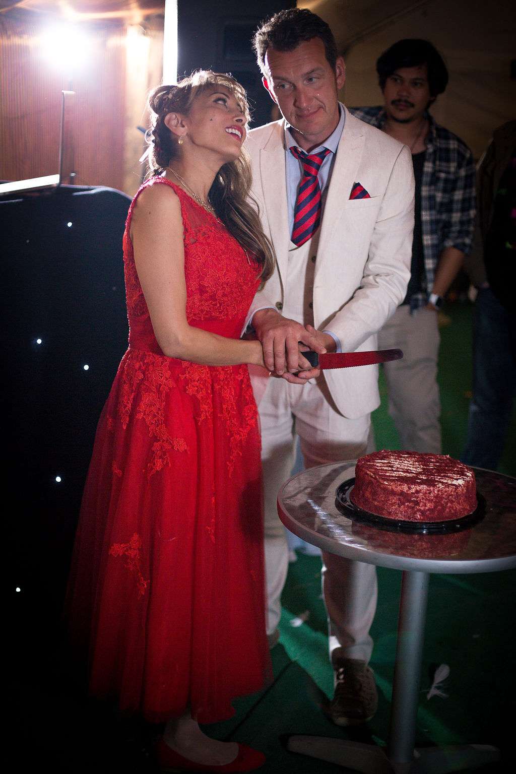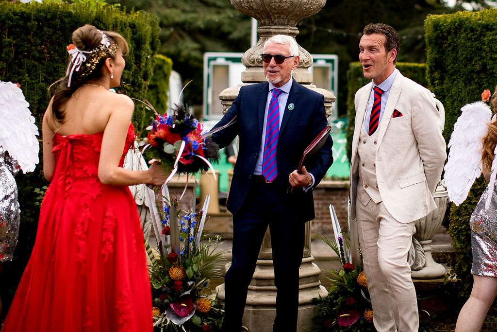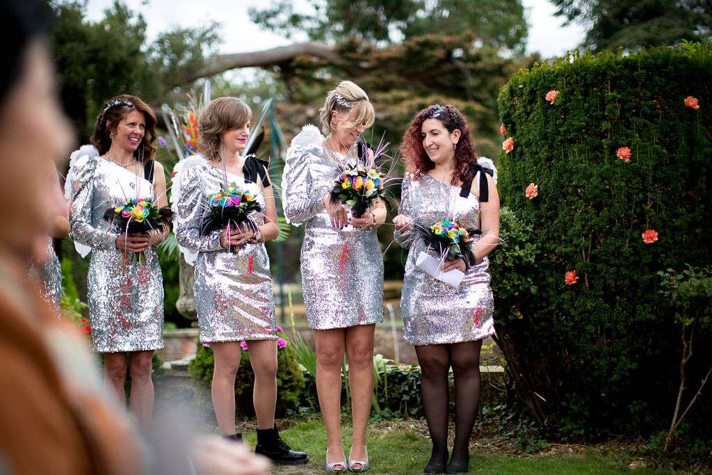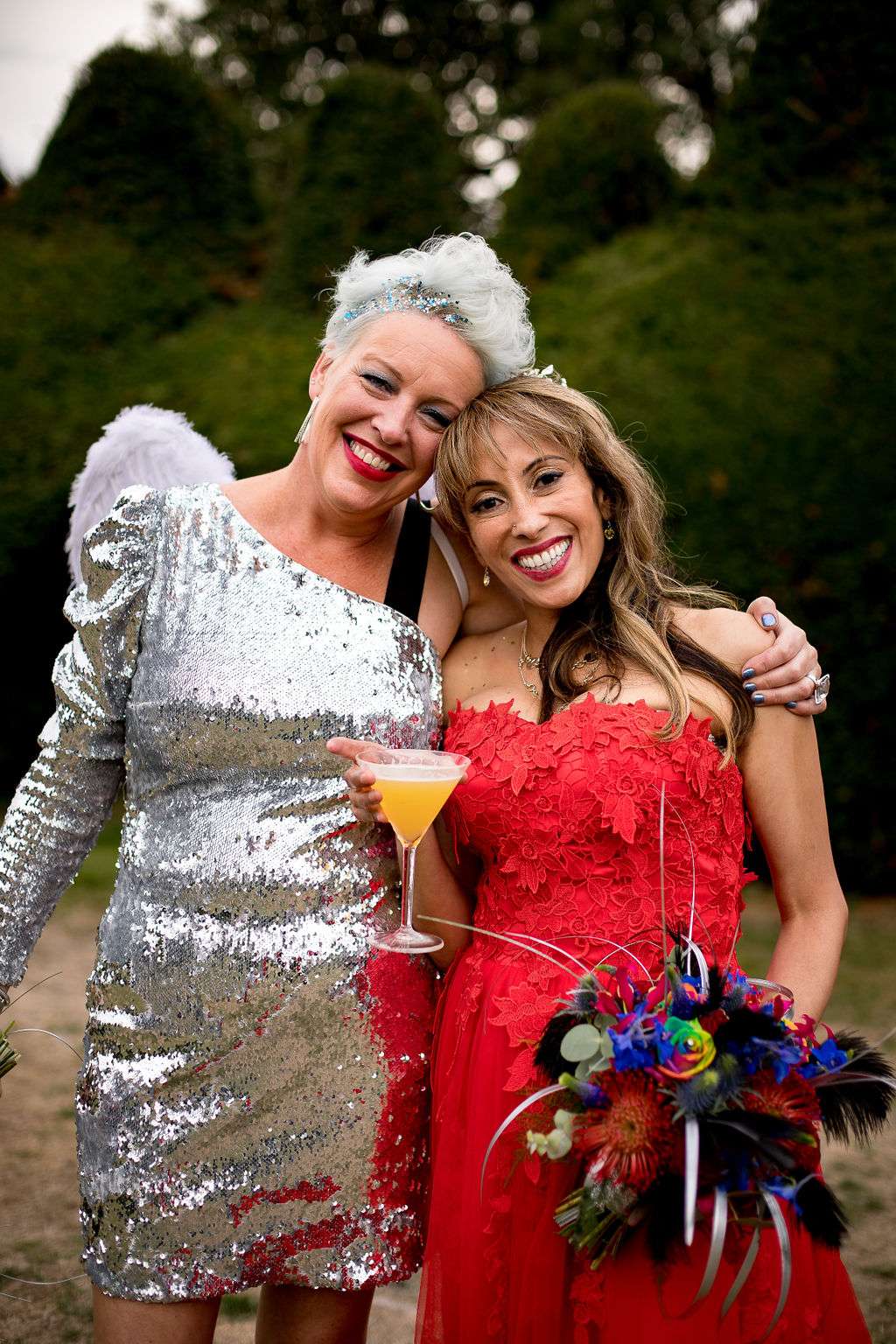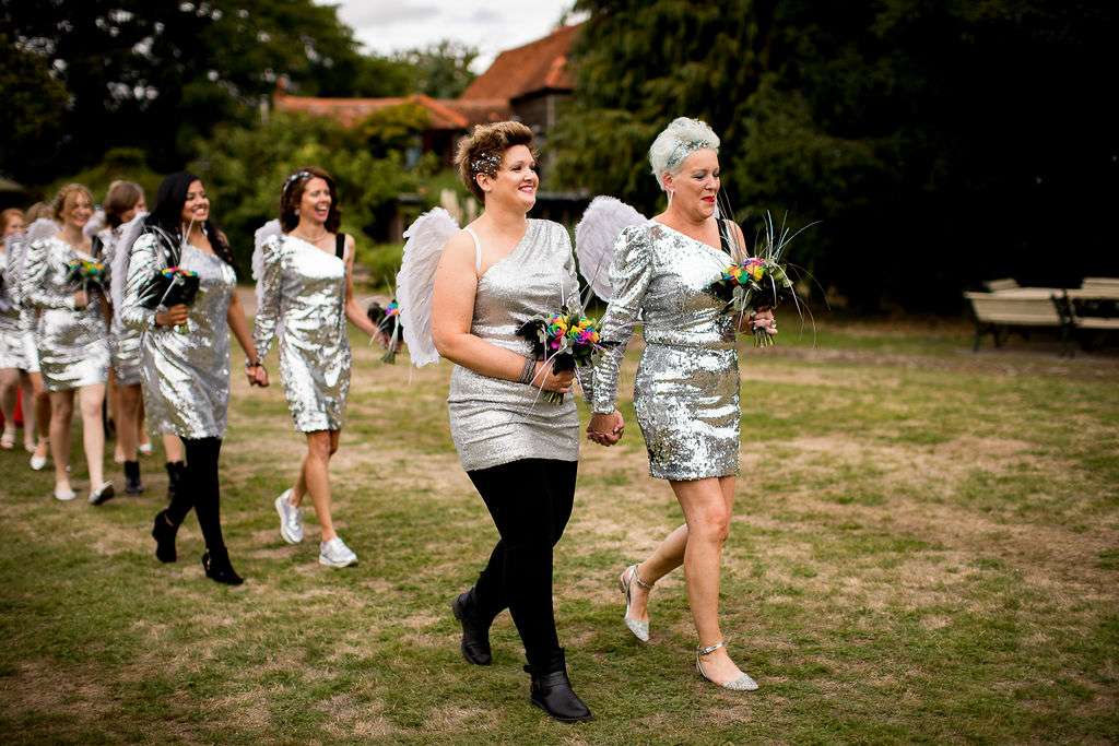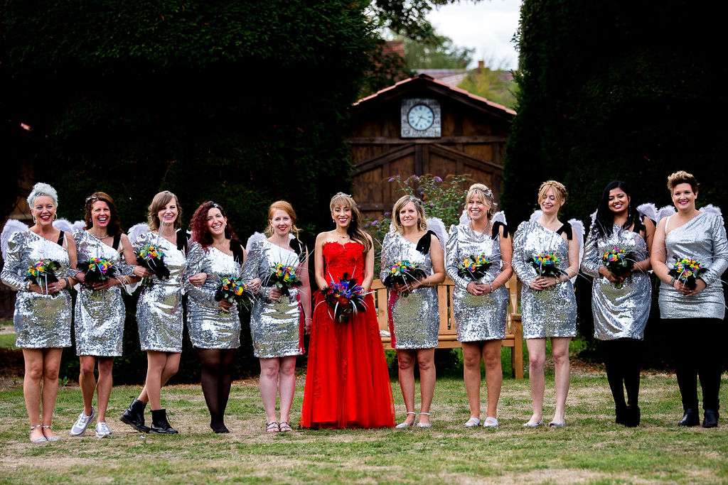 Vicky treated herself to two wedding dresses – both found online, the first; a long, strapless bright red number for the ceremony, and then a 3/4 length short-sleeved one which she sewed 100 fairy lights into! The bridesmaids all wore one-shouldered silver sequin mini dresses and white feathered angel wings, and all were accessorised with festival ready hair and body glitter.