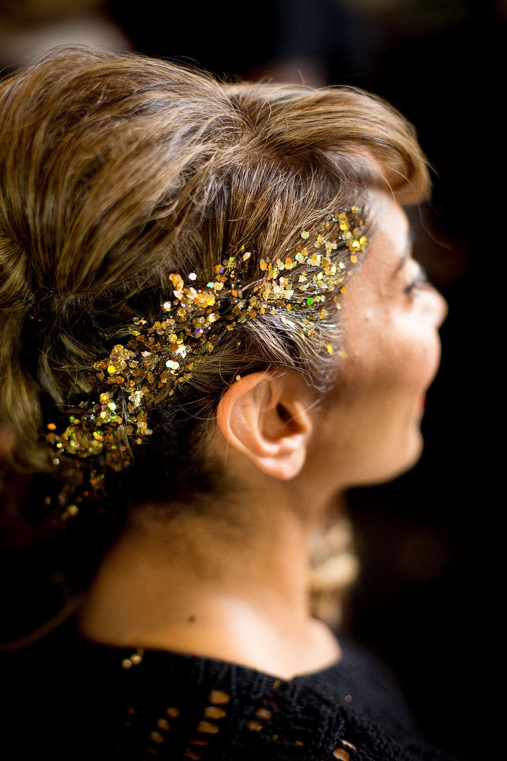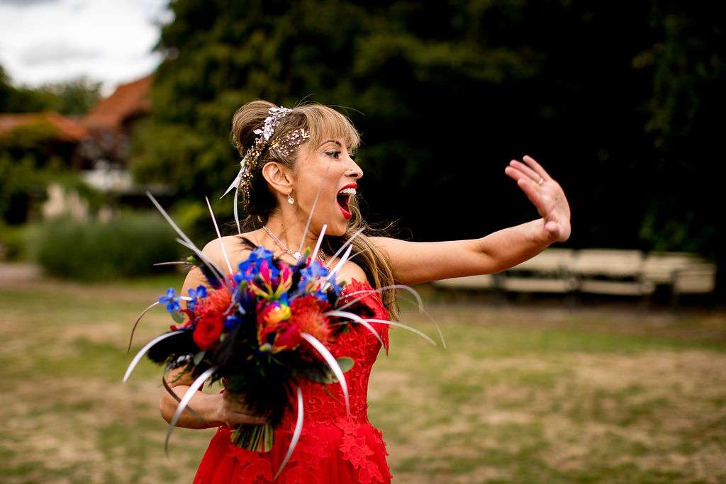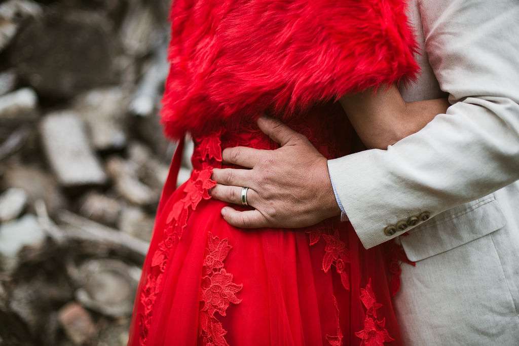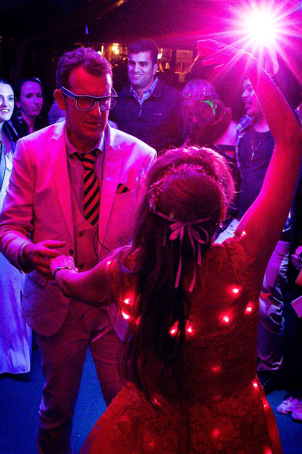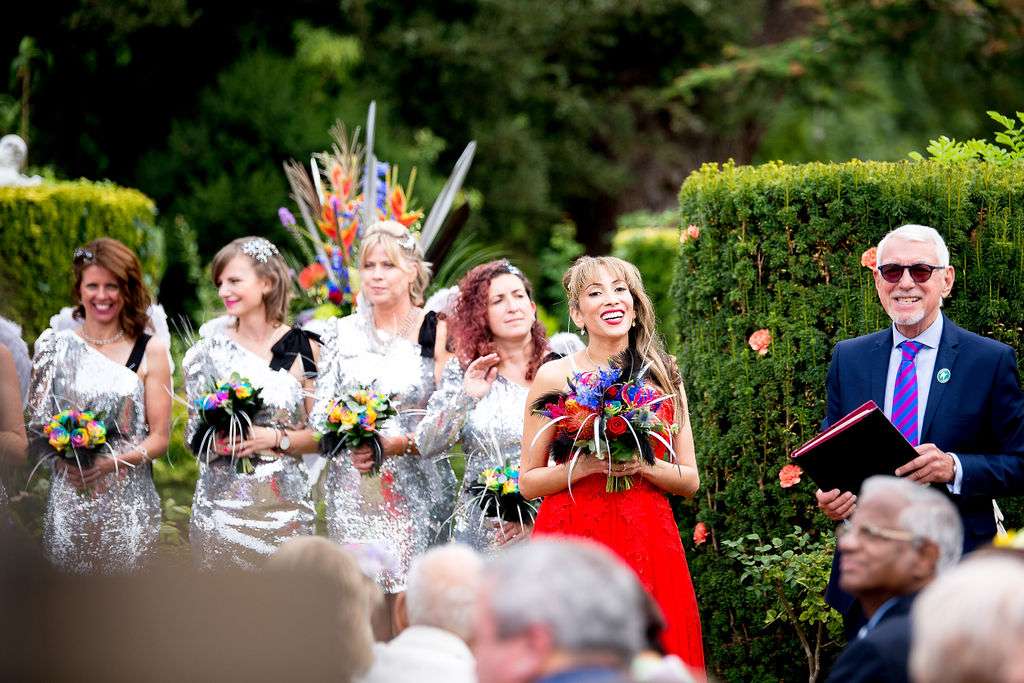 Vicky treated herself to two wedding dresses – both found online, the first; a long, strapless bright red number for the ceremony, and then a 3/4 length short-sleeved one which she sewed 100 fairy lights into! The bridesmaids all wore one-shouldered silver sequin mini dresses and white feathered angel wings, and all were accessorised with festival ready hair and body glitter.
