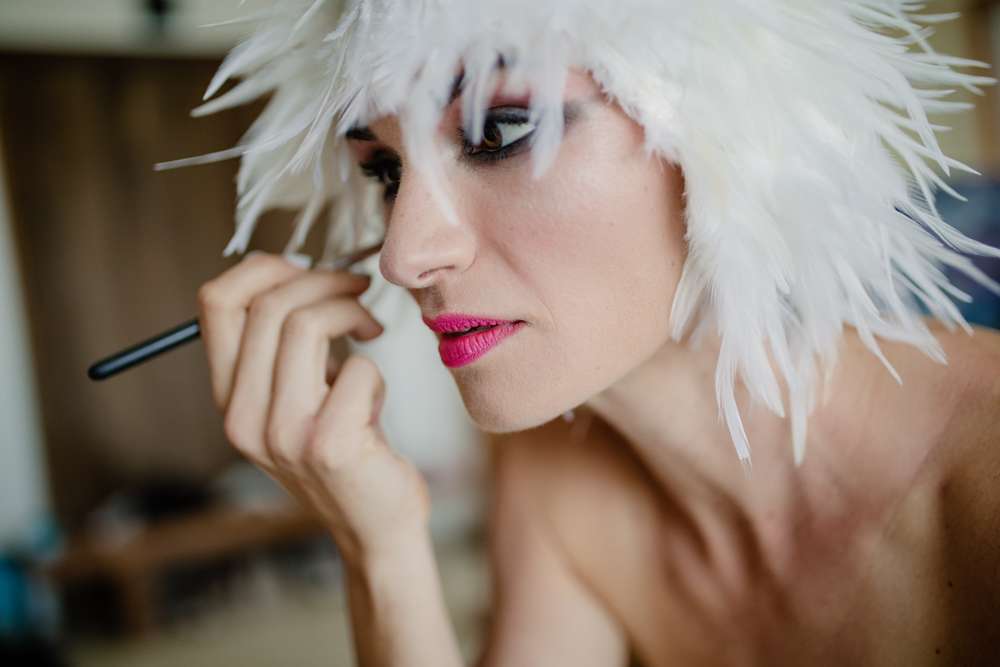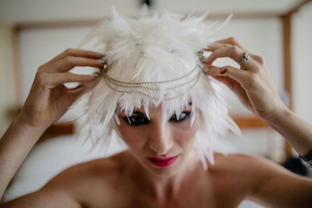 The bride’s incredible two-piece outfit consisted of a skirt and top worn with a feather hat and Jimmy Choo moonstone suede pump with a faux fur ankle. She changed into a shorter skirt for the ceremony. Her outfit was such an important part of the day to her, and getting it just right was one of her biggest sources of anxiety in the run up. “I didn’t want just any dress”, she explained, “I have a pension for design and have strong opinions about the desire for a leather wedding dress… I worked for over a year with a very talented designer in the Ukraine, Olena Molchenova, who I found on Etsy.”