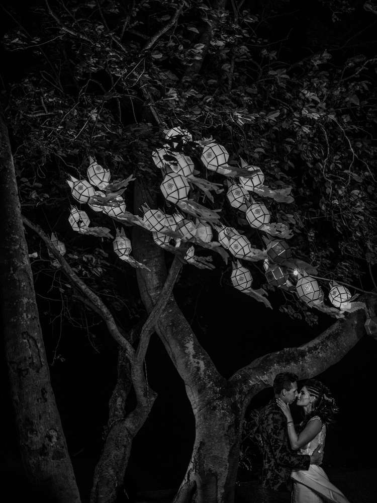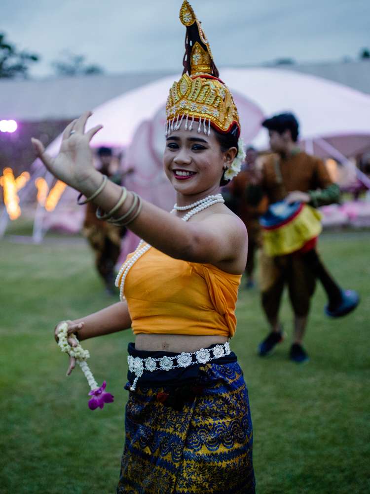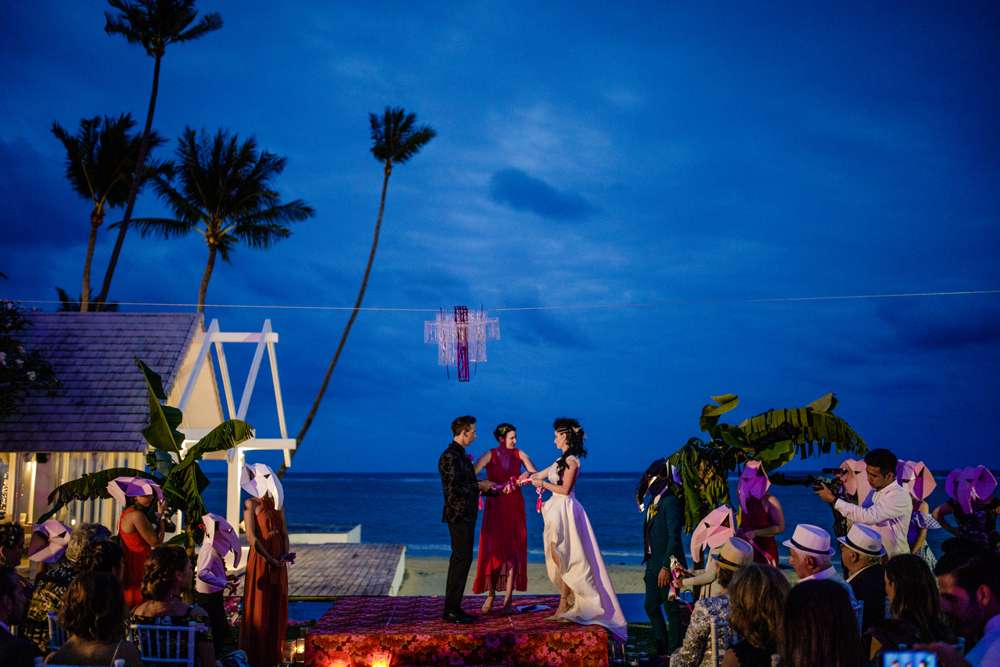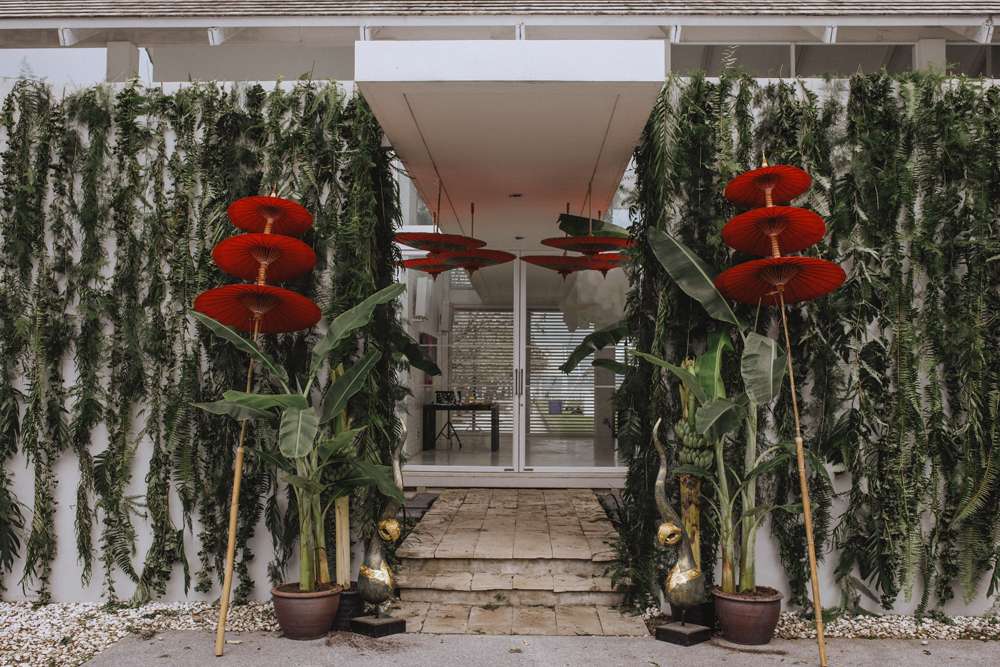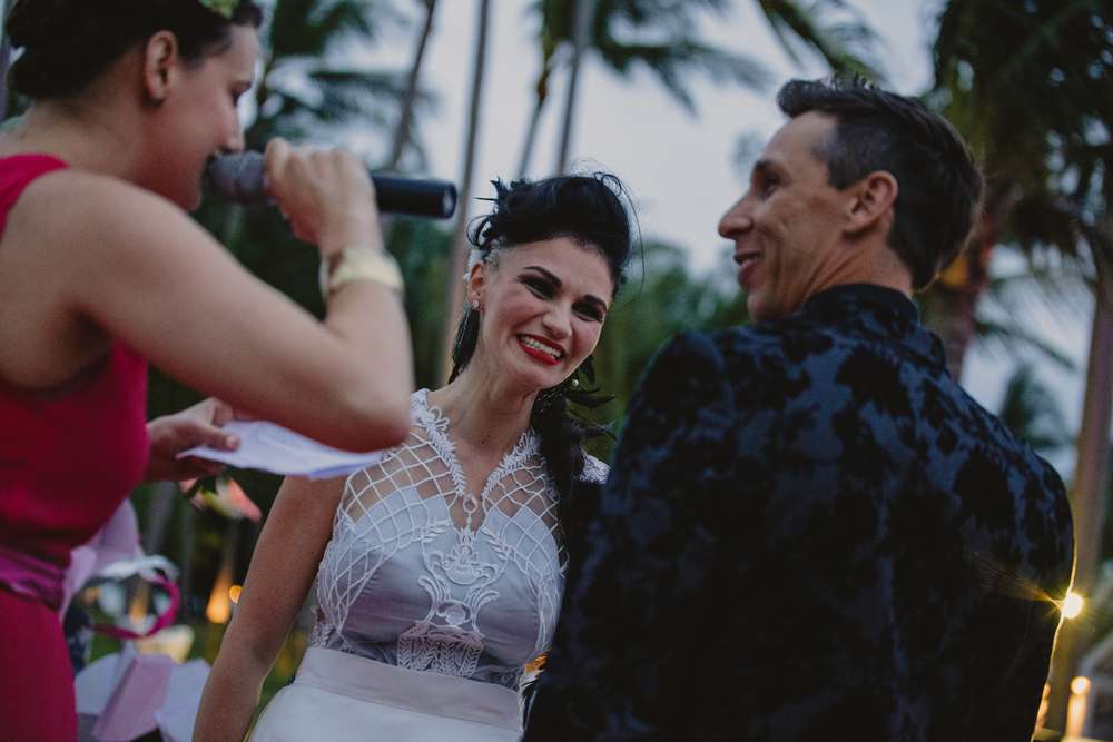The dinner reception that followed their ceremony was was jet-black with fish bowls and bubble decor. “It was totally Rock n Roll and unforgettable in every way!” she continued. “We decorated with banana trees and bananas in my bouquet, used colour-blocking as a theme and had an amazing white balloon installation filled entry. Guests were greeted by traditional Thai dancers who later performed what I like to call a ‘moon-dance’.”