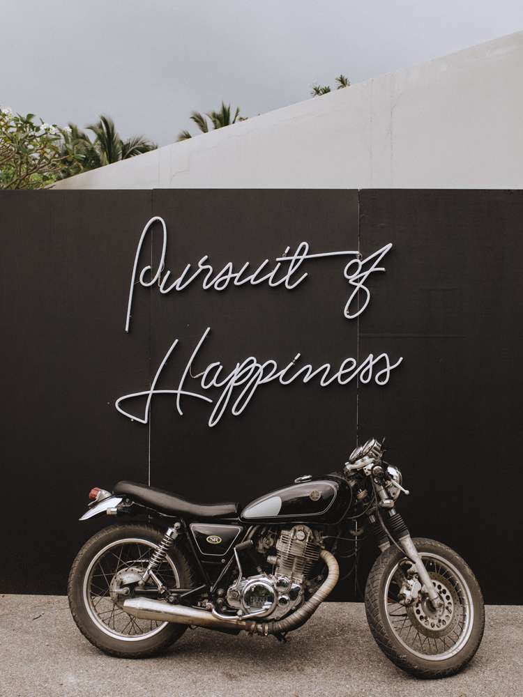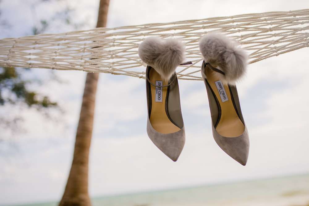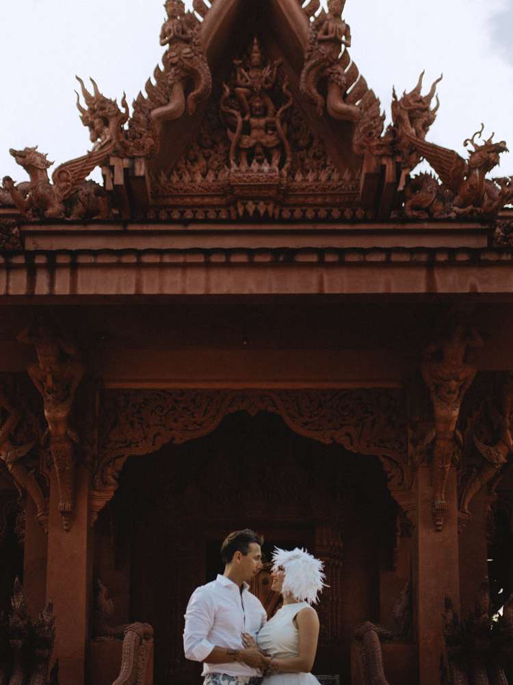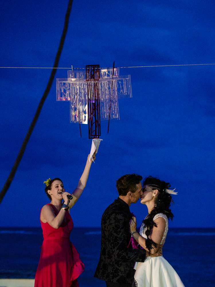 The dinner reception that followed their ceremony was was jet-black with fish bowls and bubble decor. “It was totally Rock n Roll and unforgettable in every way!” she continued. “We decorated with banana trees and bananas in my bouquet, used colour-blocking as a theme and had an amazing white balloon installation filled entry. Guests were greeted by traditional Thai dancers who later performed what I like to call a ‘moon-dance’.”