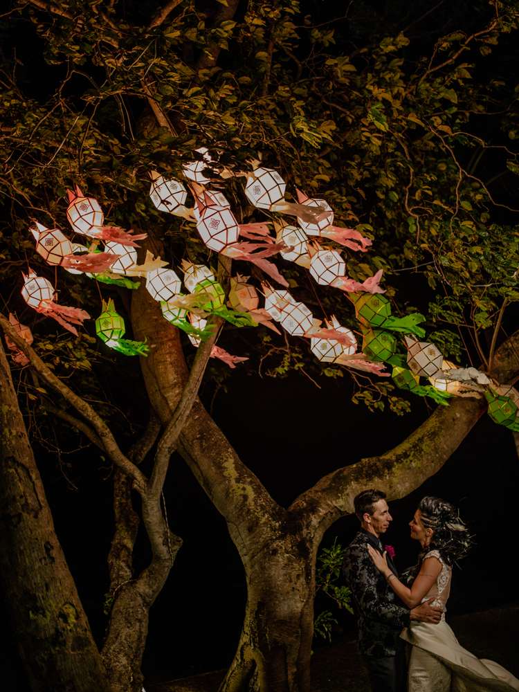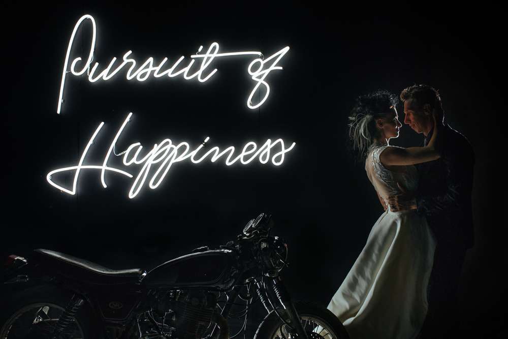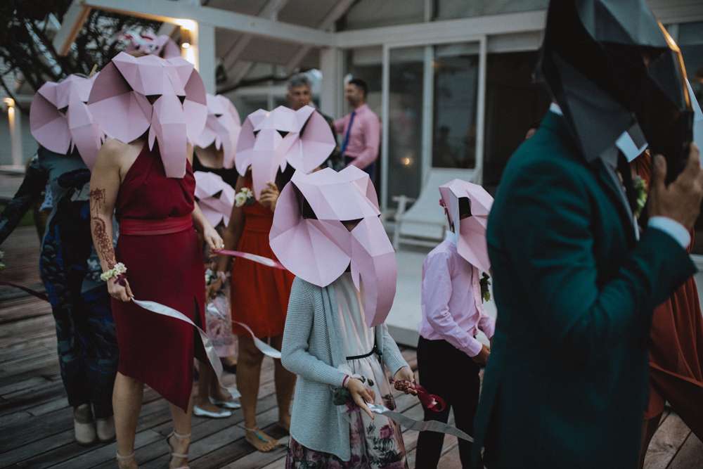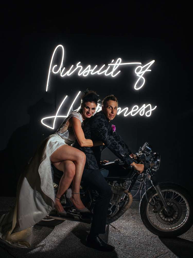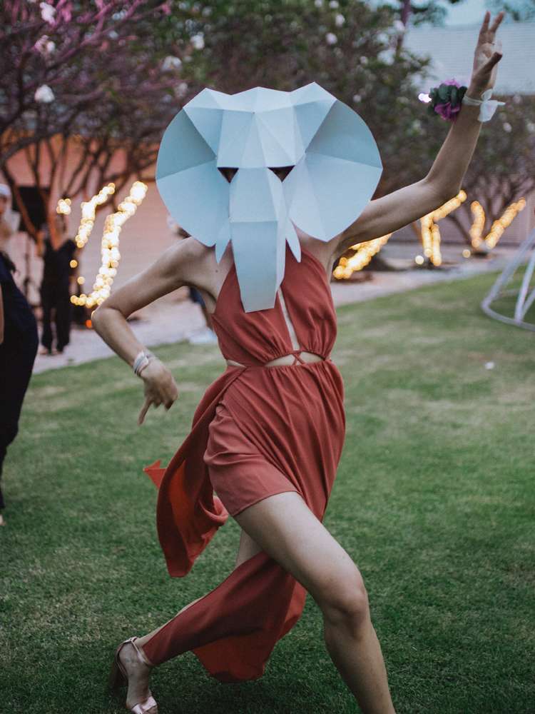 As motorcycle-loving visual artists living in Laguna Beach, Dana and Michael didn’t want anything traditional for their December wedding. Inspired by Burning Man, they decided to fly to Thailand to have the non-traditional wedding of their dreams – complete with the bridal party in paper elephant heads!