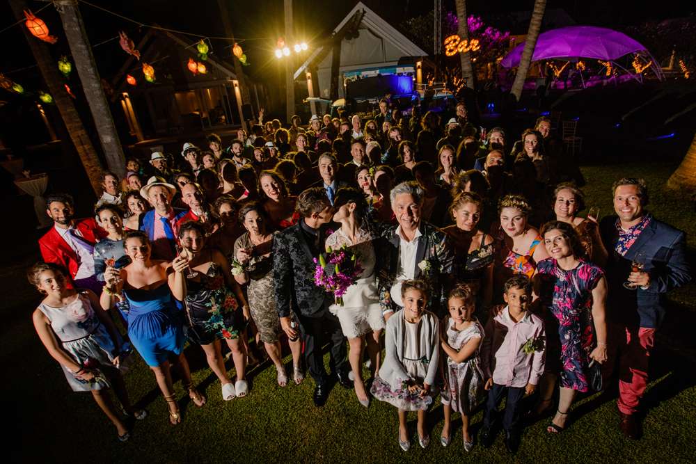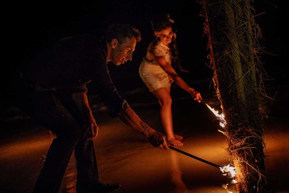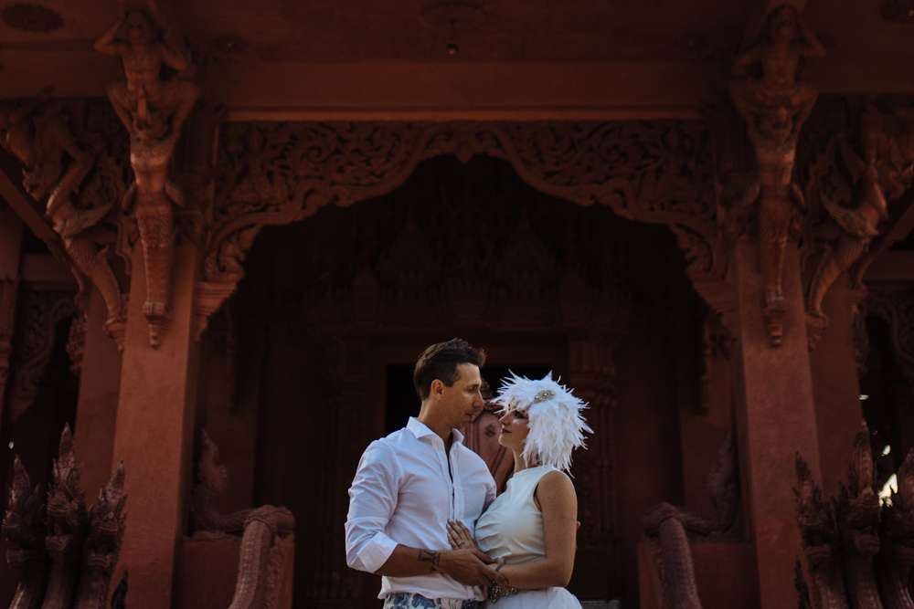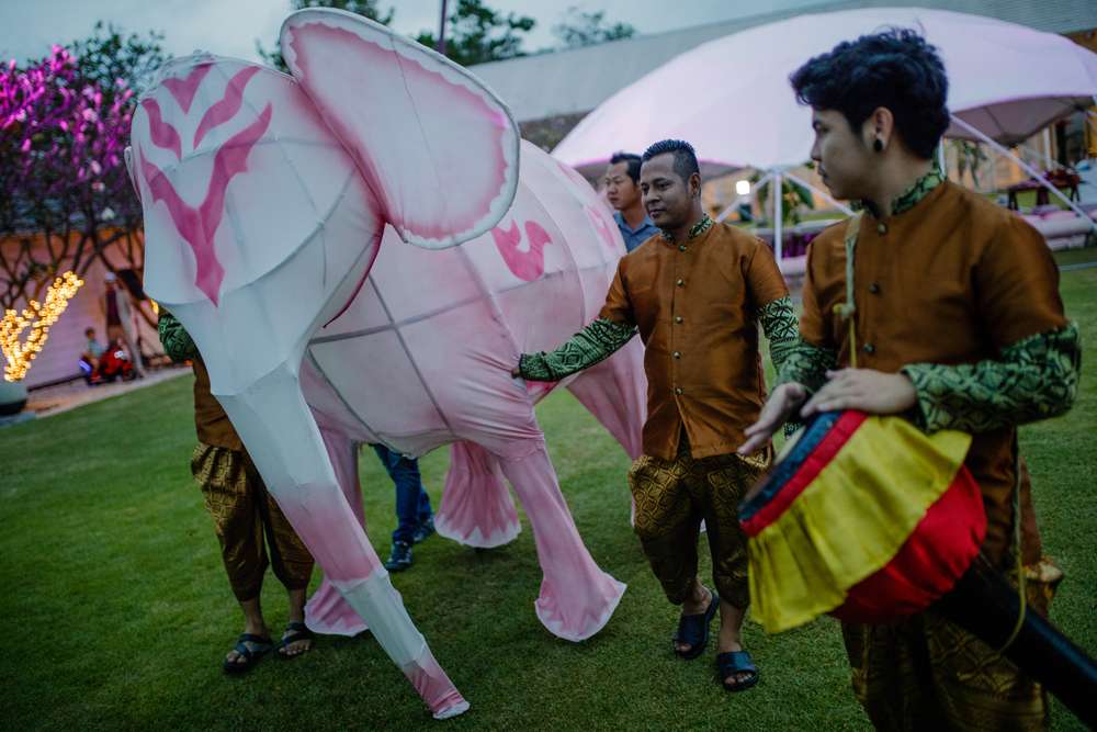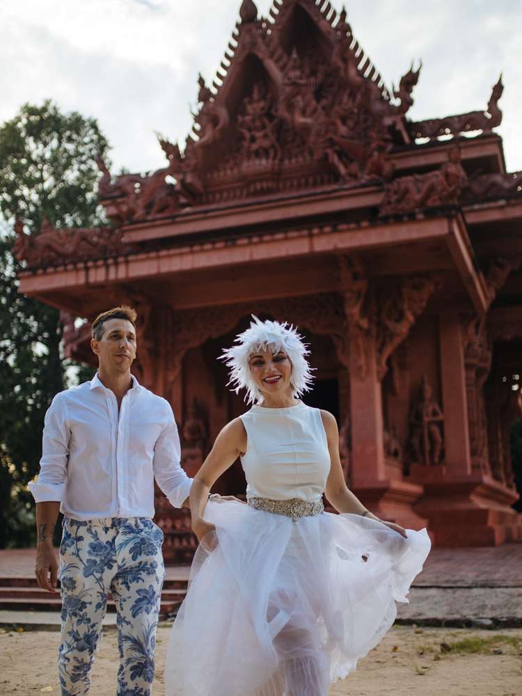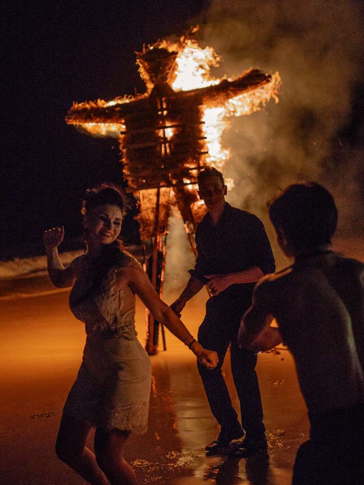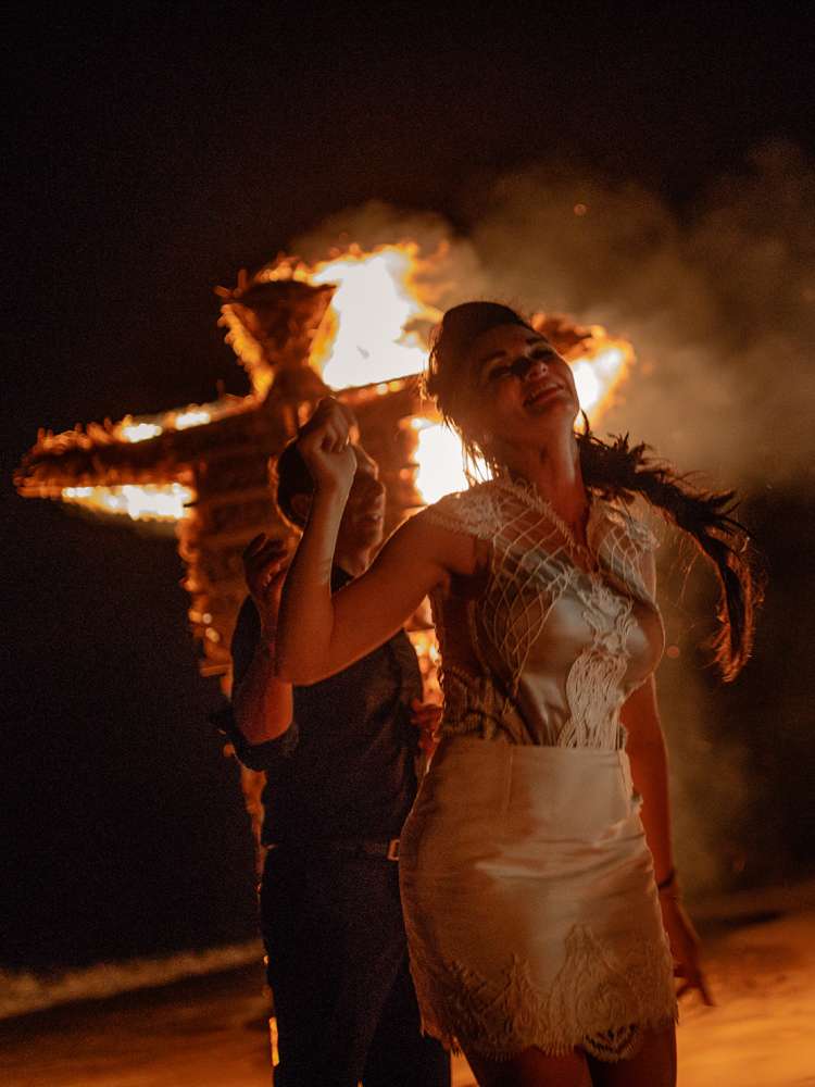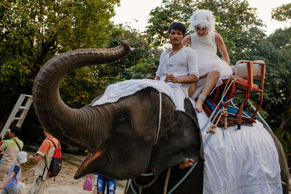 “We wanted to take the opportunity to invite all our loved ones across the world to Koh Samui, Thailand”, Dana explained, “bringing them outside of their comfort zone in hopes of inspiring them, in much the same way that Burning Man inspires us each year. We incorporated details from our story together. Our wild three-day festival of events included ice-breakers across aquamarine waters, an all-white party with an elephant entrance, and the wedding where we asked all our loved ones to be our flowers (dress in floral pattern rather than making more trash) and participate in a Burning Man ritual to help us burn away the fears and hardships of the past, celebrate the now, and walk into the future together.”