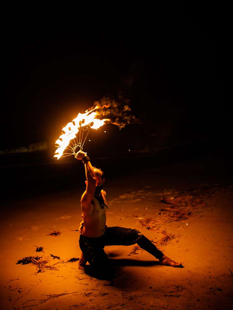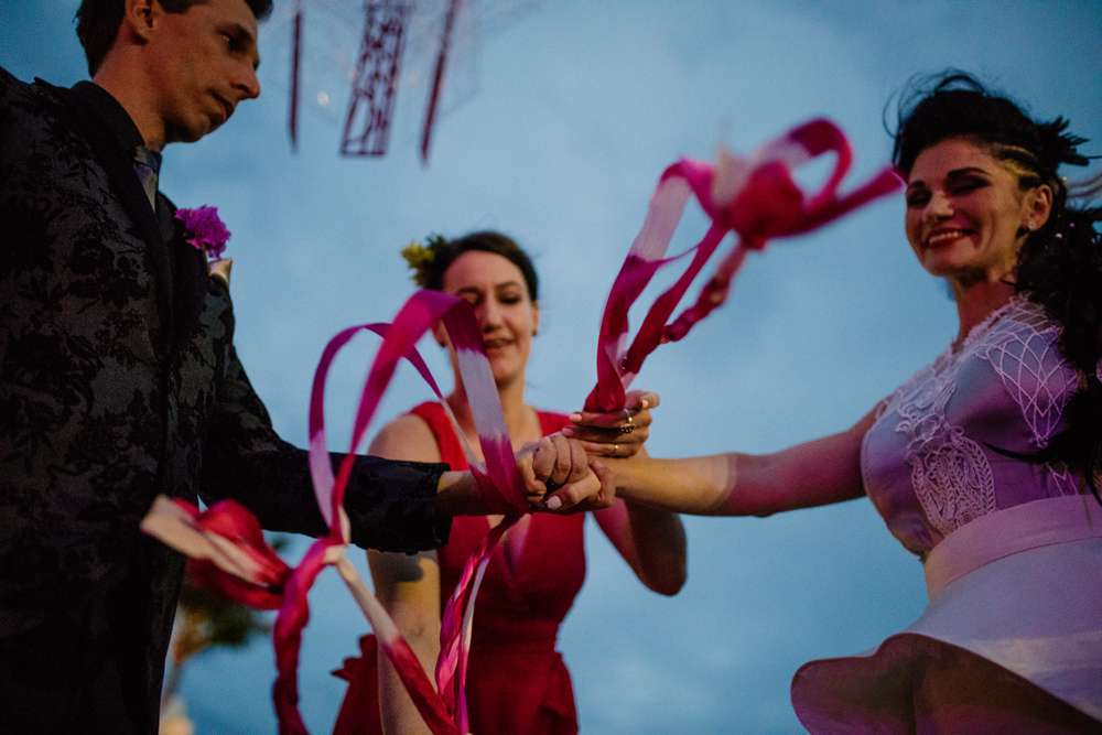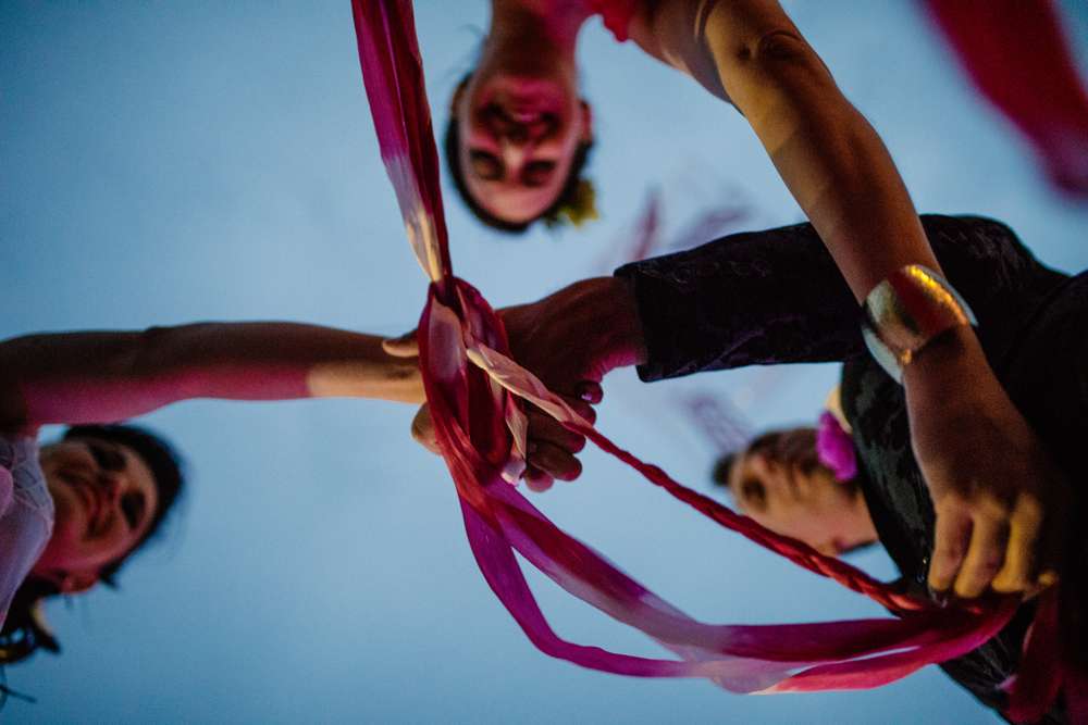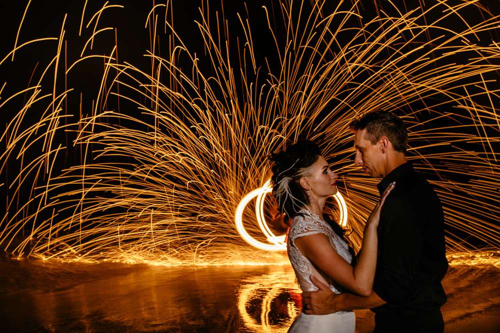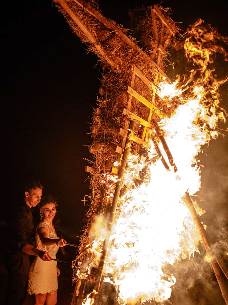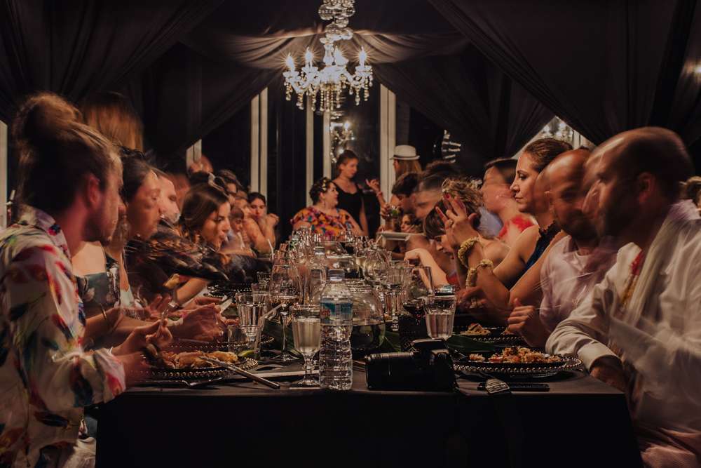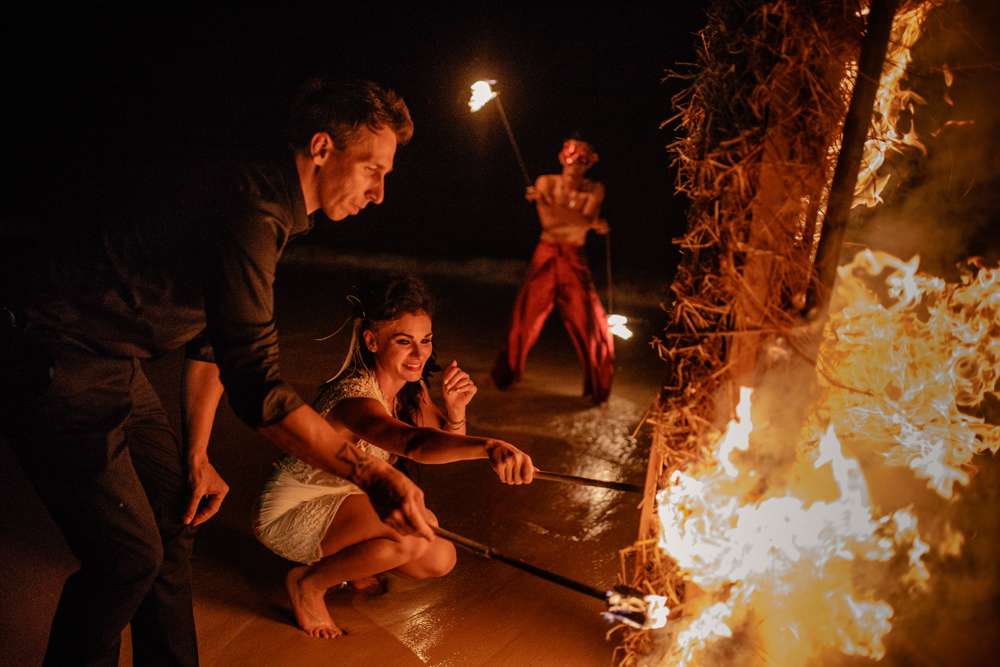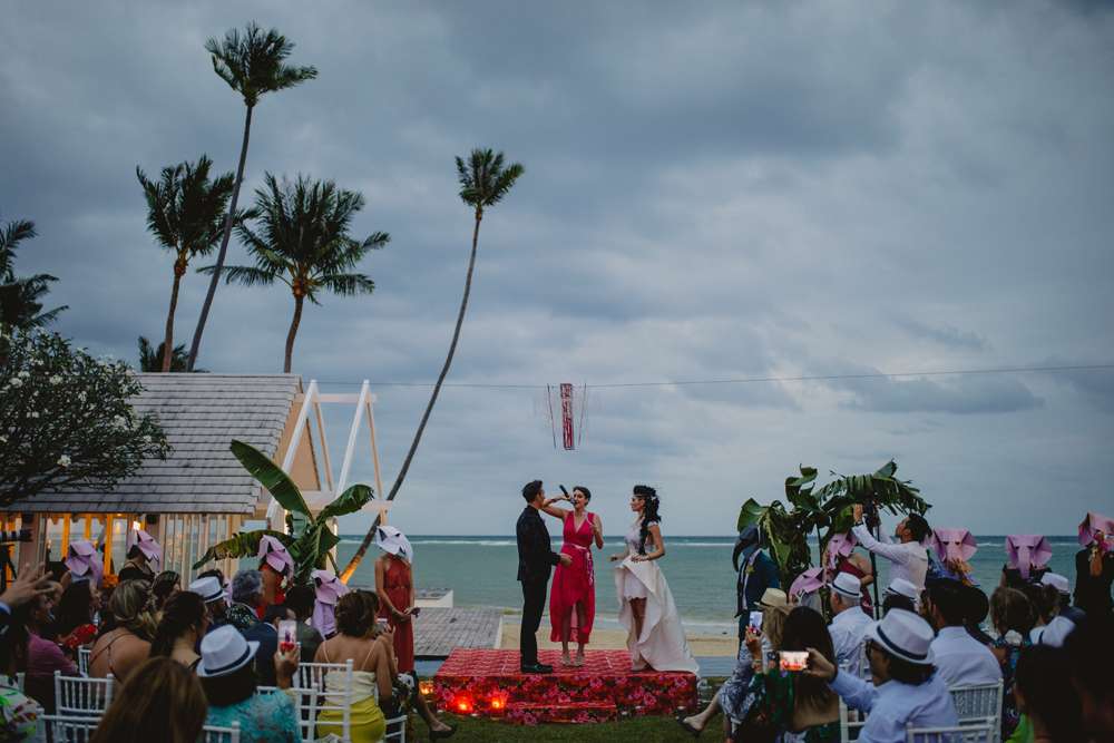 “We wanted to take the opportunity to invite all our loved ones across the world to Koh Samui, Thailand”, Dana explained, “bringing them outside of their comfort zone in hopes of inspiring them, in much the same way that Burning Man inspires us each year. We incorporated details from our story together. Our wild three-day festival of events included ice-breakers across aquamarine waters, an all-white party with an elephant entrance, and the wedding where we asked all our loved ones to be our flowers (dress in floral pattern rather than making more trash) and participate in a Burning Man ritual to help us burn away the fears and hardships of the past, celebrate the now, and walk into the future together.”
