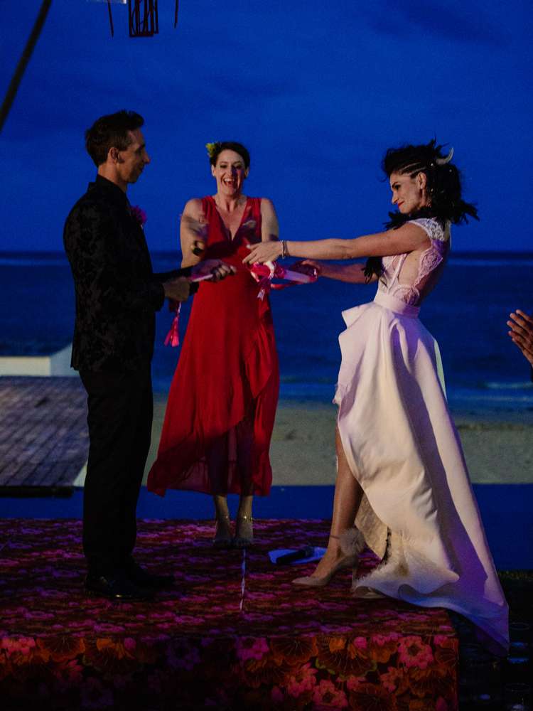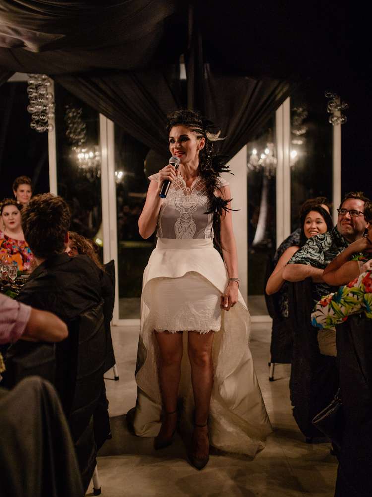 “When my dress arrived I wasn’t happy with how the pieces fit me when worn together, however I loved the pieces separately and basically rearranged them to create 1.5 dresses! One that I wore for the white party and one for the ceremony the next day. I bought a second skirt for the ceremony from Carmen Popa of A Bride By Samantha, it was a short skirt with an cape/ over-skirt at the back.”