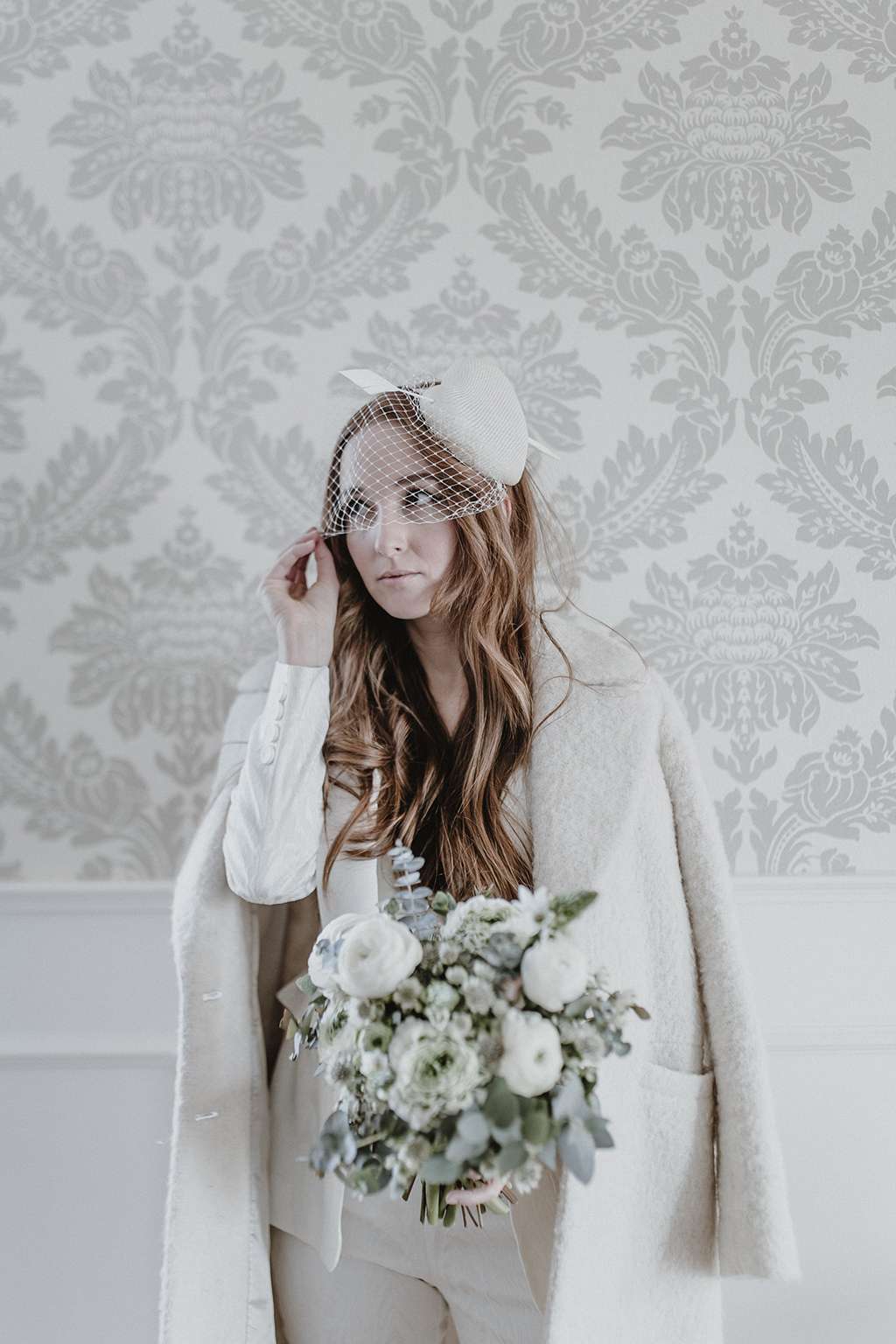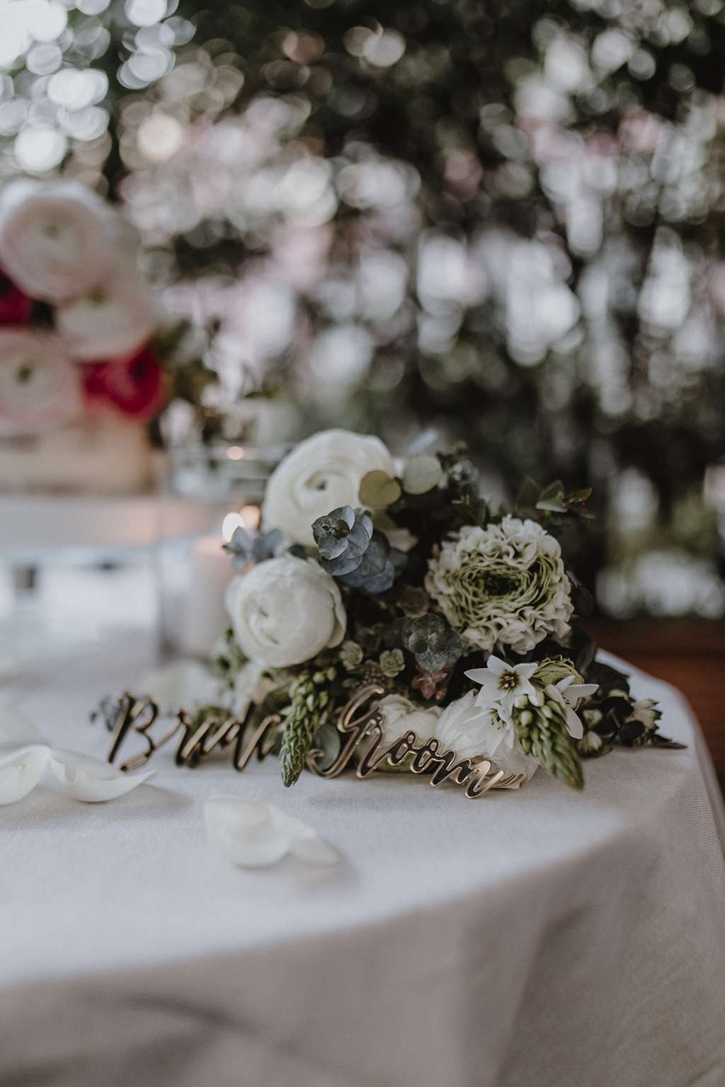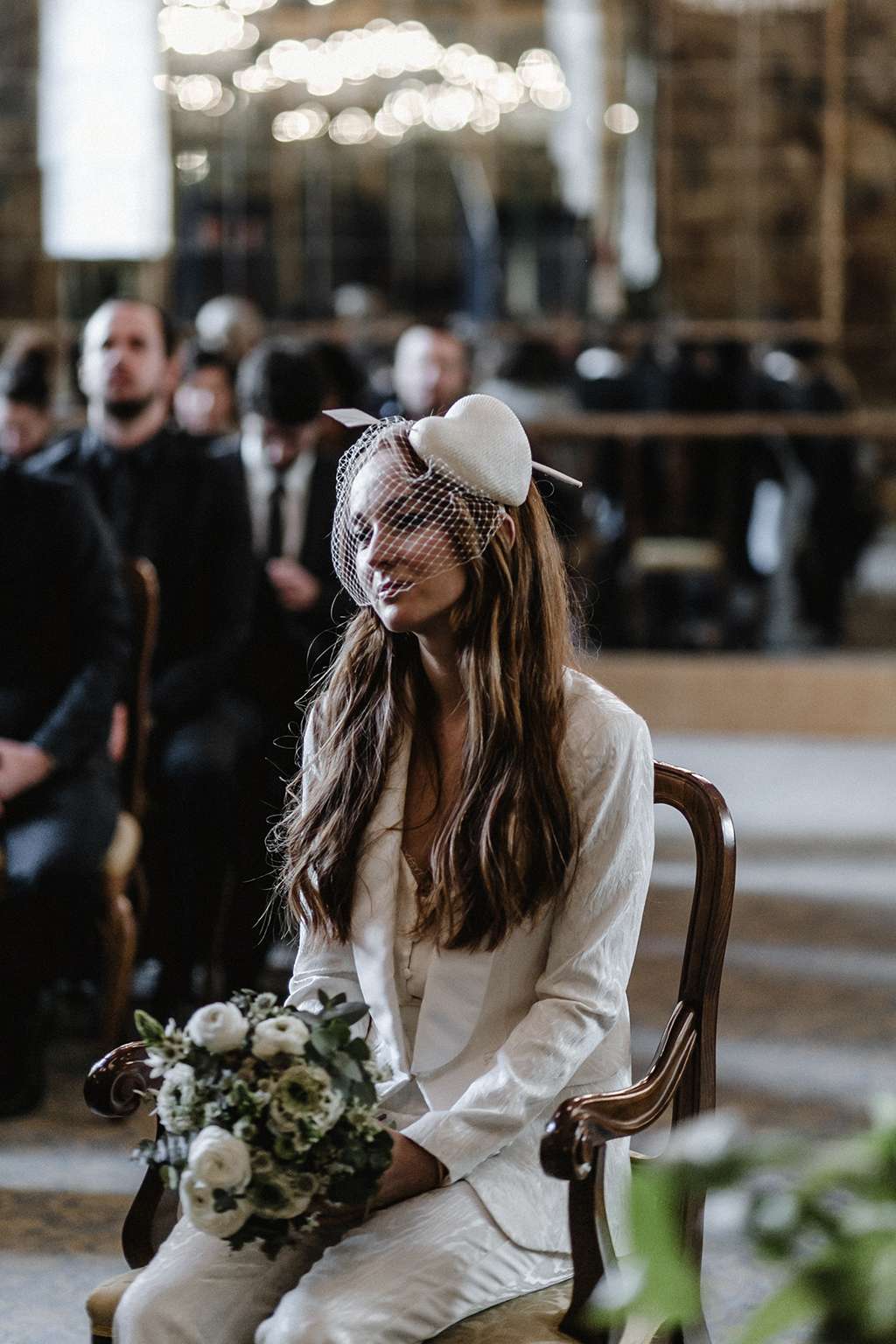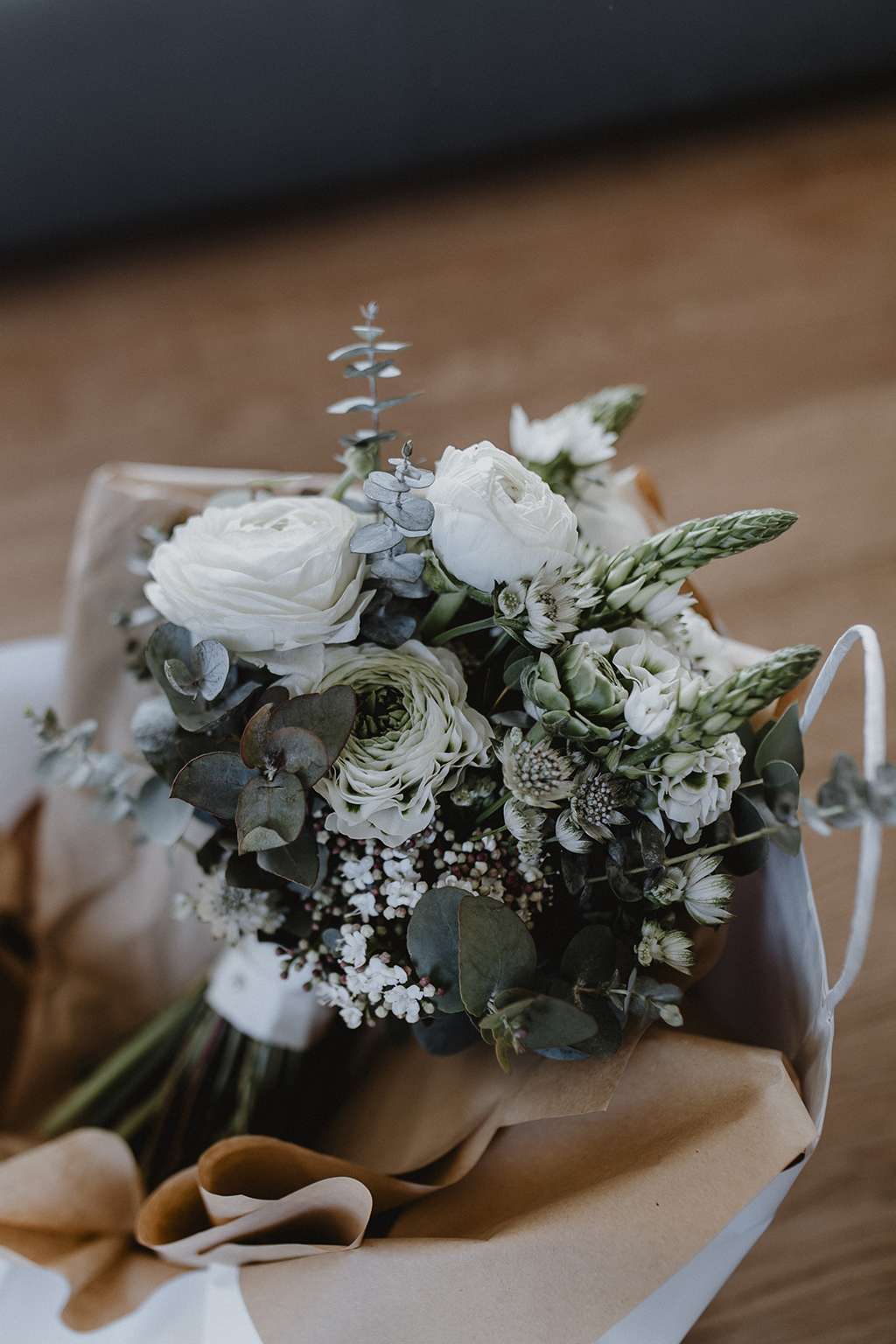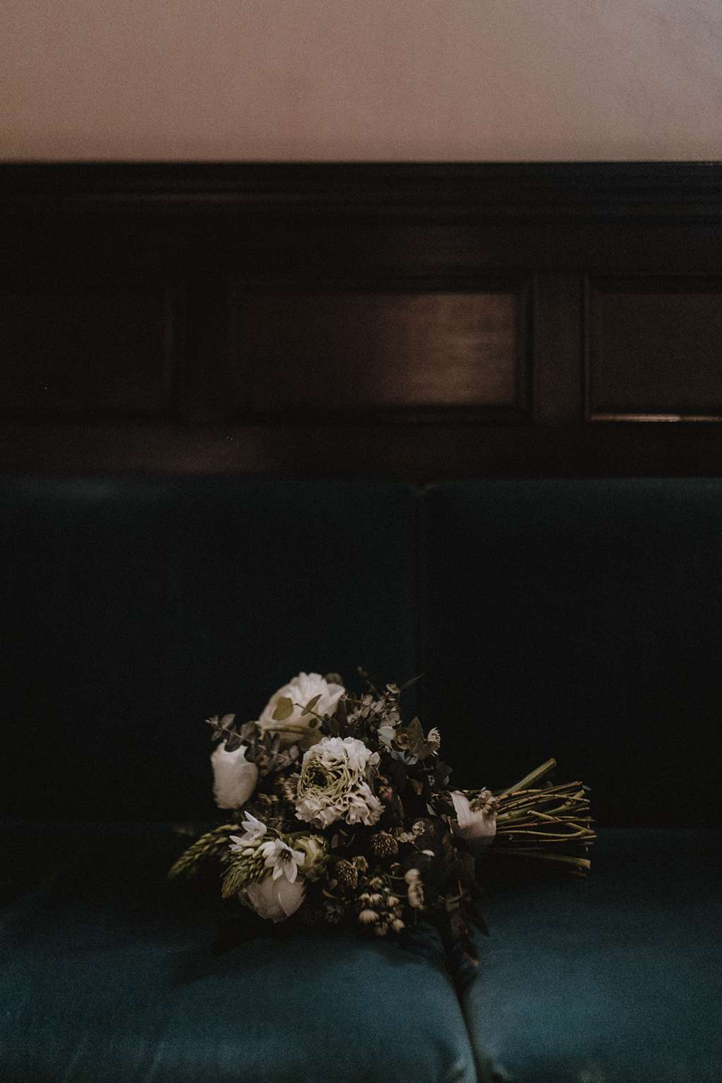 Antoinette was almost going to have a go at making her own bouquet, instead made a last-minute decision to go with George to a small alternative flower boutique and pick one together. It ended up being a very modern piece with white and green Ranunculus and winter field flowers. “After all the craziness in the lead up to the day, it was a lovely thing for the two of us to do together.”