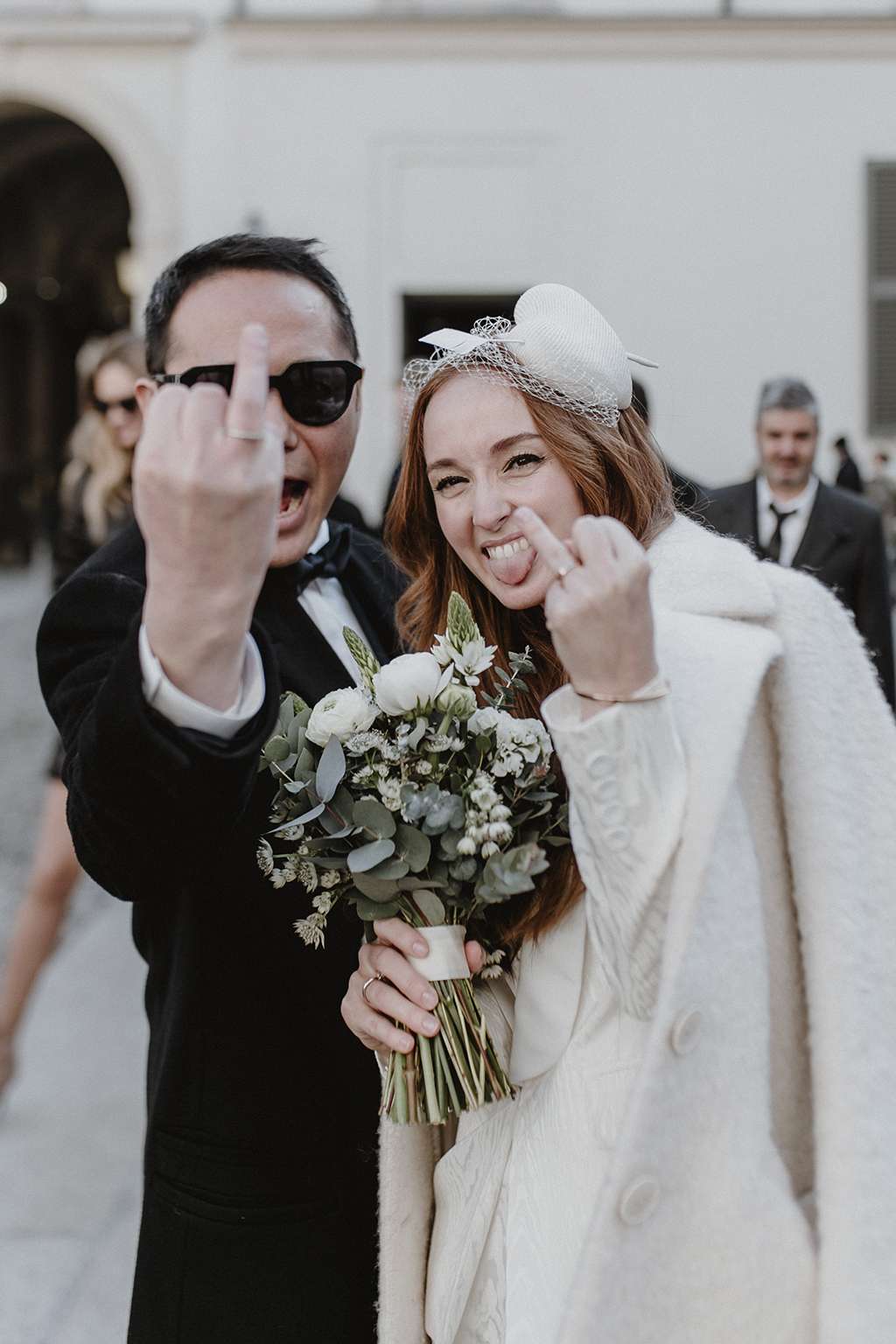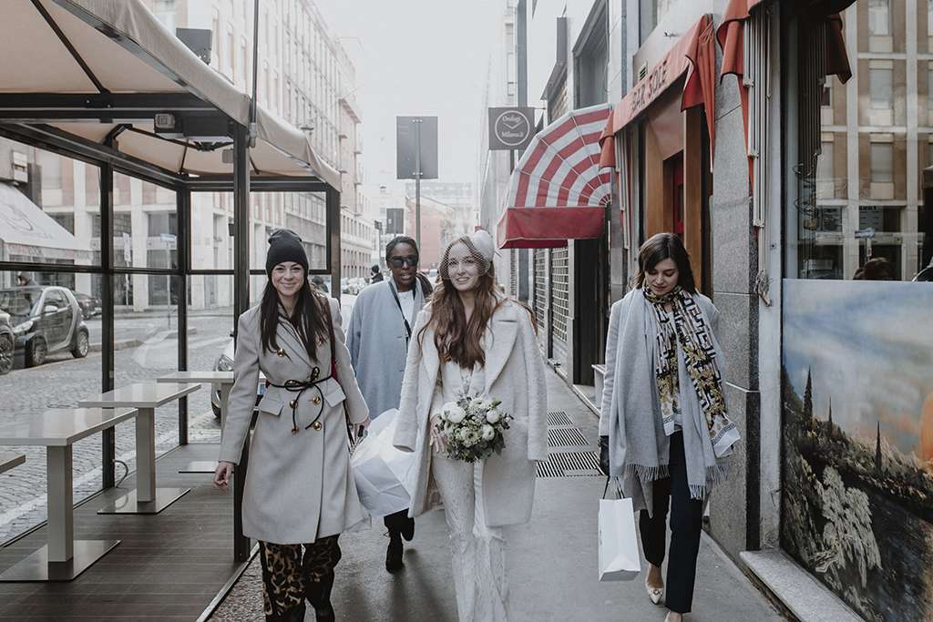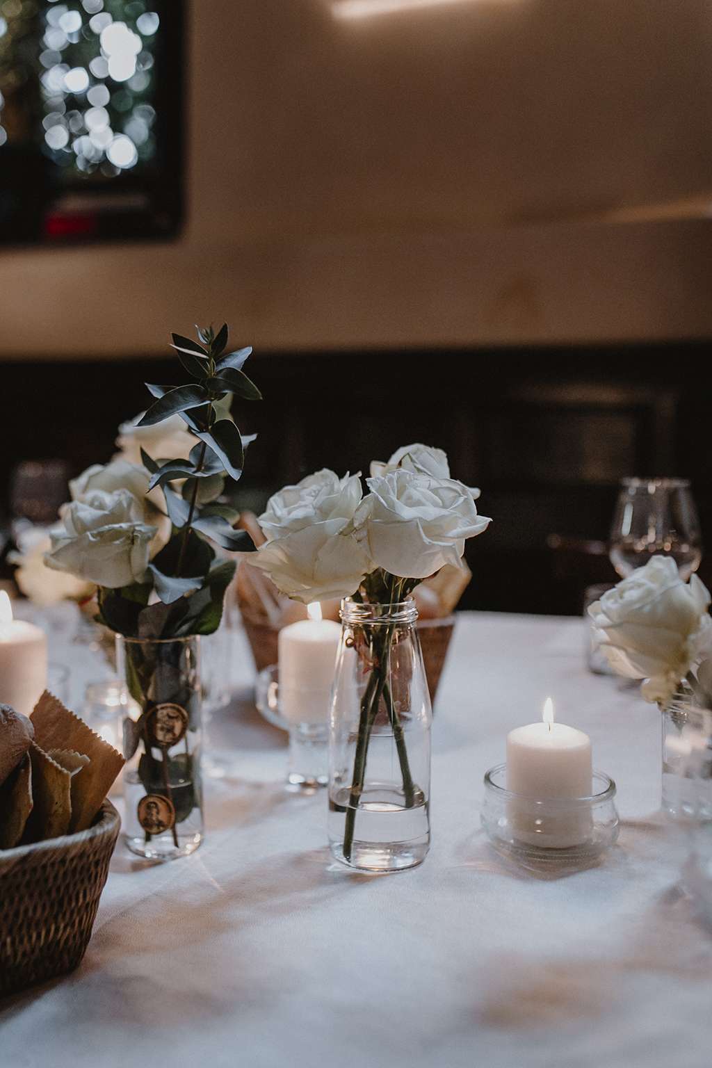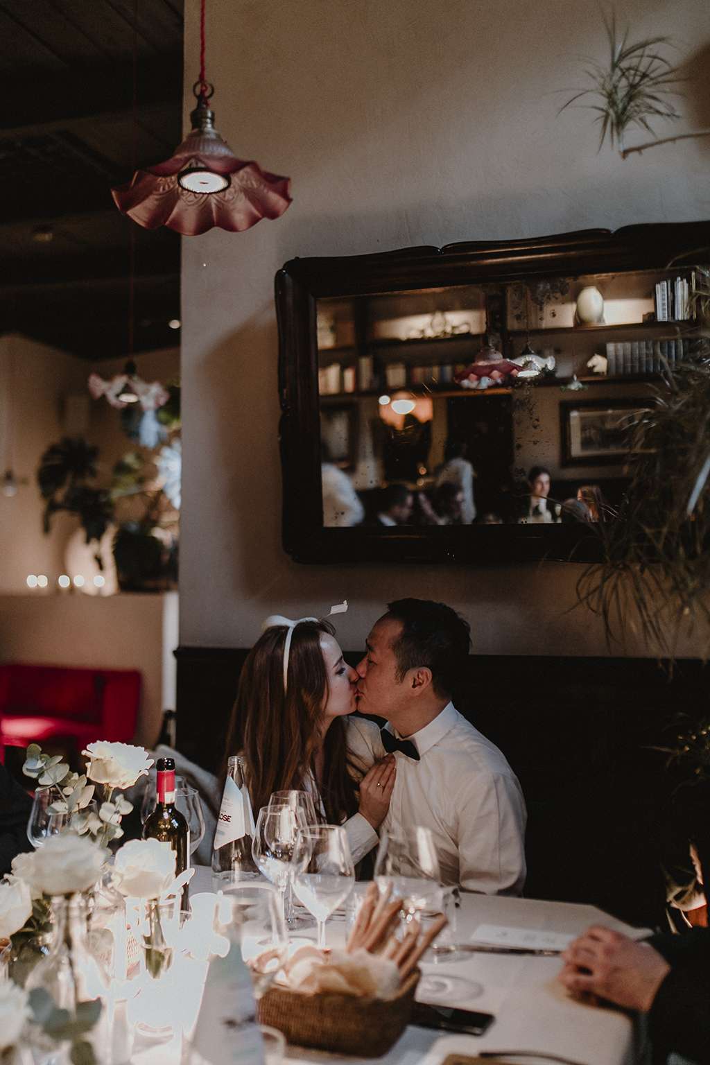 The reception was held at a historic family-owned Milanese restaurant a five-minute walk from their ceremony venue. It was a small, intimate venue – they had four tables of ten people that filled the restaurant to capacity perfectly. They had a long lunch of traditional Milanese winter menu. They had DIY the floral centrepieces, ordering white garden roses and eucalyptus from the farmers market and enlisting a bridesmaid to help. They were arranged in old glass jars and vintage crystal glasses that the couple collected from different flea markets.