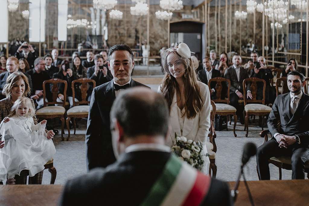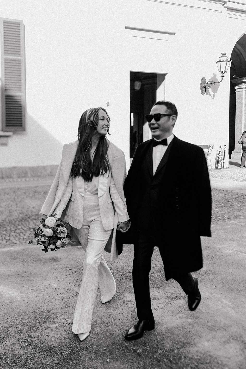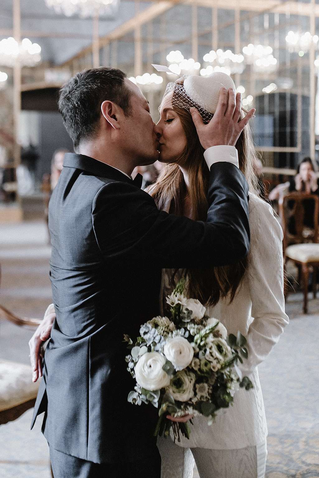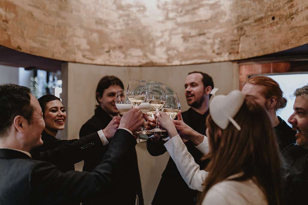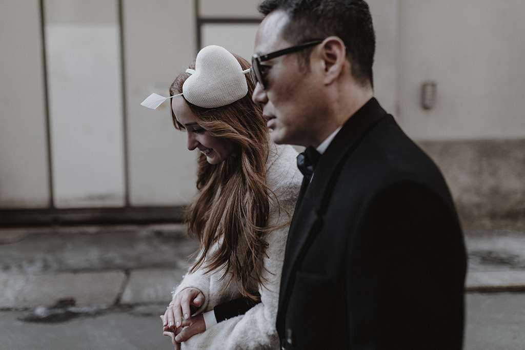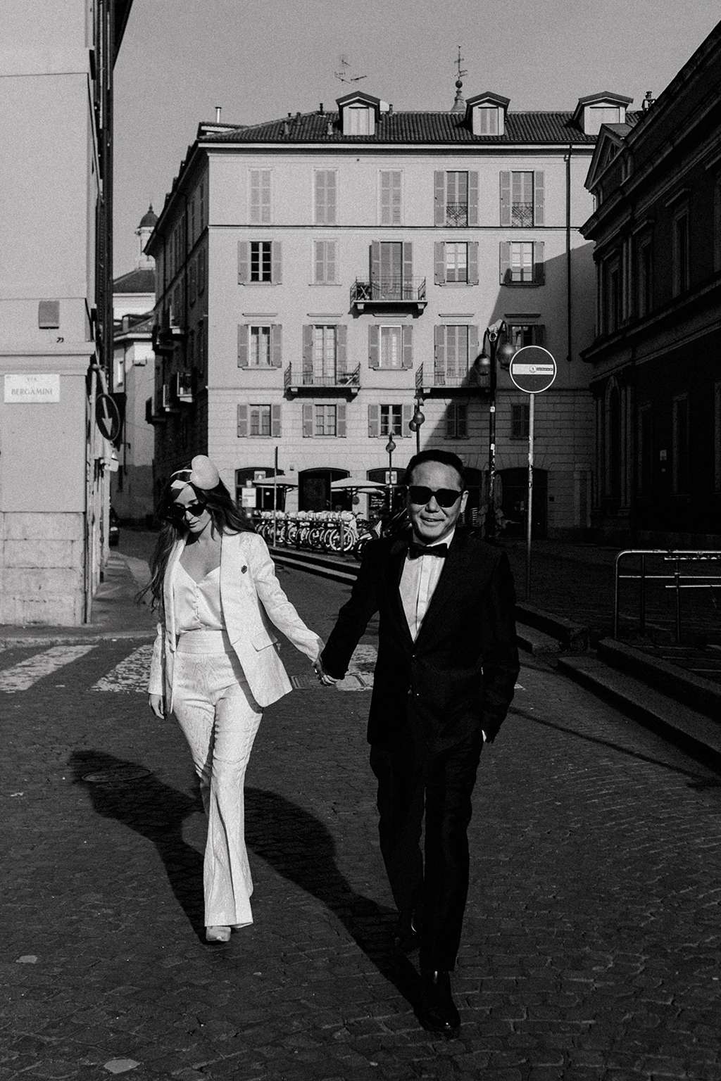 The reception was held at a historic family-owned Milanese restaurant a five-minute walk from their ceremony venue. It was a small, intimate venue – they had four tables of ten people that filled the restaurant to capacity perfectly. They had a long lunch of traditional Milanese winter menu. They had DIY the floral centrepieces, ordering white garden roses and eucalyptus from the farmers market and enlisting a bridesmaid to help. They were arranged in old glass jars and vintage crystal glasses that the couple collected from different flea markets.