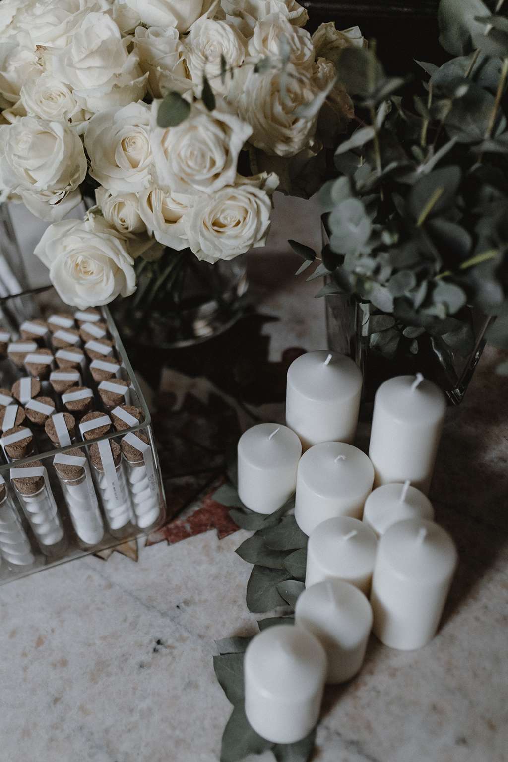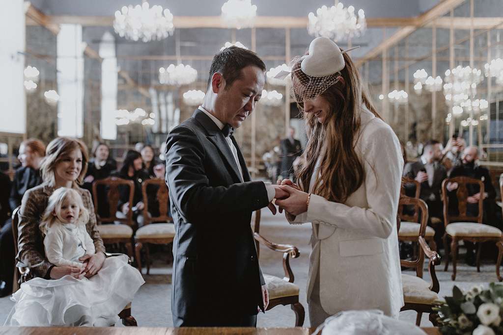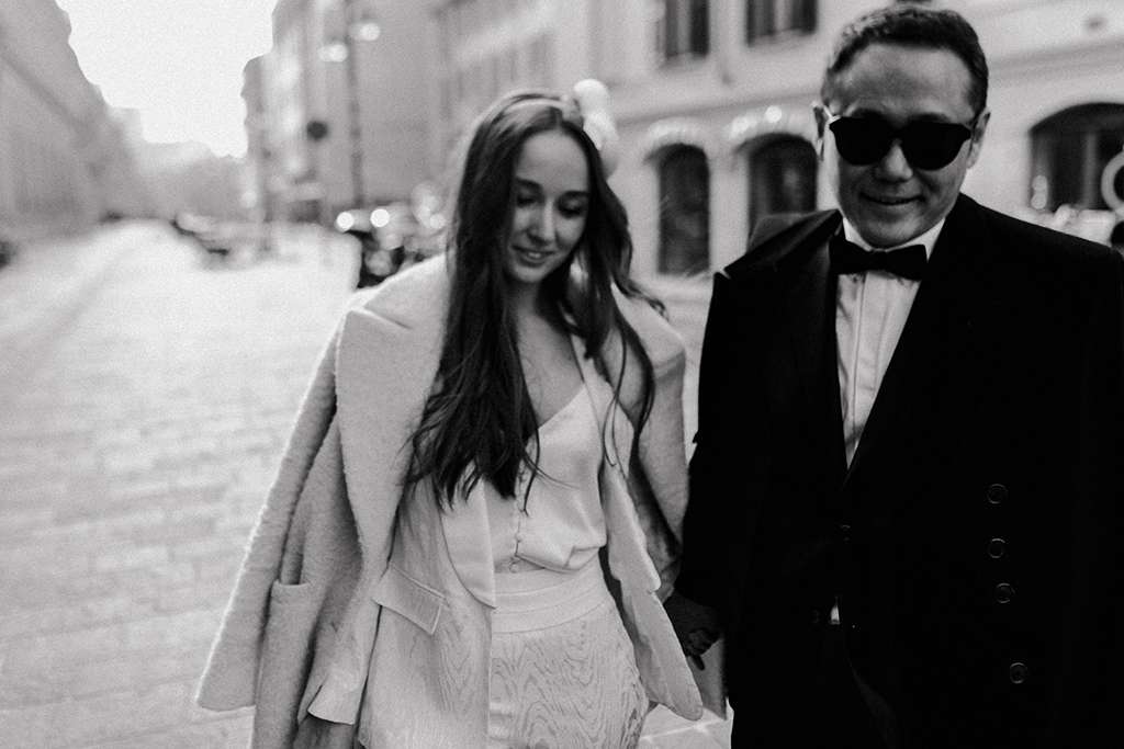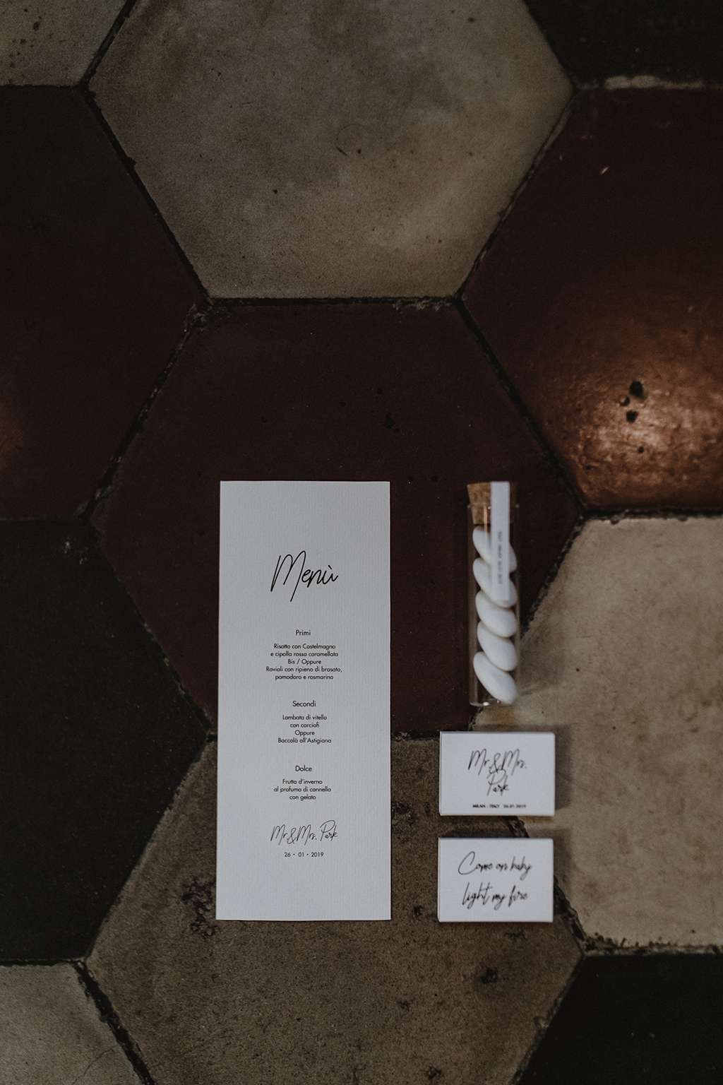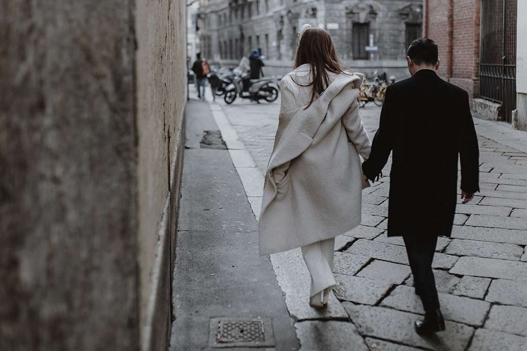 The reception was held at a historic family-owned Milanese restaurant a five-minute walk from their ceremony venue. It was a small, intimate venue – they had four tables of ten people that filled the restaurant to capacity perfectly. They had a long lunch of traditional Milanese winter menu. They had DIY the floral centrepieces, ordering white garden roses and eucalyptus from the farmers market and enlisting a bridesmaid to help. They were arranged in old glass jars and vintage crystal glasses that the couple collected from different flea markets.