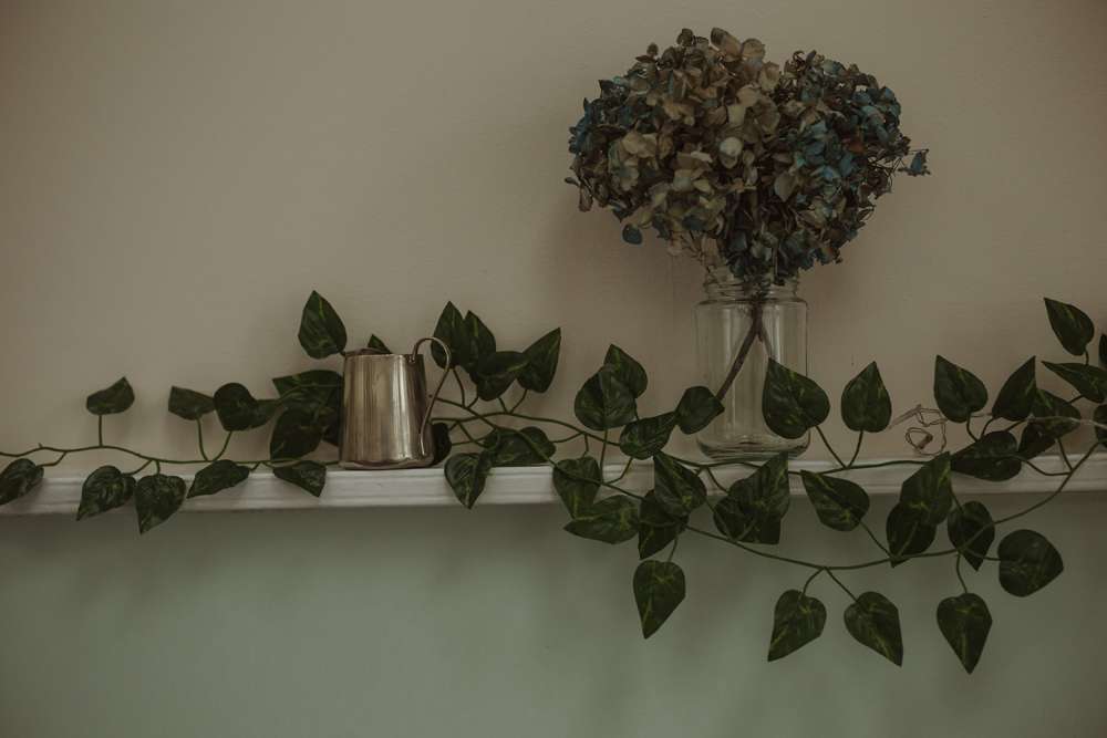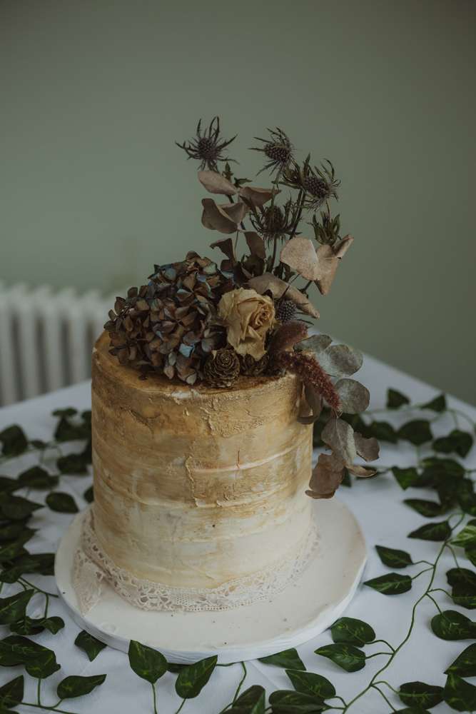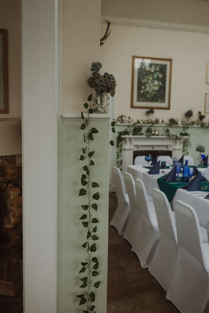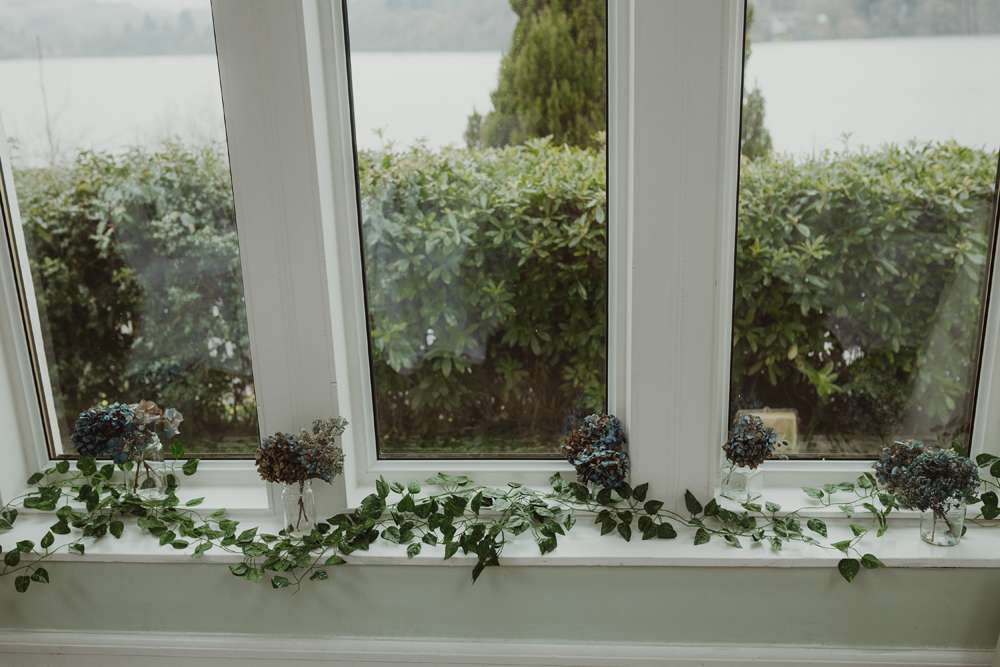 In terms of decor at their reception venue, Portsonachan Hotel, the couple painted stones to use as place cards, they collected lots of pieces of vintage blue glassware from charity shops and they had dried blue Hydrangea which Rachel sprayed gold. The table runners were made from vintage fabric by Rachel’s mum.