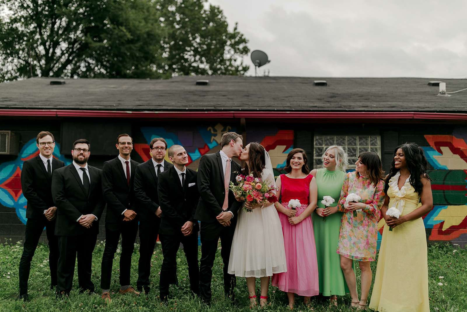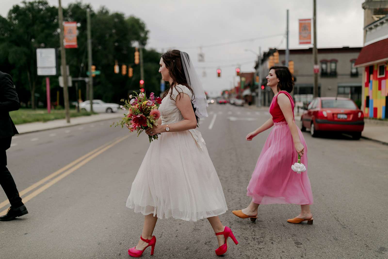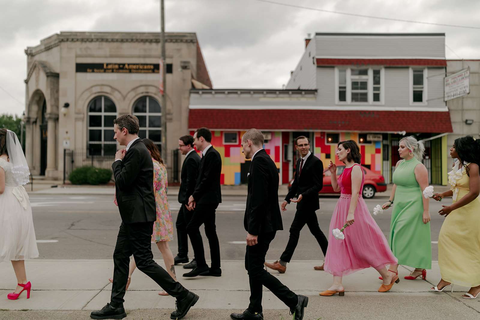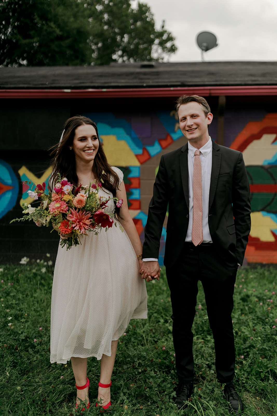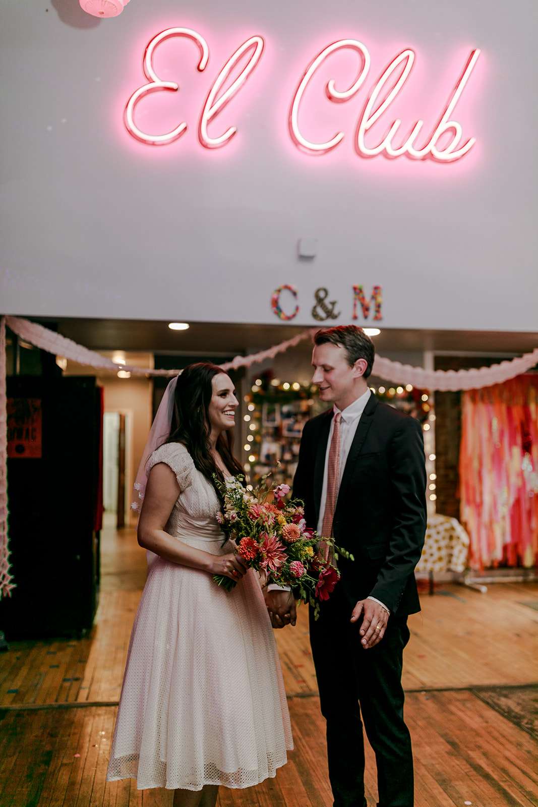 They eloped, just the two of them, and then hosted a big party reception at El Club in Detroit. “We were trying to achieve that dreamy vibe from The Virgin Suicides,” said the bride. “It definitely ended up being more vibrant, not so muted, but that was OK! We eloped at the courthouse a few days before the party which seemed like a very natural way to do it to us, but a lot of our family and co-workers were a little mystified by that plan!”