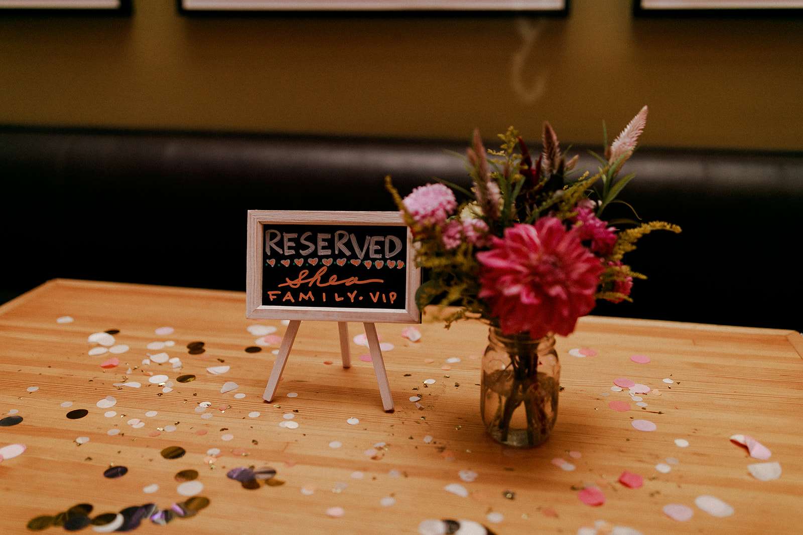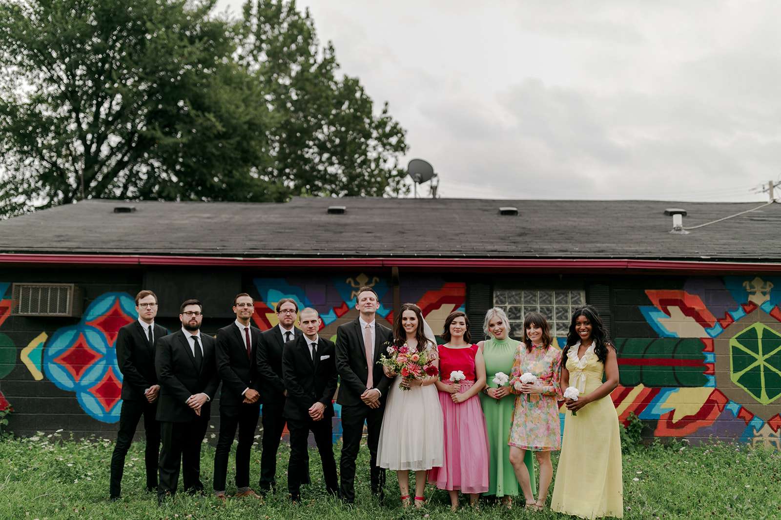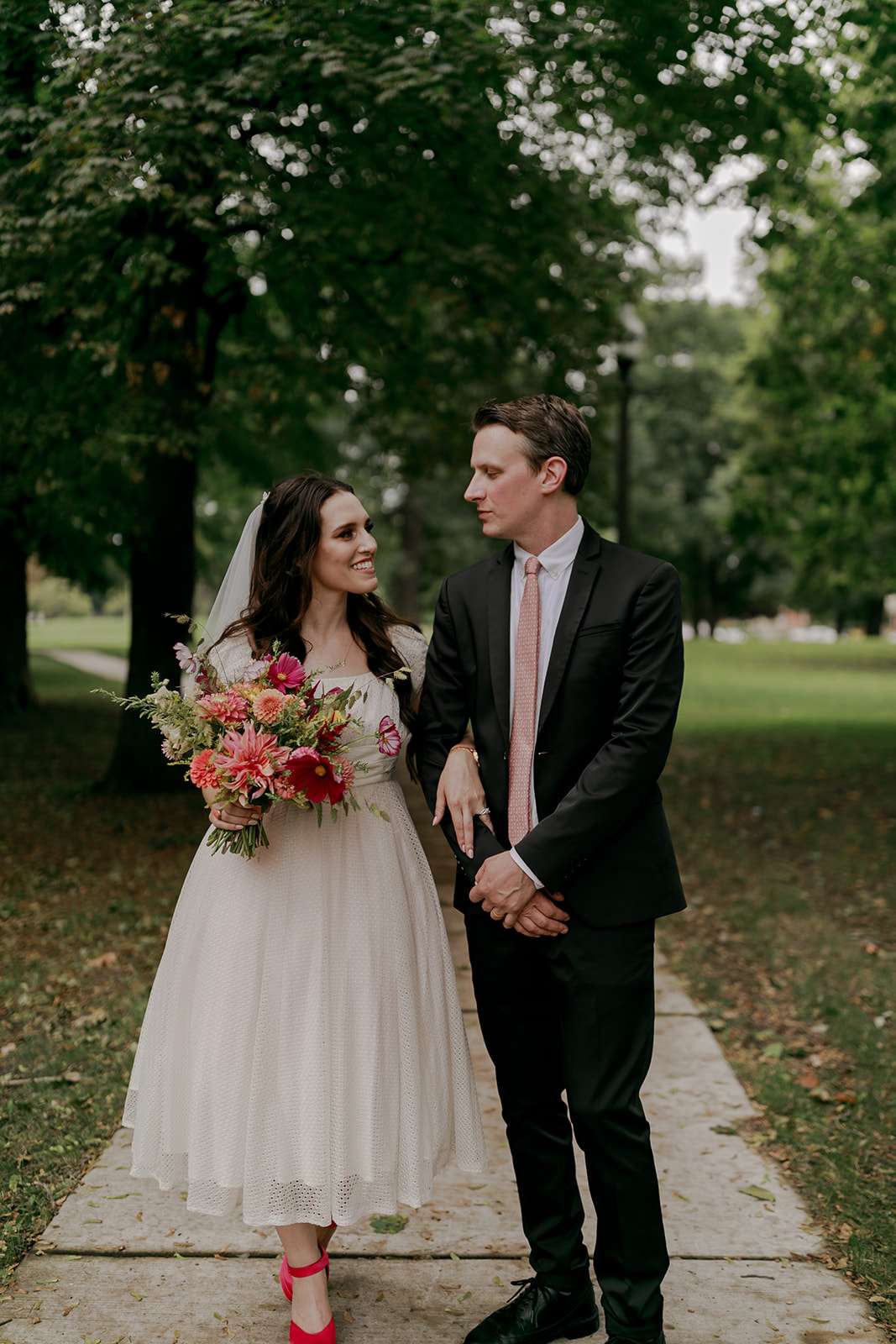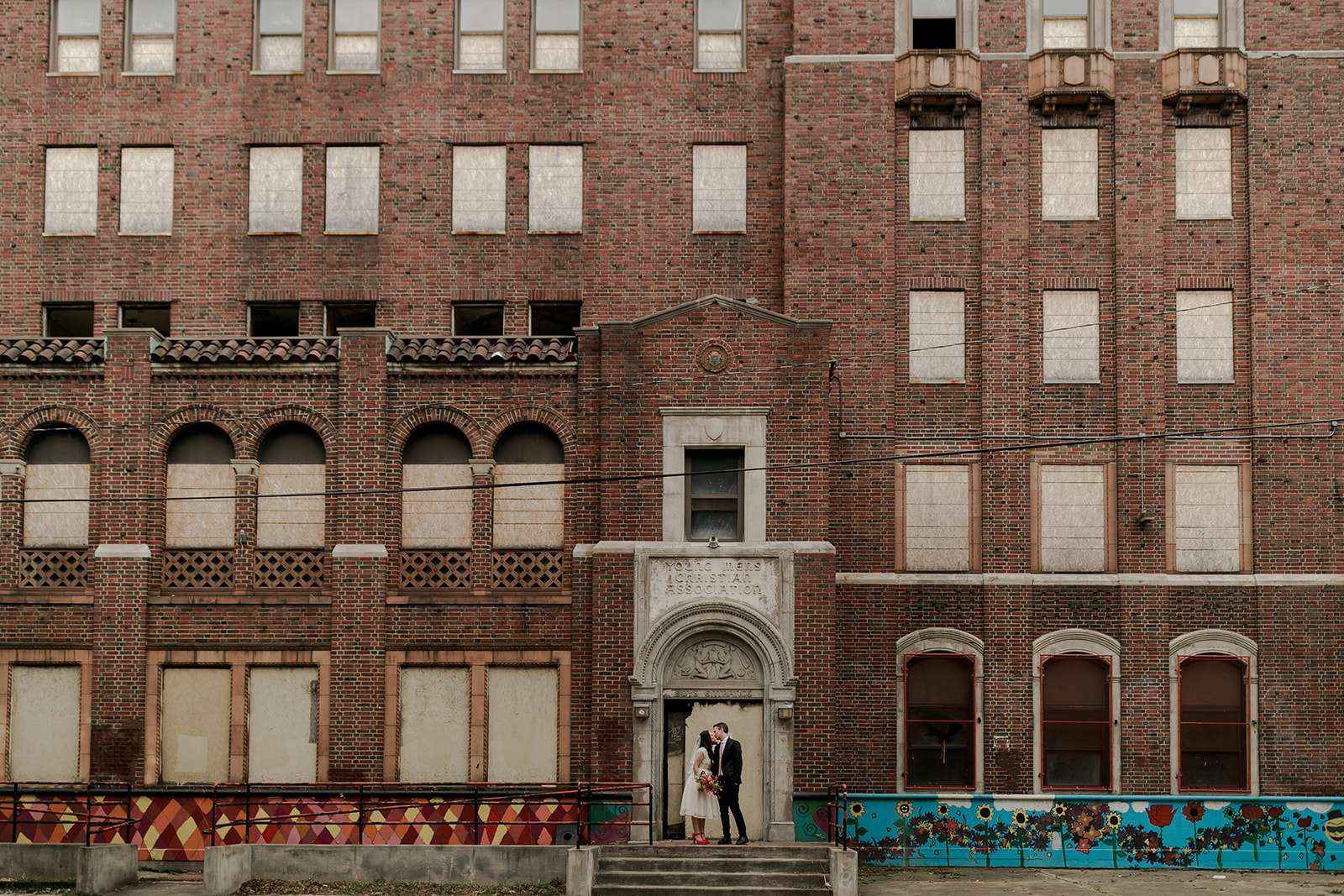 They eloped, just the two of them, and then hosted a big party reception at El Club in Detroit. “We were trying to achieve that dreamy vibe from The Virgin Suicides,” said the bride. “It definitely ended up being more vibrant, not so muted, but that was OK! We eloped at the courthouse a few days before the party which seemed like a very natural way to do it to us, but a lot of our family and co-workers were a little mystified by that plan!”