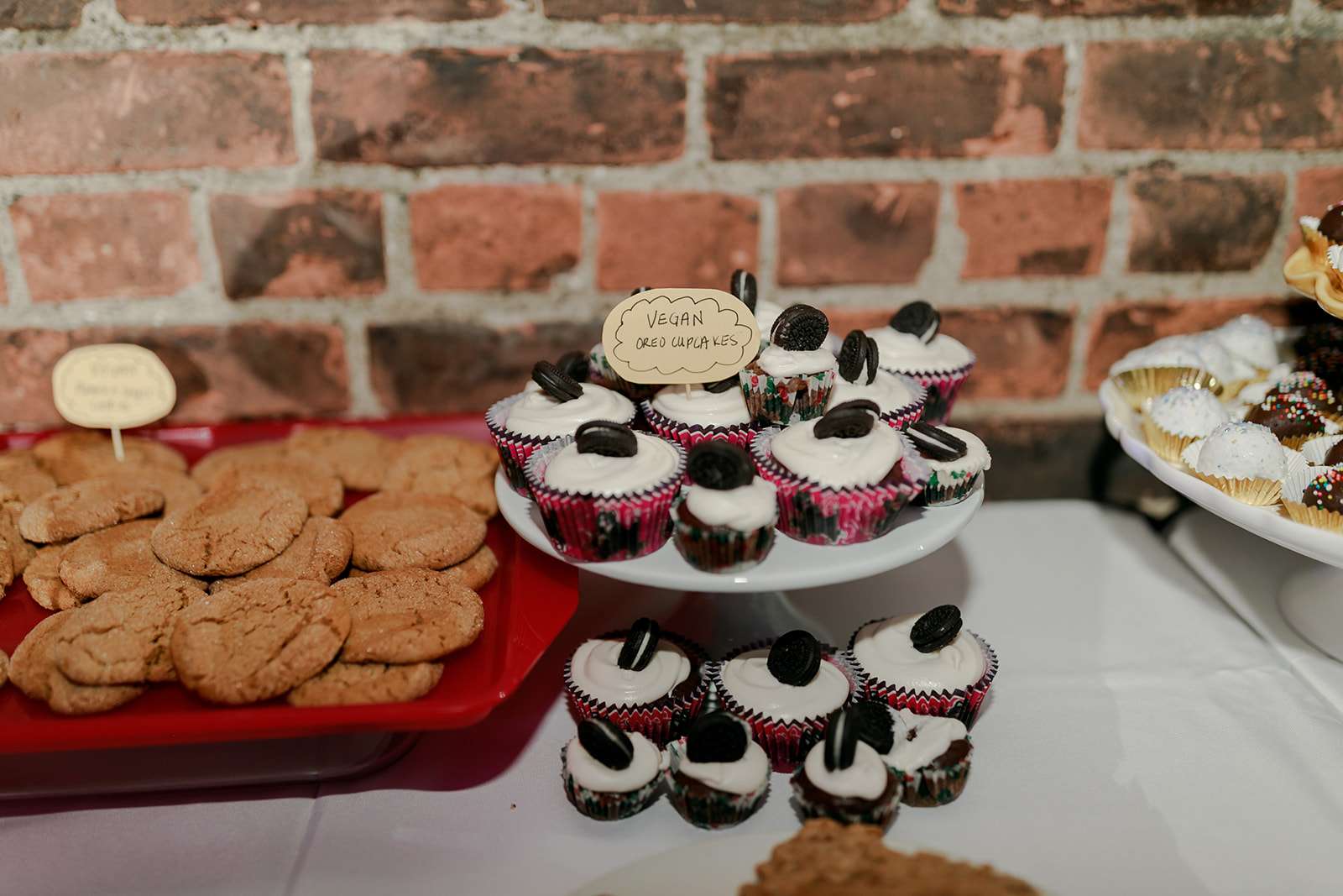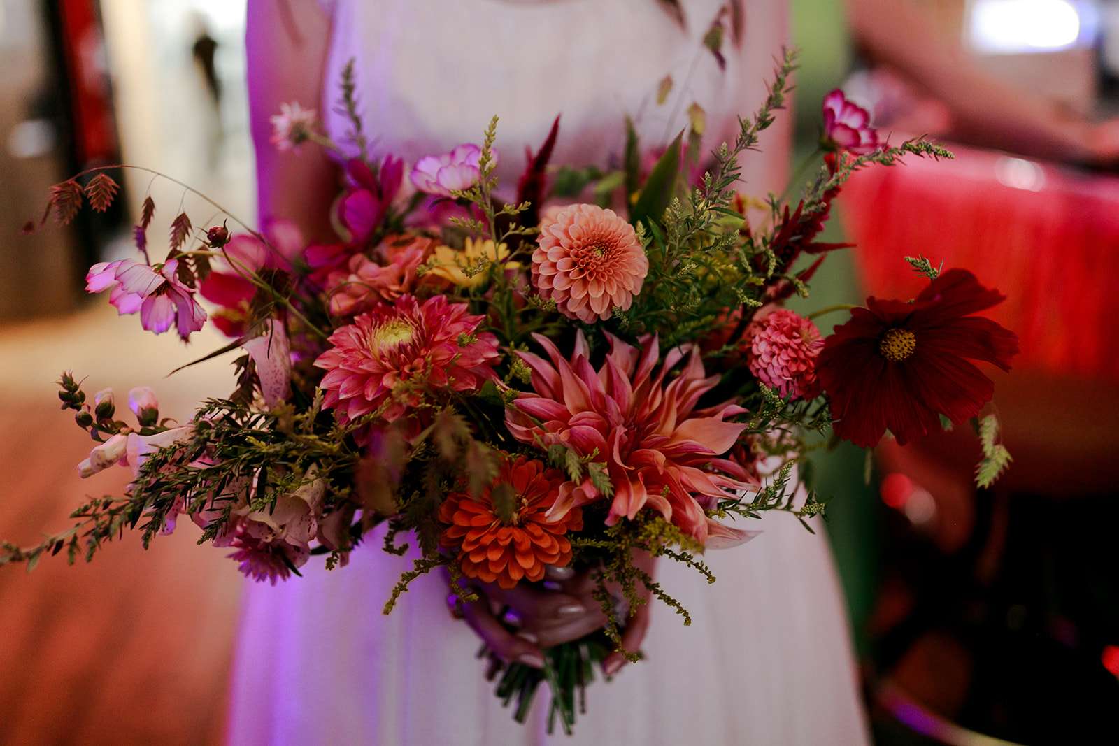 Courtney’s dress was vintage (as were the bridesmaids’) and she wore it with a peach petticoat, daisy lace veil and vegan platform shoes. She also had a personalised ‘Marky’ necklace made by Dainty and Gold.