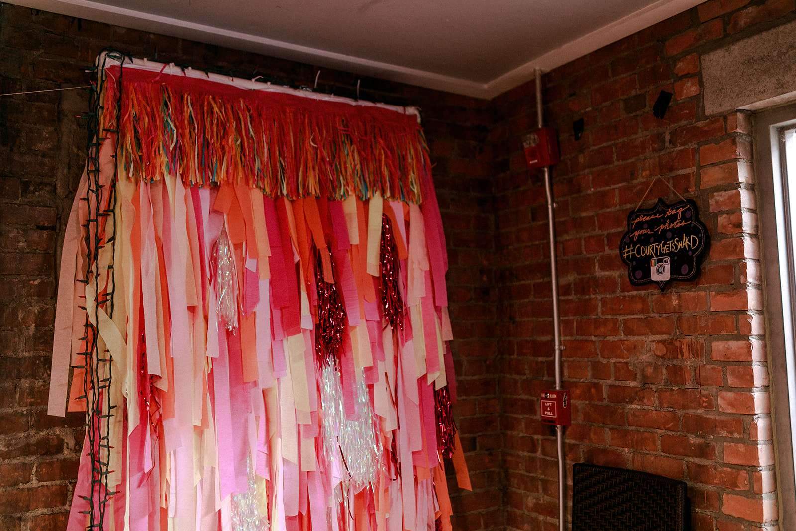 “Mark made our balloon arch above the stage with his groomsmen. We spent a few days blowing up balloons with our friends. We made our photo backdrop from streamers, chicken wire and piping. It took FOREVER and we kind of just winged it. Our friend Christian lent us her
