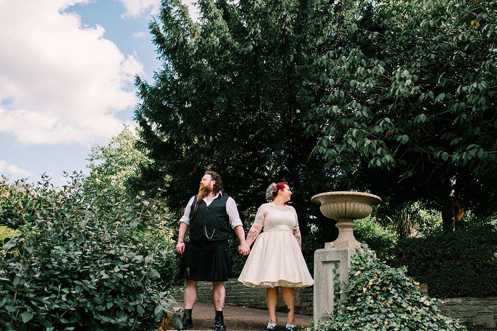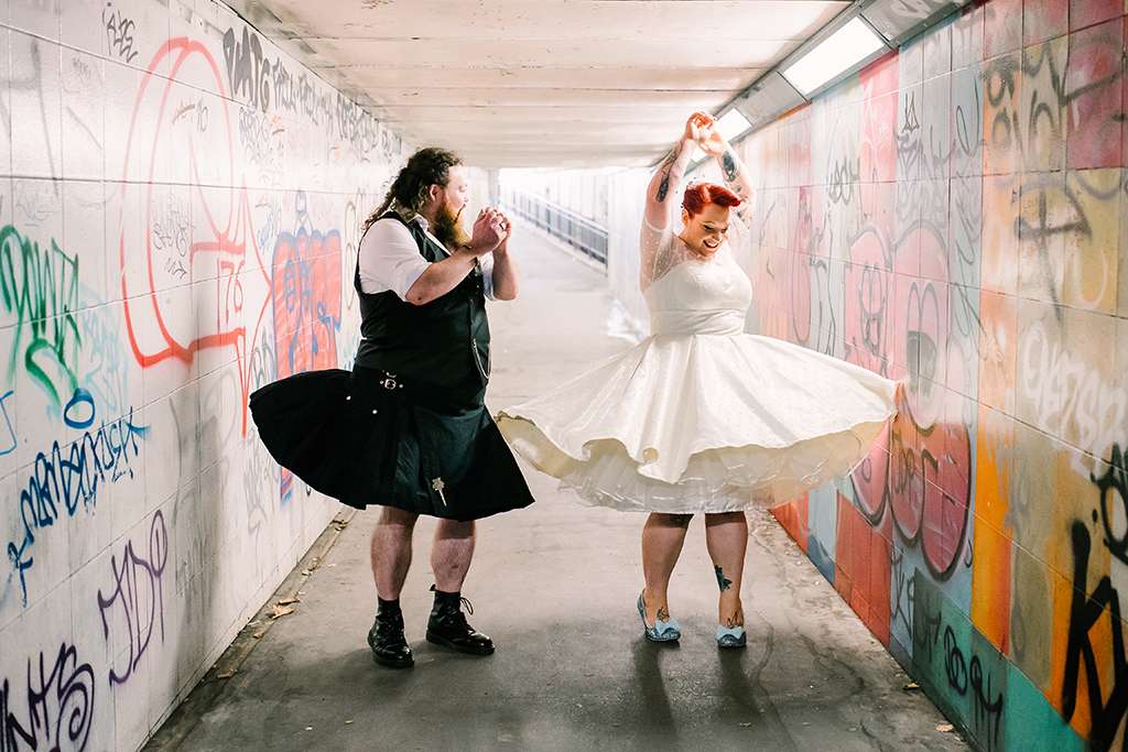 Jana chose a Rockabilly outfit from Pixie Pocket and guess what? It had pockets! She added accessories in her favourite colour, turquoise. She wore a Rock n Roll Bride x Crown and Glory Lovesick veil in Mermaid, but not as a birdcage, instead styling it like a blusher veil at the back of her head! Dave wore a kilt, as his friends have declared him an honorary Glaswegian. They both wore Dr Martens, though Jana was also surprised with a pair of her dream Irregular Choice shoes by her mum before the wedding.