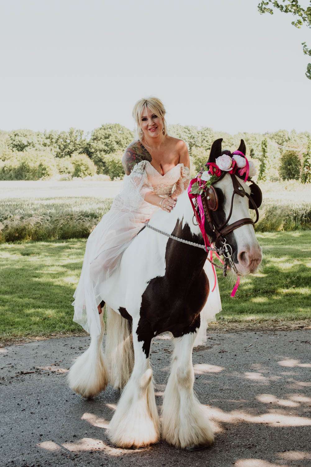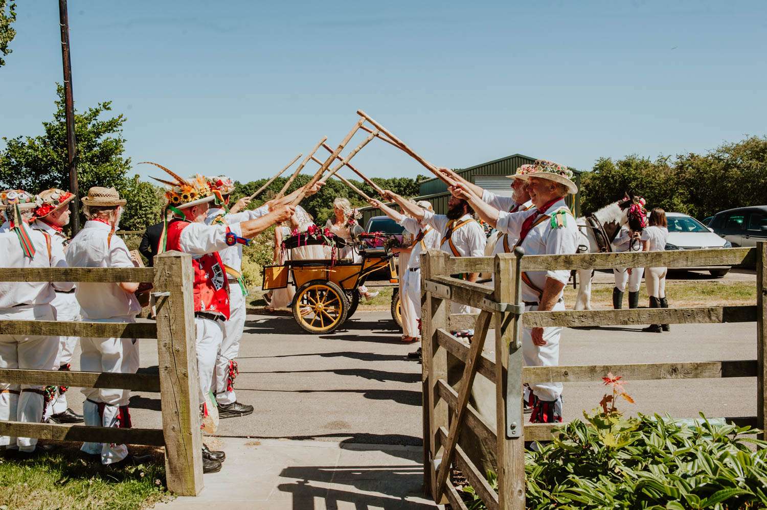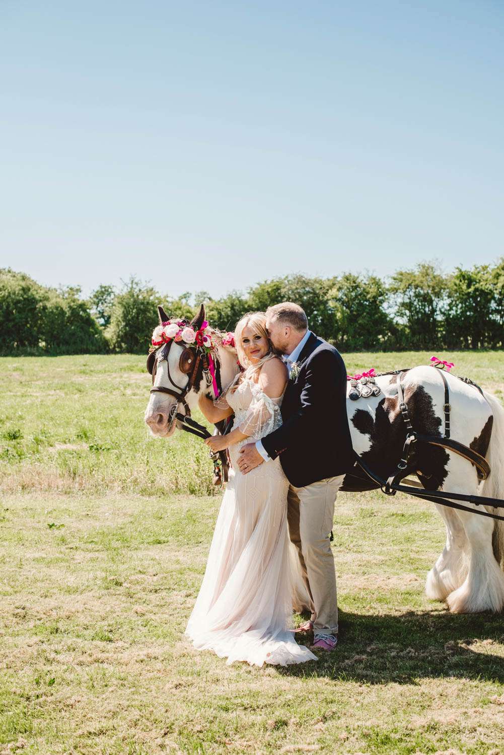 “We had a ‘side’ of Morris Dancers lead the bridal procession”, she explained. “They were followed by my bridesmaids and I arrived on my horse led Dray, pulled by our family horse, Jim. My oldest son gave me away. It was a druid/ pagan ceremony and there was lots of symbolism. The children also had active roles. When you get married in a circle and that circle is ‘cast’ by the druid priest, it becomes a sacred space, divided into quarters. Each quarter holds an element, and each element is different, the children each had a quarter which conveniently tied with their individual characters, and they were heavily involved in the planning. We shared honey cake and mead with our guests during as per the traditional pagan rites and we had our hands bound by our priest in line with the handfasting tradition. We then jumped the Besom (broomstick) and it now sits outside our front door to ward away the baddies.”