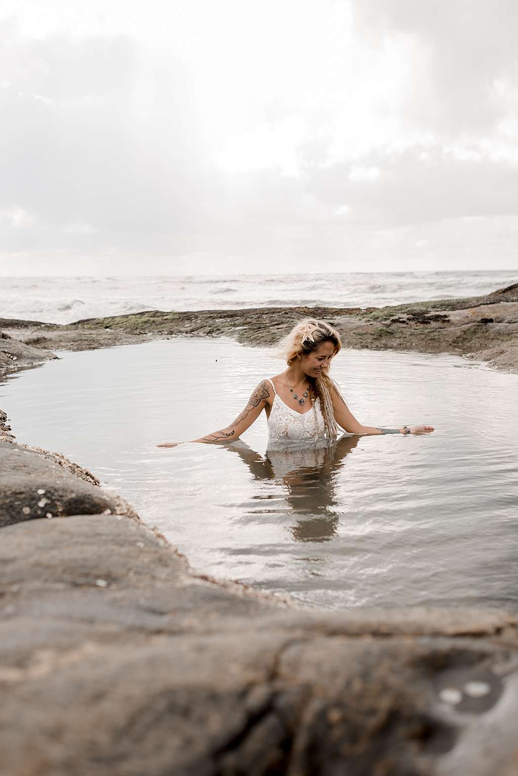 “The ceremony was magic.” said Larissa. “With the blessings of the ocean water and mother earth in each of the little details: the sun that opened during a cloud sunrise, the waves of the sea, the sea of life so close to us in the natural pools and in the droplets of rain falling at the end of our big day.”