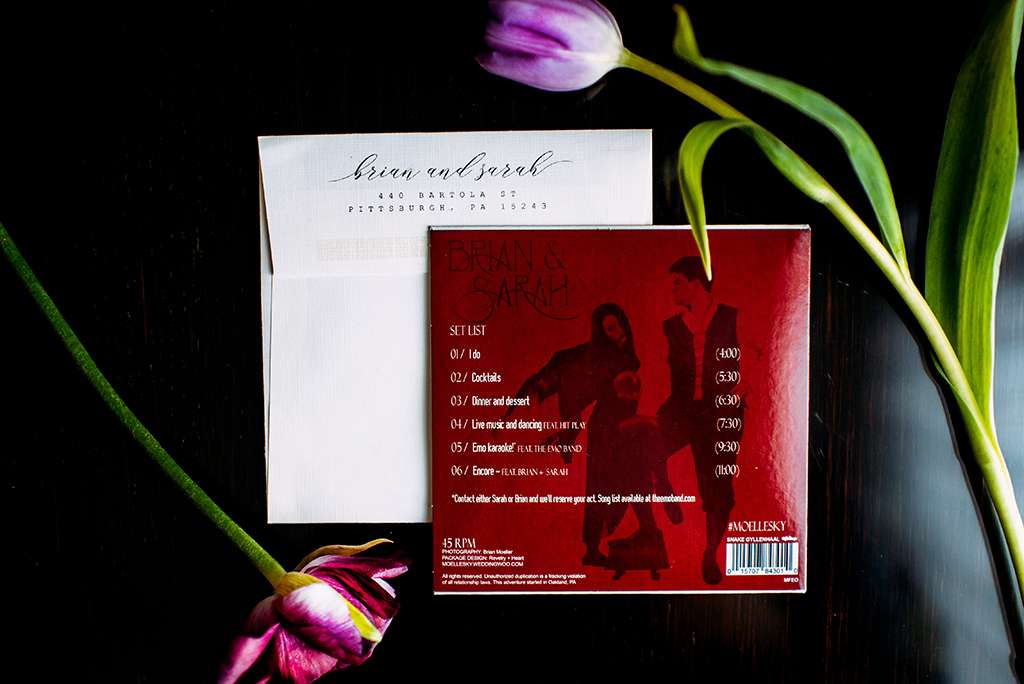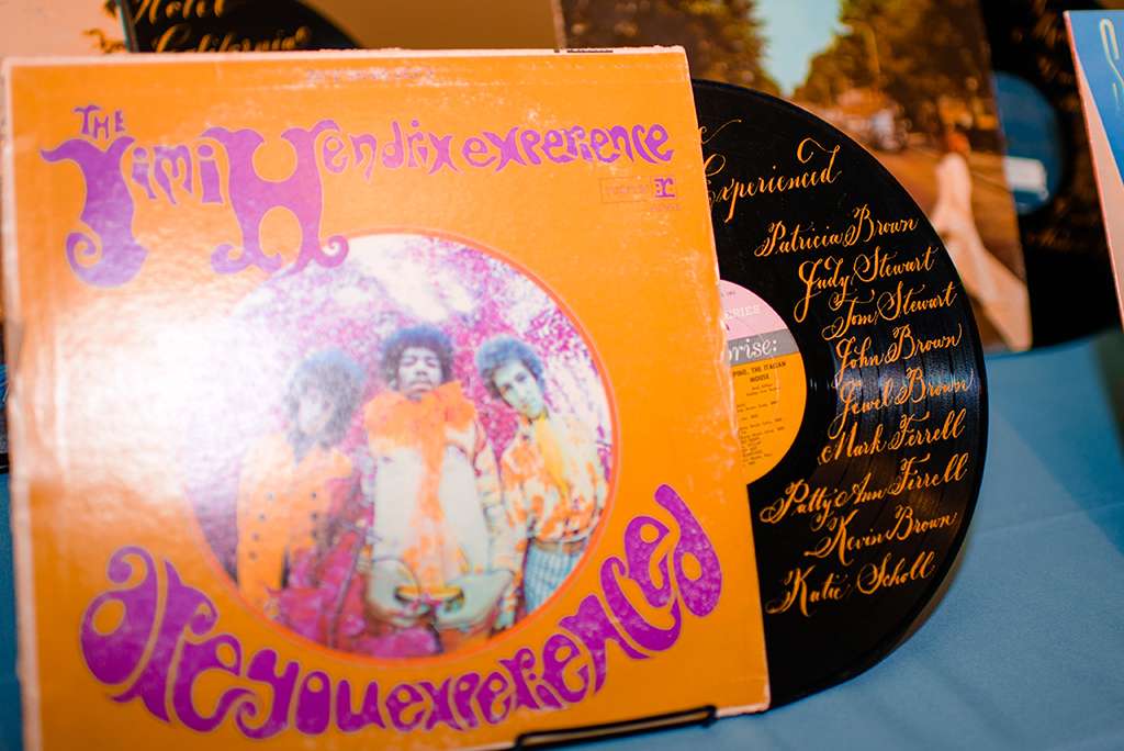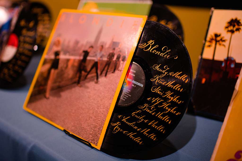 The couple have a huge vinyl collection, so they took inspiration for their own vinyl invitations, complete with custom artwork inspired by the Fleetwood Mac Rumours artwork, and used their favourite record covers throughout their decor. Instead of using table numbers, they had each table assigned a classic rock album, and had a calligrapher write everyone’s names across the record as a table plan. “A lot of our family that grew up listening to that music loved looking at all the records and talking to each other about their memories from those artists.” said Sarah.