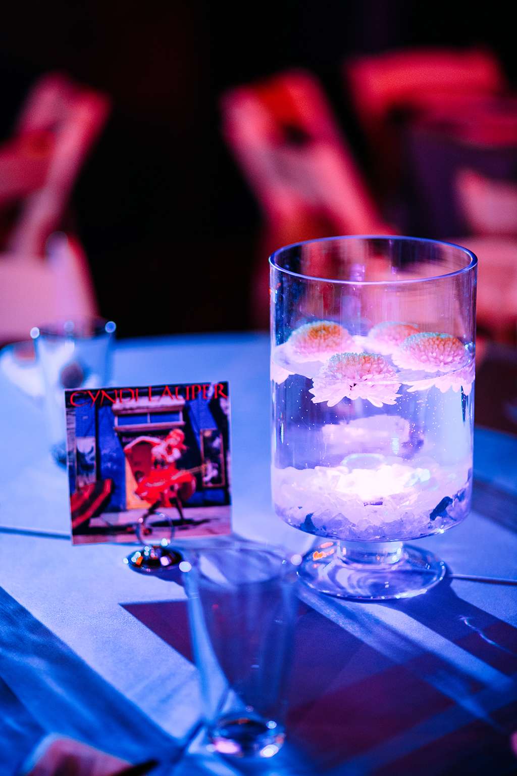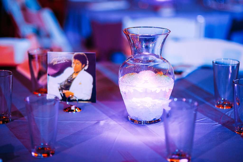 They also DIY’d other decor for their day. They collected different shaped glassware from thrift shops over the course of a year, and created glowing vases by using pool lights that could change colours at the bottom filled with water and topped with flowers. “It created a dreamy ambience and was super cheap!” she explained.