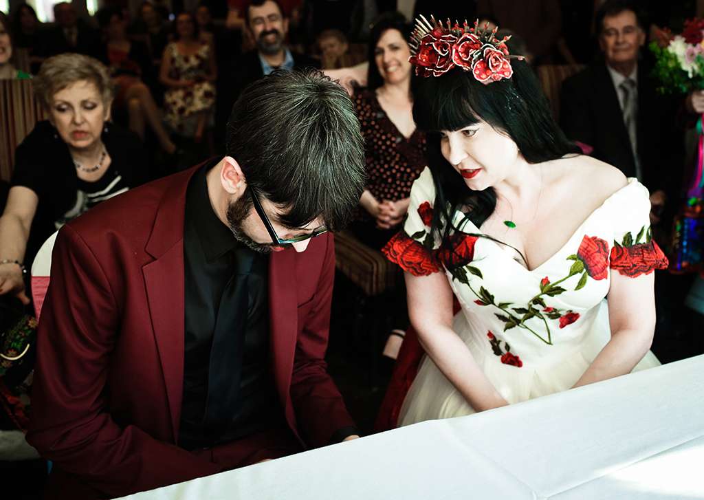 Both Kasandra and Phil are visual people – Kasandra is the head of the Irish Film Archive and Phil works for the Broadcasting Authority of Ireland – so they wanted a quirky, colourful and retro vibe for the occasion that reflected their style. Kasandra wore a dress from the Pretty Dress Company that she had admired for ages. She made herself a wrap from a piece of fabric that she’d bought in a fabric shop in Dublin, and her headpiece was a last minute creation by her maid of honour after deciding she looked a little too twee in the dress alone and needed something to make her look more ferocious! Frida Kahlo would be proud.