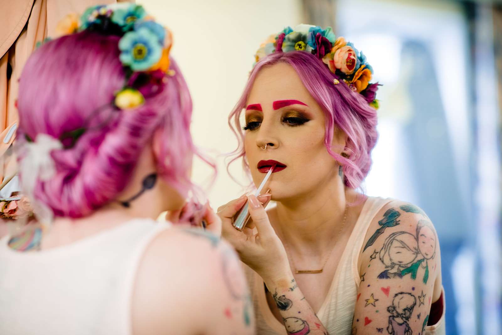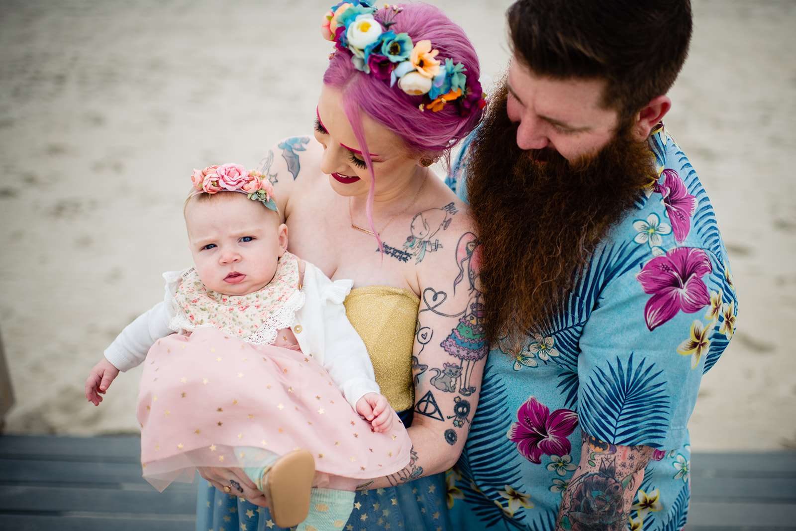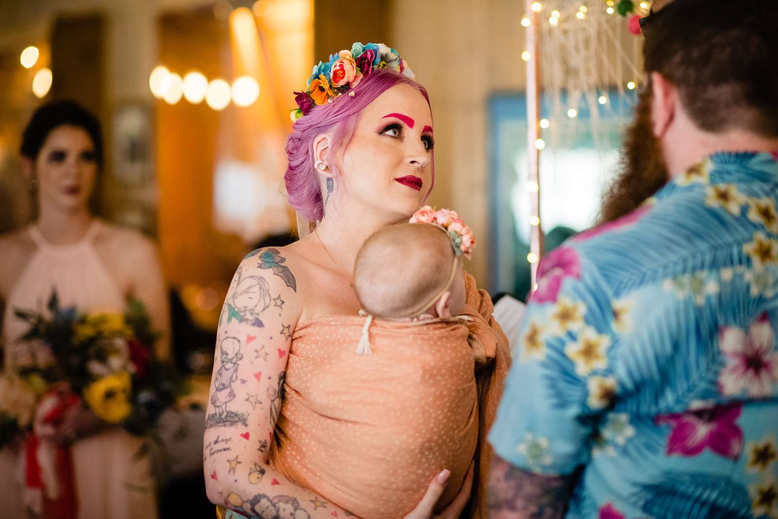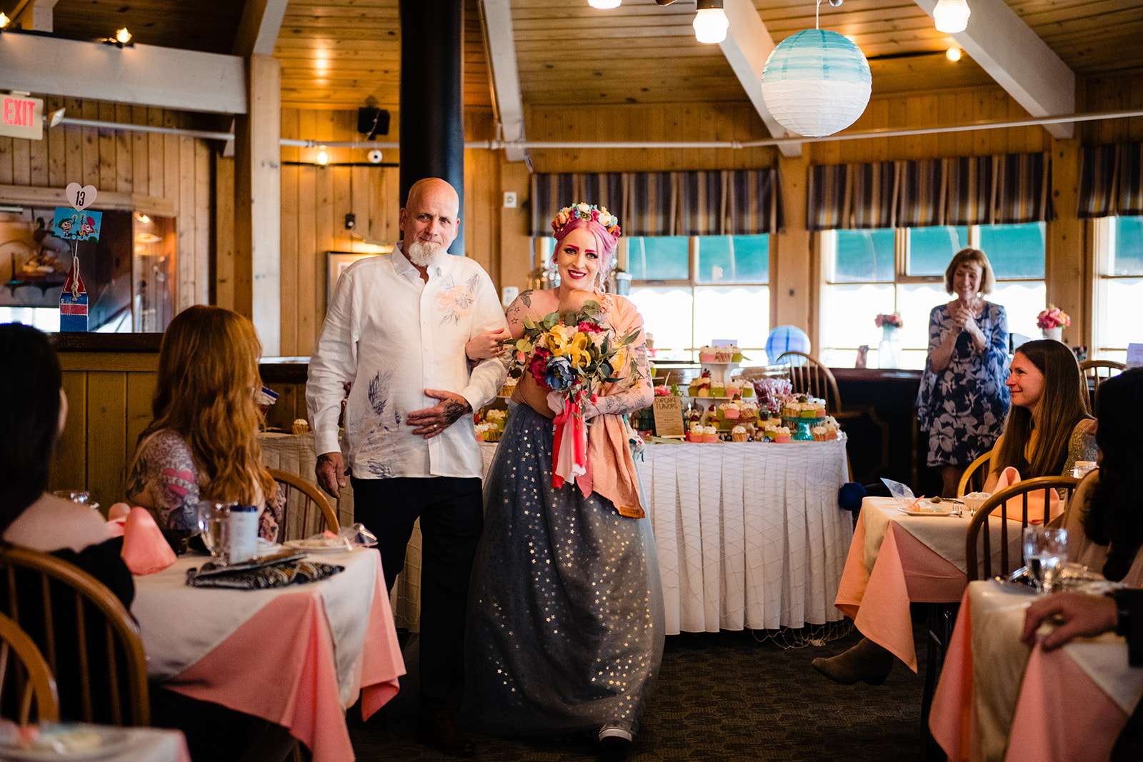 If you’re a lover of colourful weddings then baby you are going to flip your lid over Catie and Joe’s big day… especially the bride’s incredible outfit! Pink brows to match her hair? Hell yeah! we have so much love for this! They were married in April in New Jersey. They wanted a wedding that celebrated them but also included their daughter, Annabelle (Catie even held her in a sling during their vows – so sweet!)