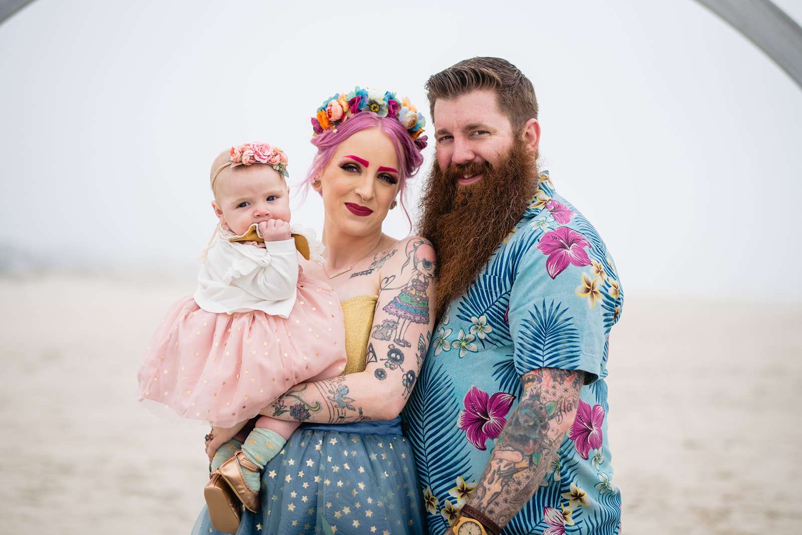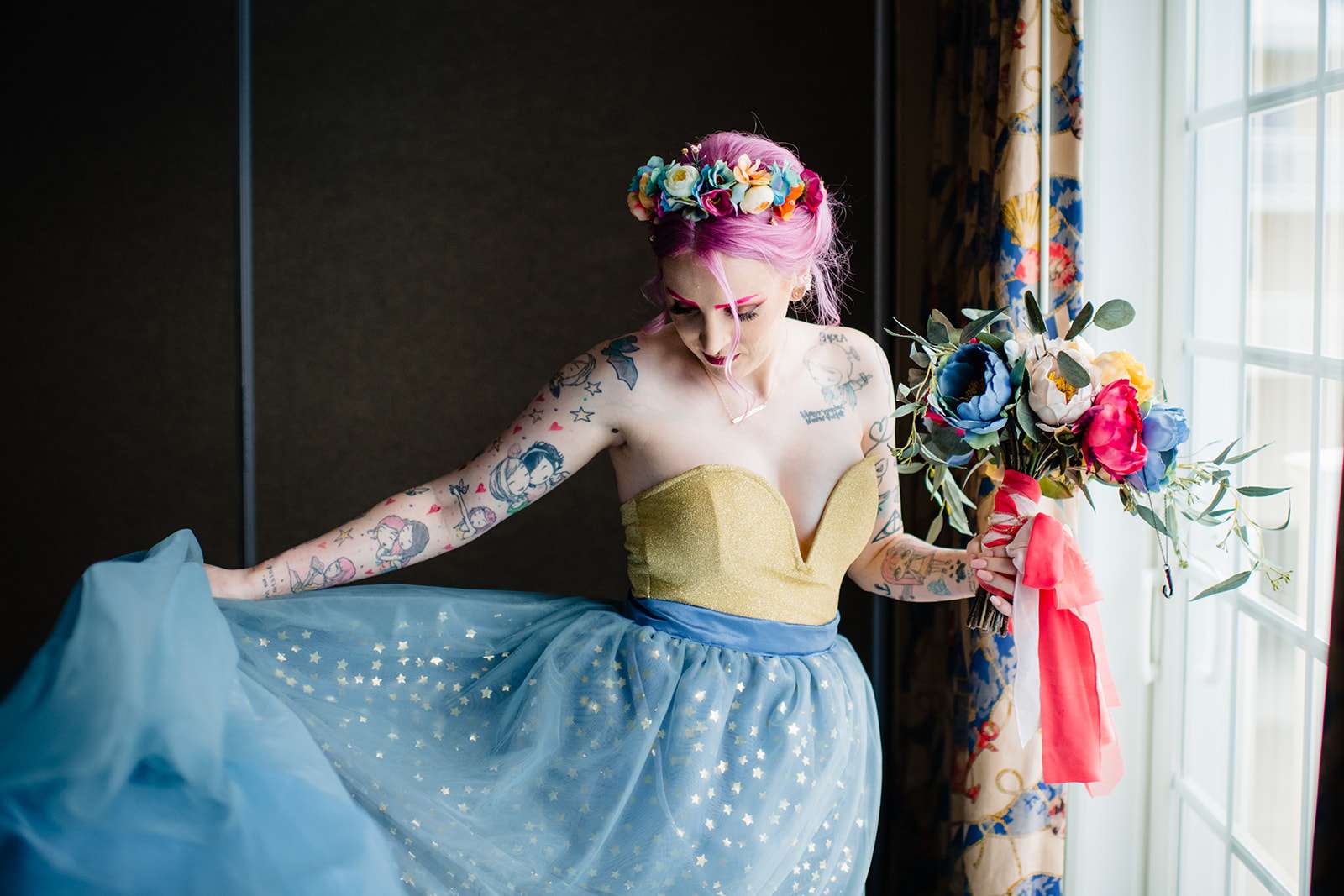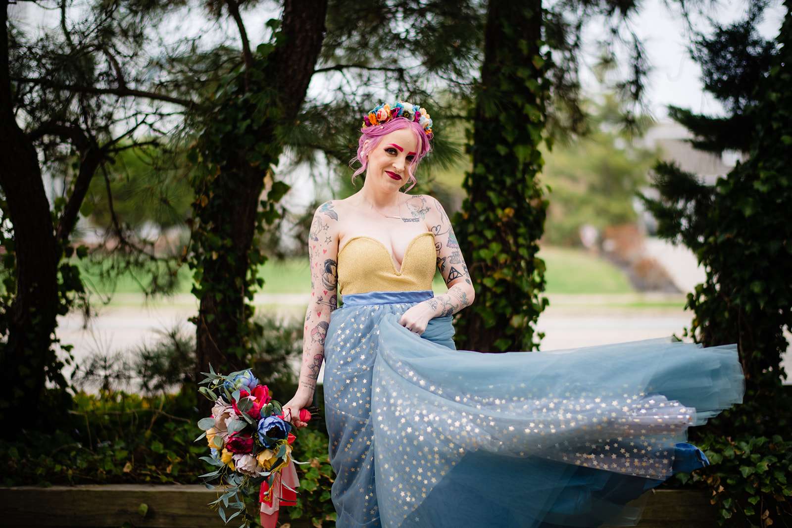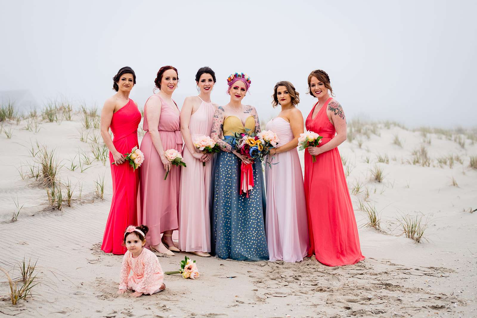 If you’re a lover of colourful weddings then baby you are going to flip your lid over Catie and Joe’s big day… especially the bride’s incredible outfit! Pink brows to match her hair? Hell yeah! we have so much love for this! They were married in April in New Jersey. They wanted a wedding that celebrated them but also included their daughter, Annabelle (Catie even held her in a sling during their vows – so sweet!)