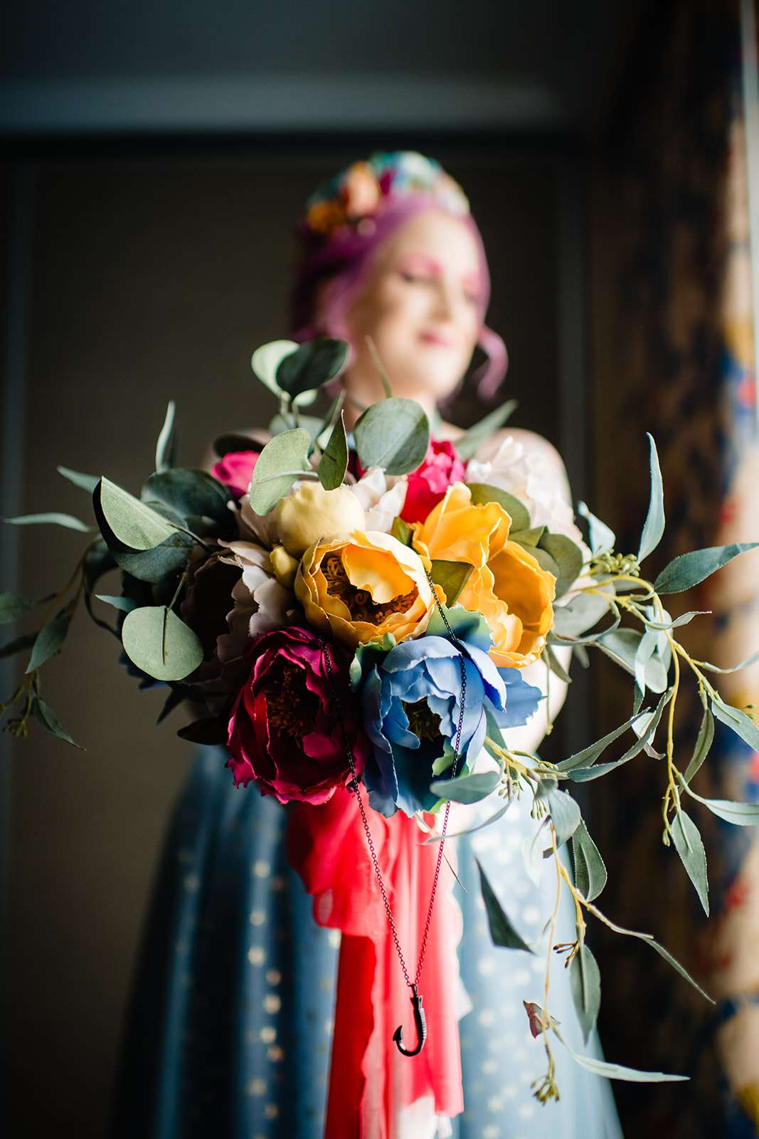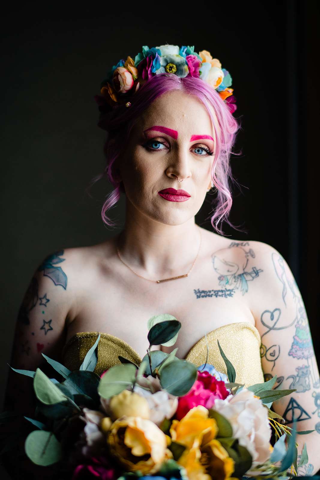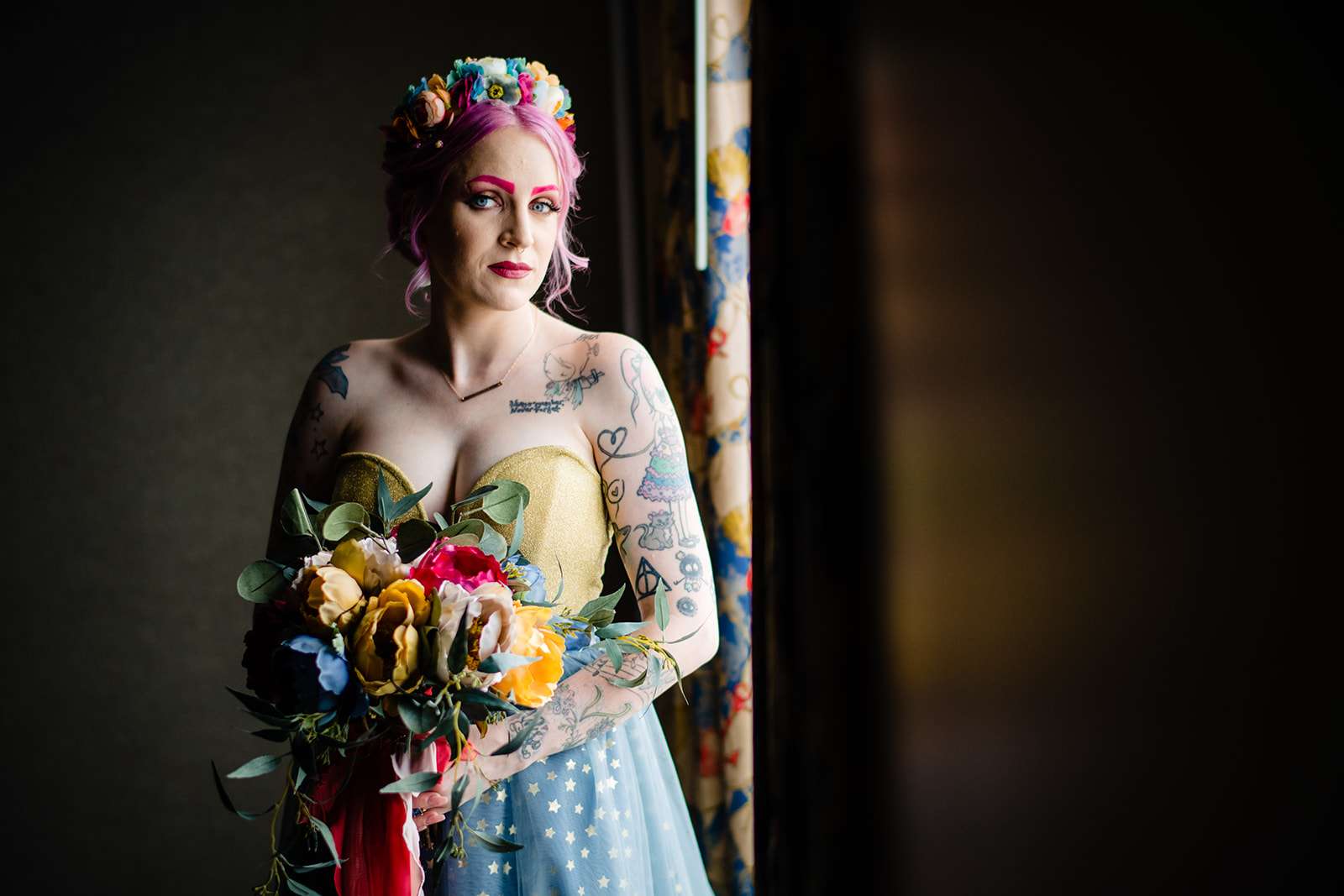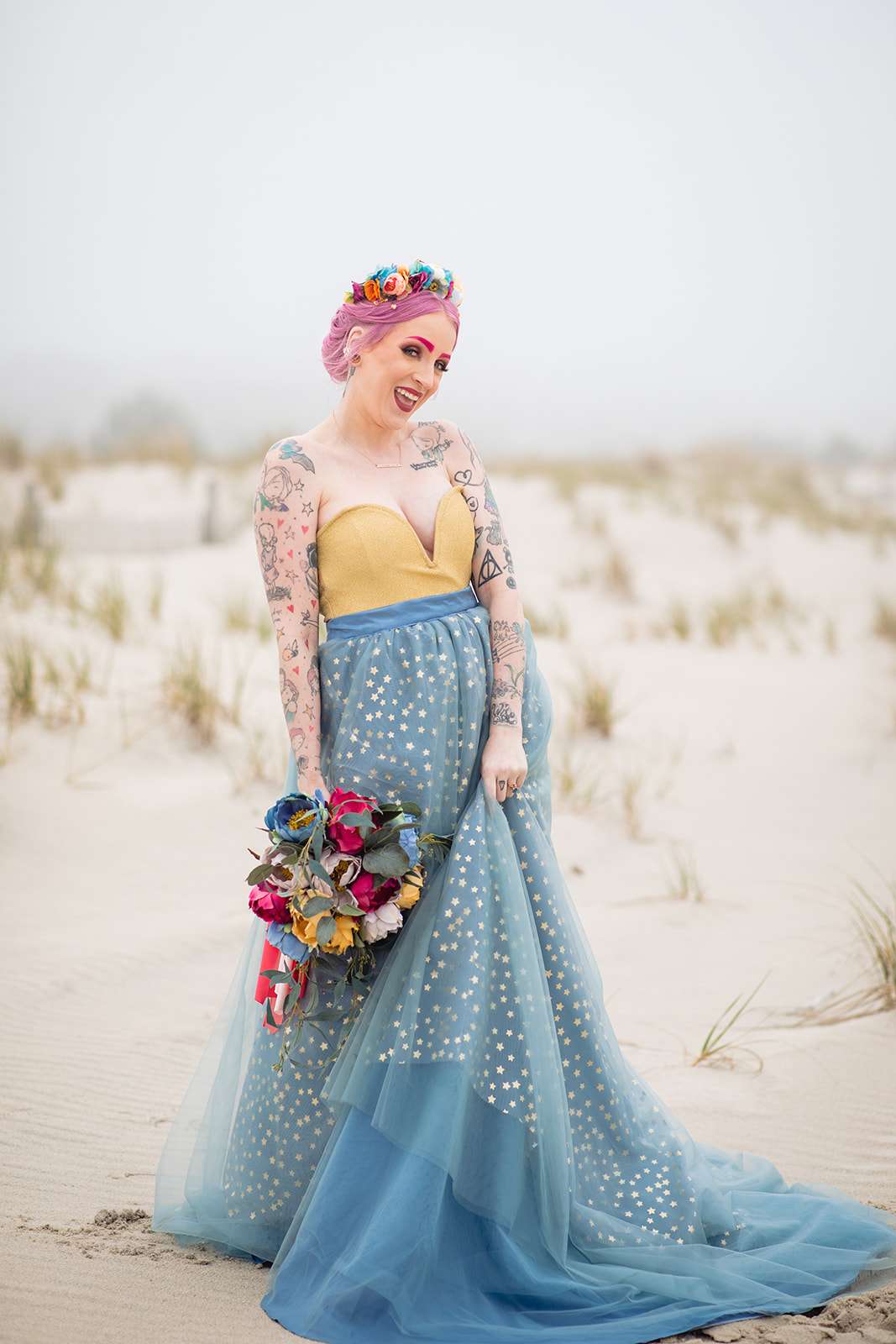 If you’re a lover of colourful weddings then baby you are going to flip your lid over Catie and Joe’s big day… especially the bride’s incredible outfit! Pink brows to match her hair? Hell yeah! we have so much love for this! They were married in April in New Jersey. They wanted a wedding that celebrated them but also included their daughter, Annabelle (Catie even held her in a sling during their vows – so sweet!)