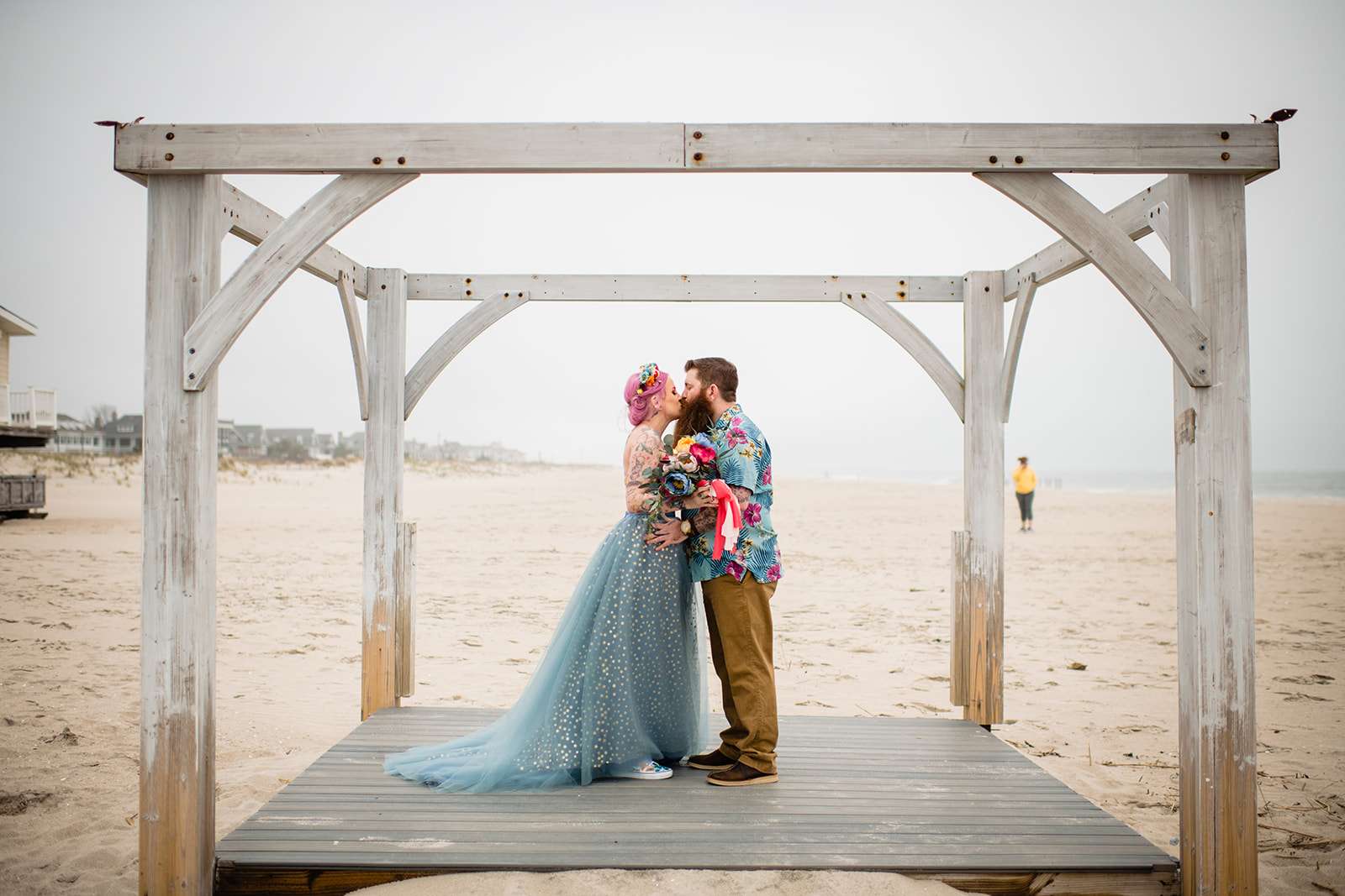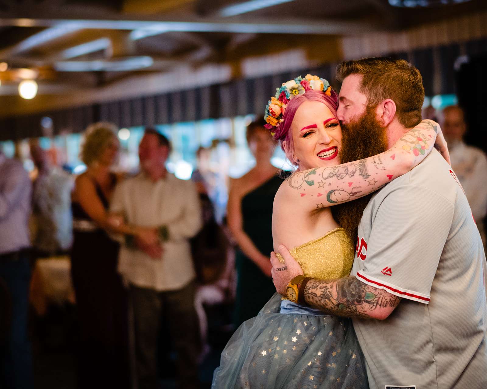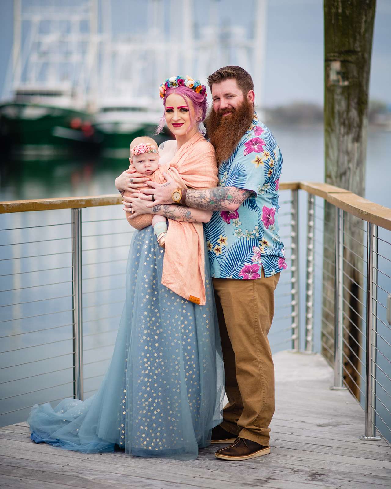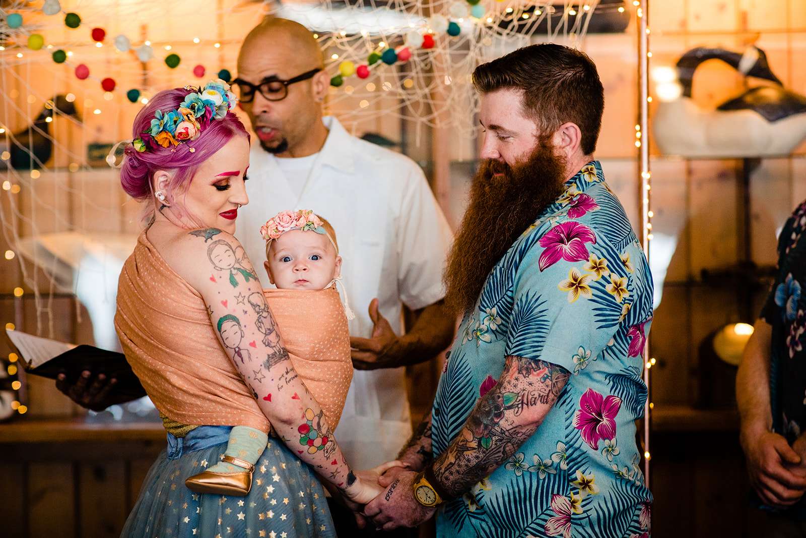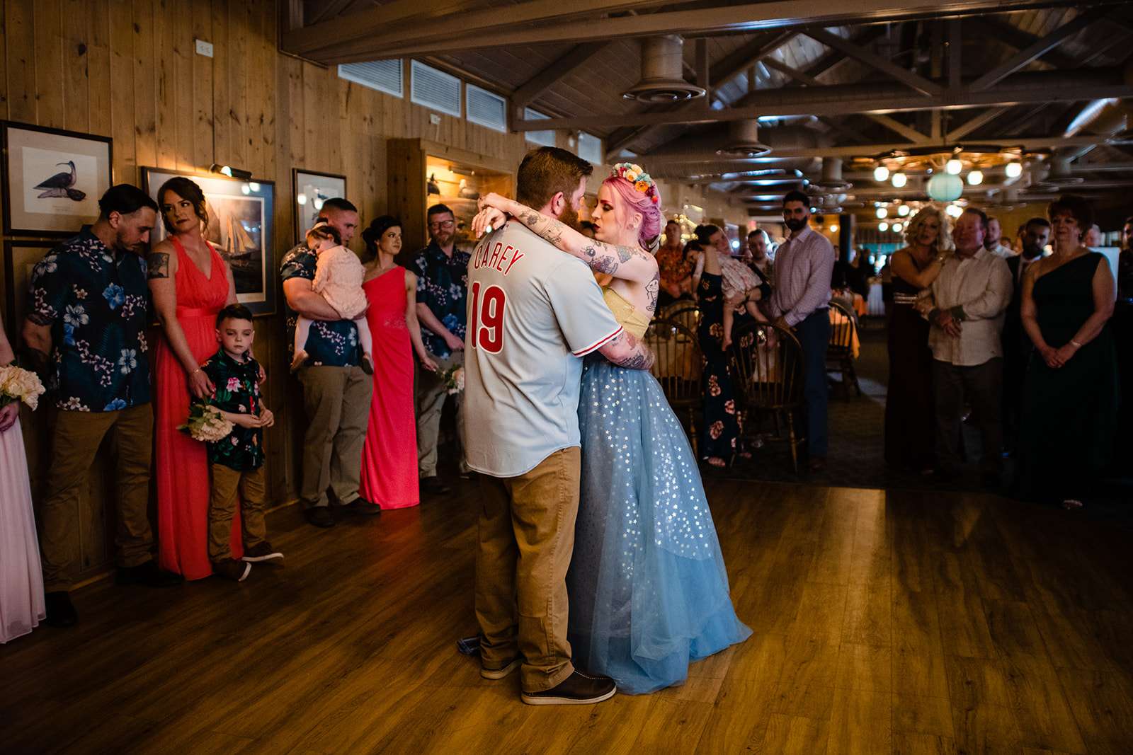 “The guys were dressed down in Hawaiian shirts and our dress code was casual (with Hawaiian shirts encouraged). My girls all wore different dresses in different colours and my dress was blue and gold. I wore our baby down the aisle in a ring sling, we didn’t have a cake, we didn’t do any of the typical wedding tosses. Joe changed into a custom Phillies jersey for the reception and we had a coffee bar and a cigar bar. Our wedding was also a dry wedding. I’m straightedge and Joe is in recovery, as was 90% of our guest list. Everyone still had an amazingly fun time – we had to ask the venue coordinator to turn on the lights at the end of the night so people would take the hint and leave!”
