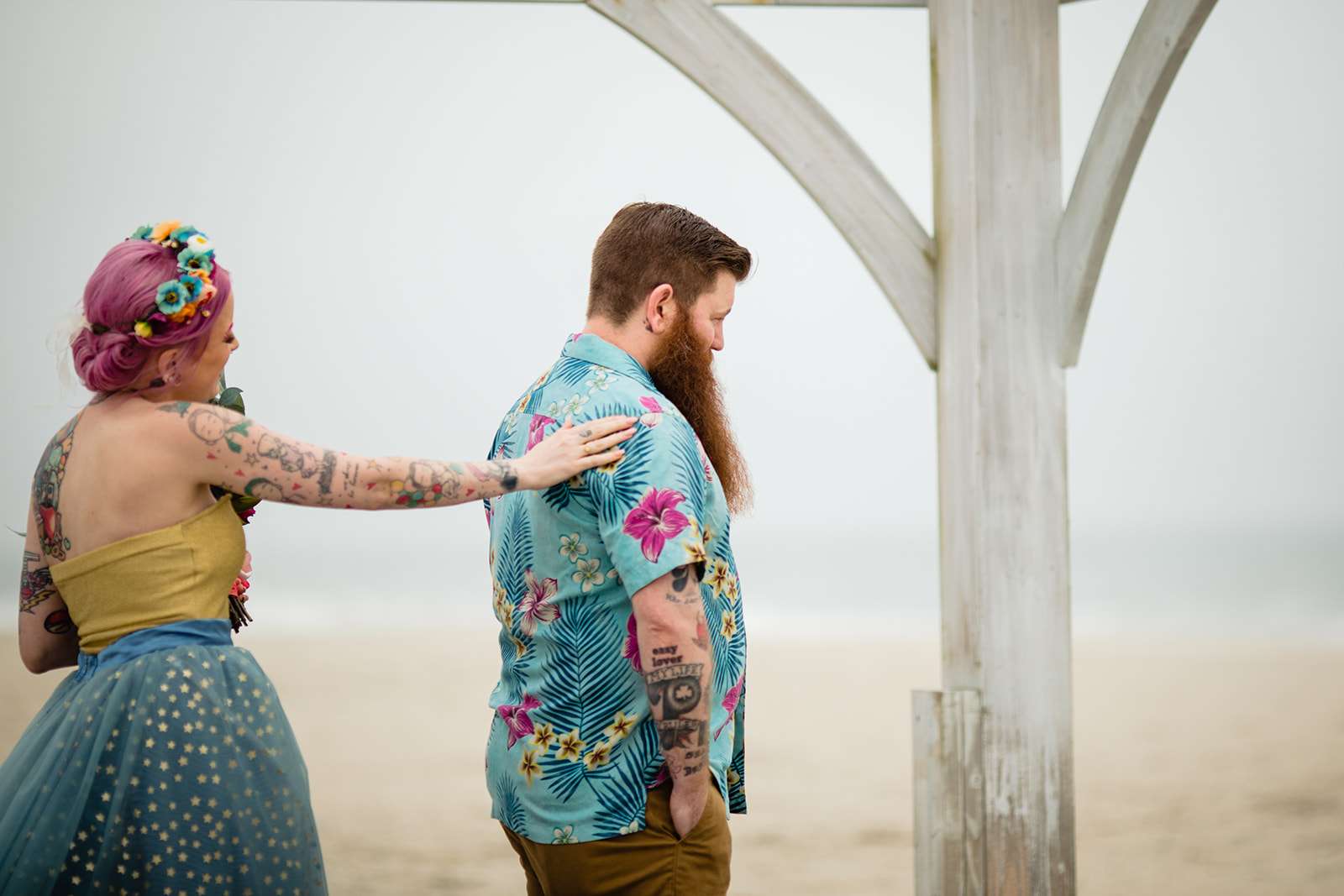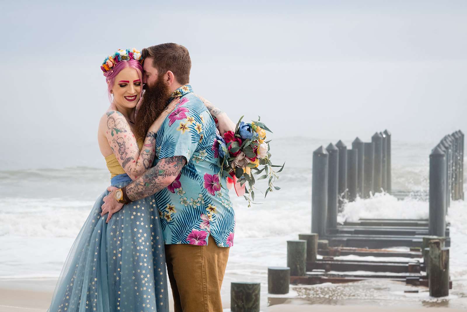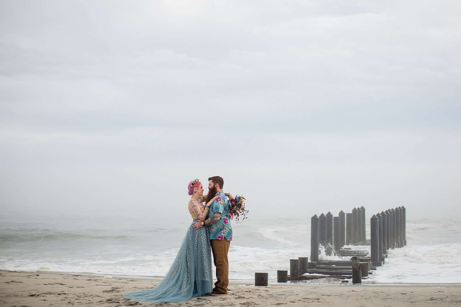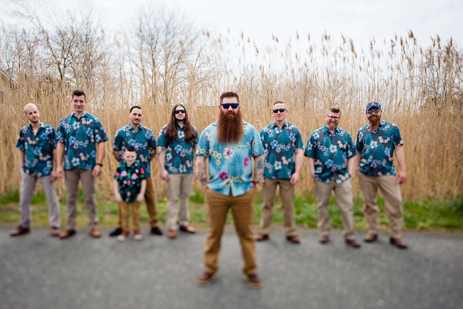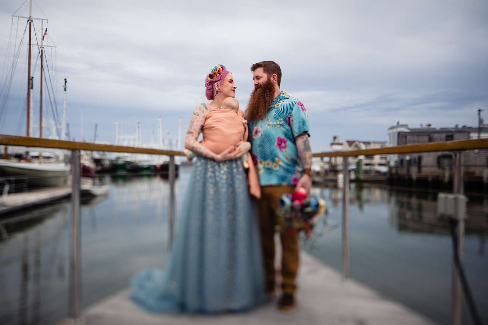 “The guys were dressed down in Hawaiian shirts and our dress code was casual (with Hawaiian shirts encouraged). My girls all wore different dresses in different colours and my dress was blue and gold. I wore our baby down the aisle in a ring sling, we didn’t have a cake, we didn’t do any of the typical wedding tosses. Joe changed into a custom Phillies jersey for the reception and we had a coffee bar and a cigar bar. Our wedding was also a dry wedding. I’m straightedge and Joe is in recovery, as was 90% of our guest list. Everyone still had an amazingly fun time – we had to ask the venue coordinator to turn on the lights at the end of the night so people would take the hint and leave!”