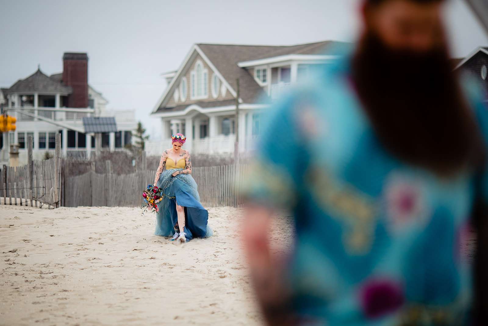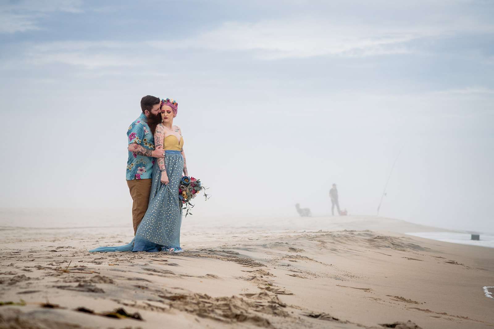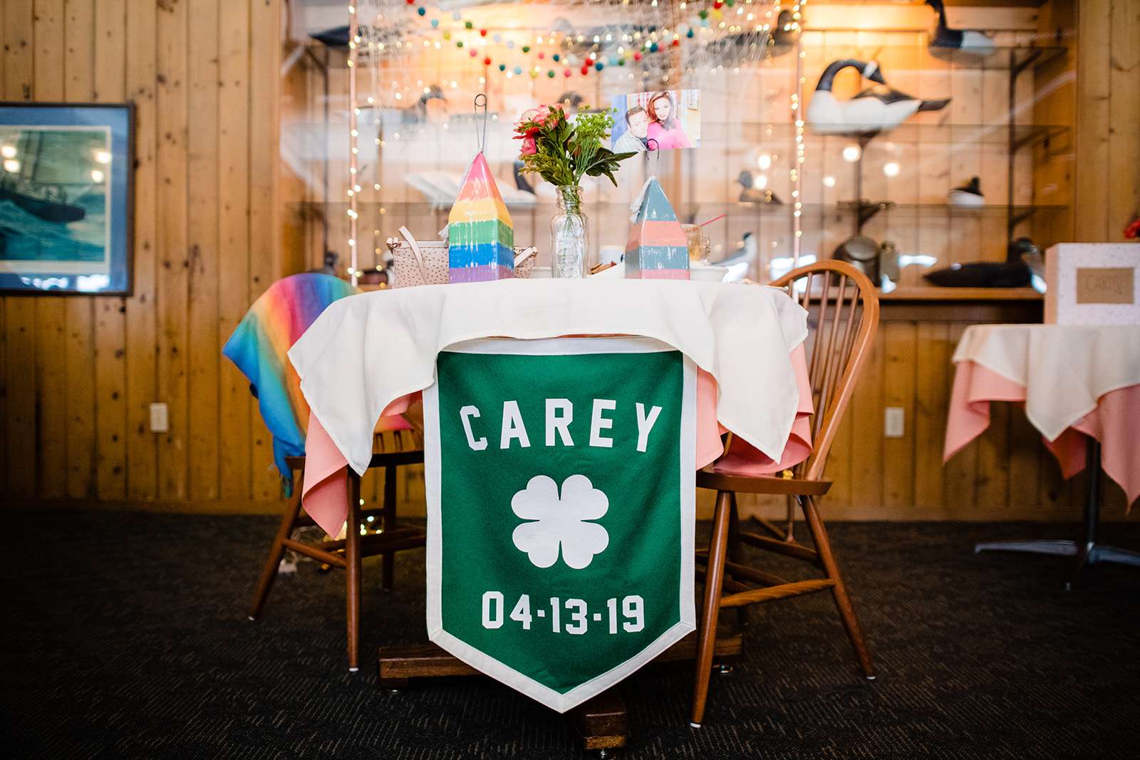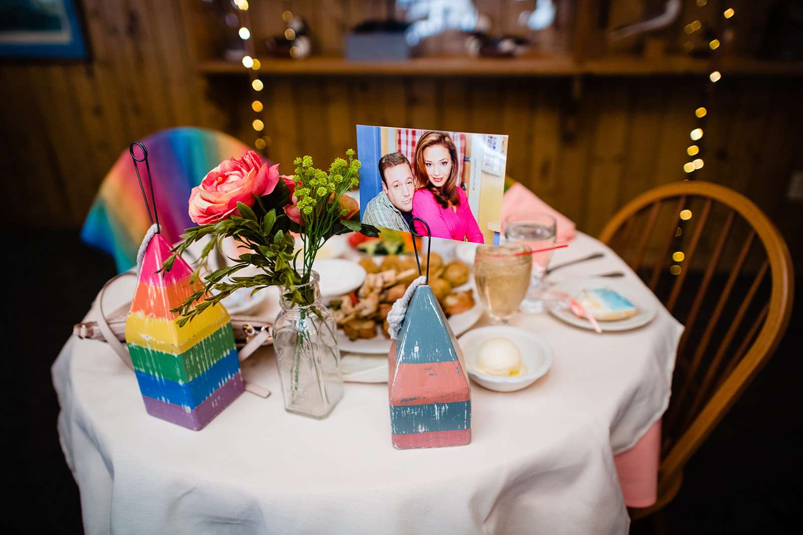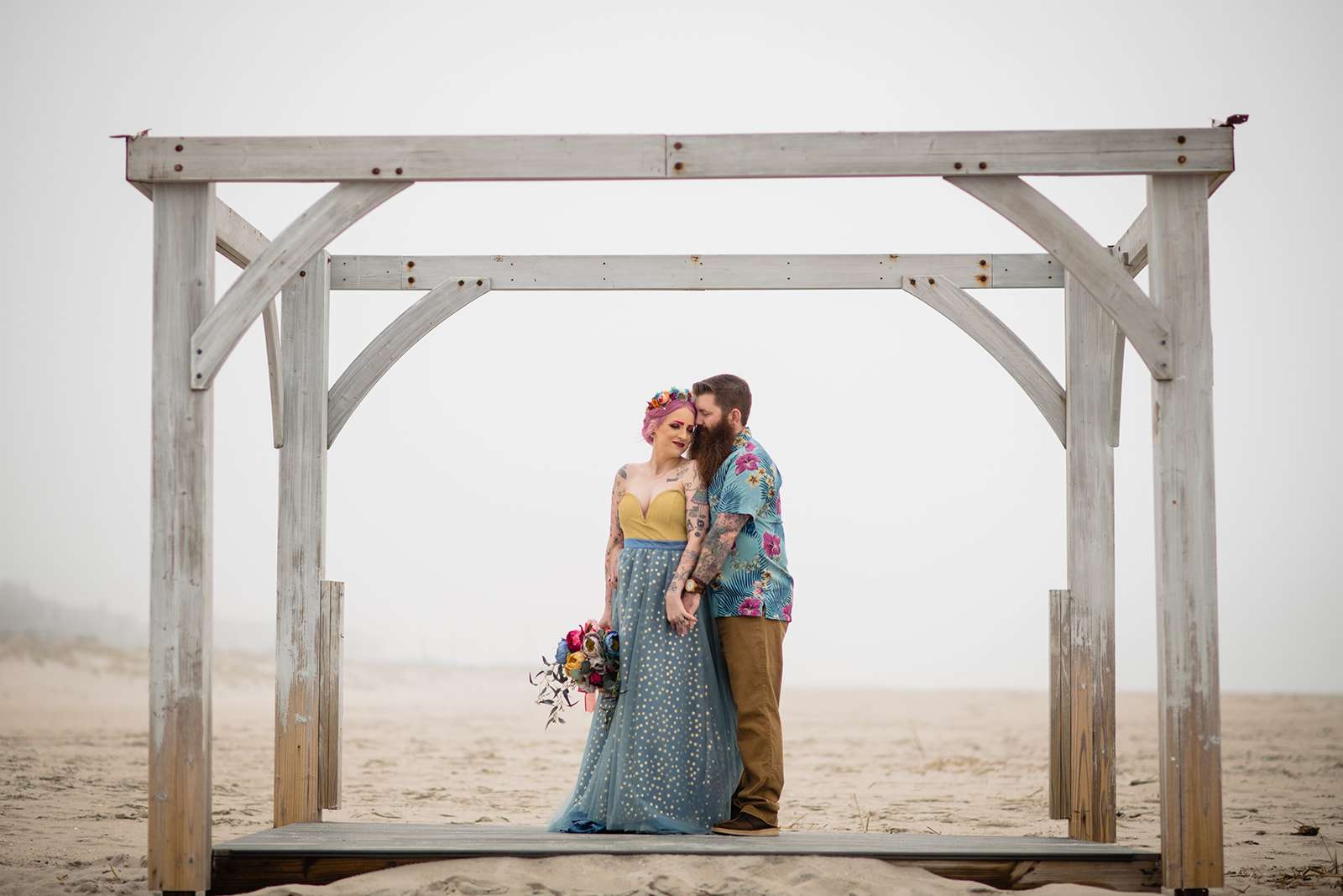 “The guys were dressed down in Hawaiian shirts and our dress code was casual (with Hawaiian shirts encouraged). My girls all wore different dresses in different colours and my dress was blue and gold. I wore our baby down the aisle in a ring sling, we didn’t have a cake, we didn’t do any of the typical wedding tosses. Joe changed into a custom Phillies jersey for the reception and we had a coffee bar and a cigar bar. Our wedding was also a dry wedding. I’m straightedge and Joe is in recovery, as was 90% of our guest list. Everyone still had an amazingly fun time – we had to ask the venue coordinator to turn on the lights at the end of the night so people would take the hint and leave!”
