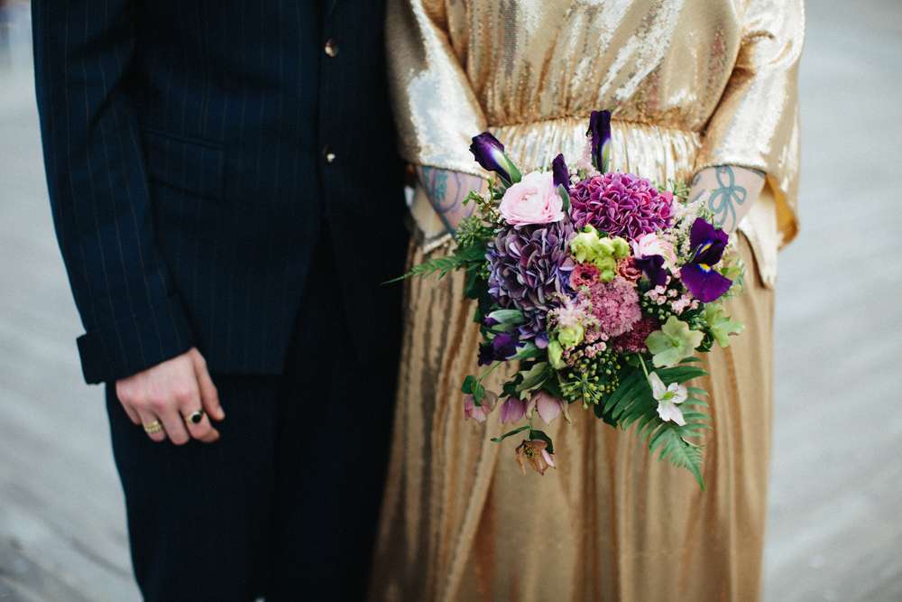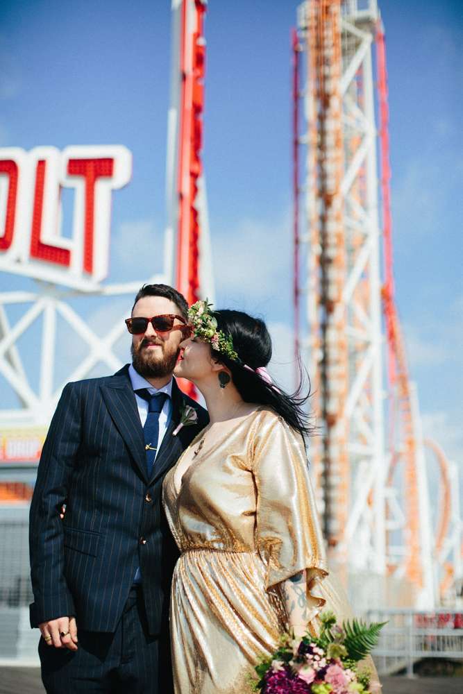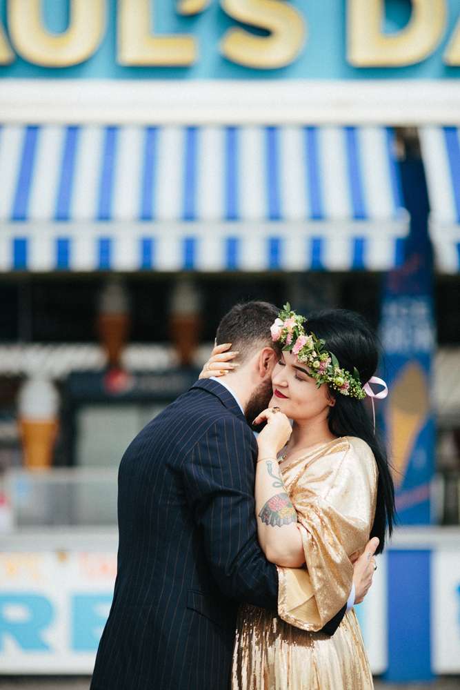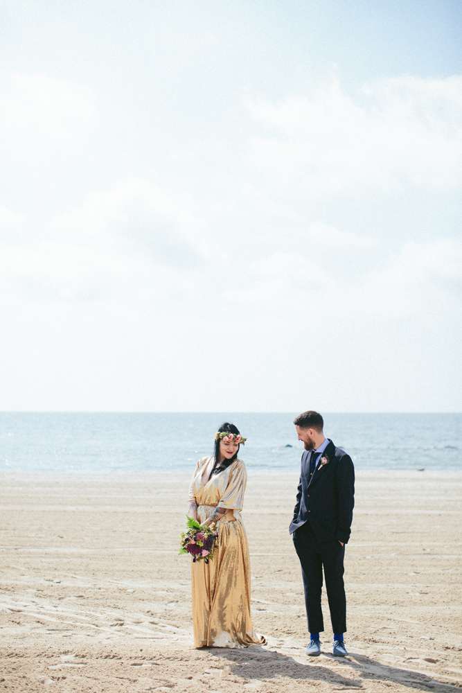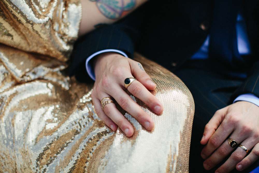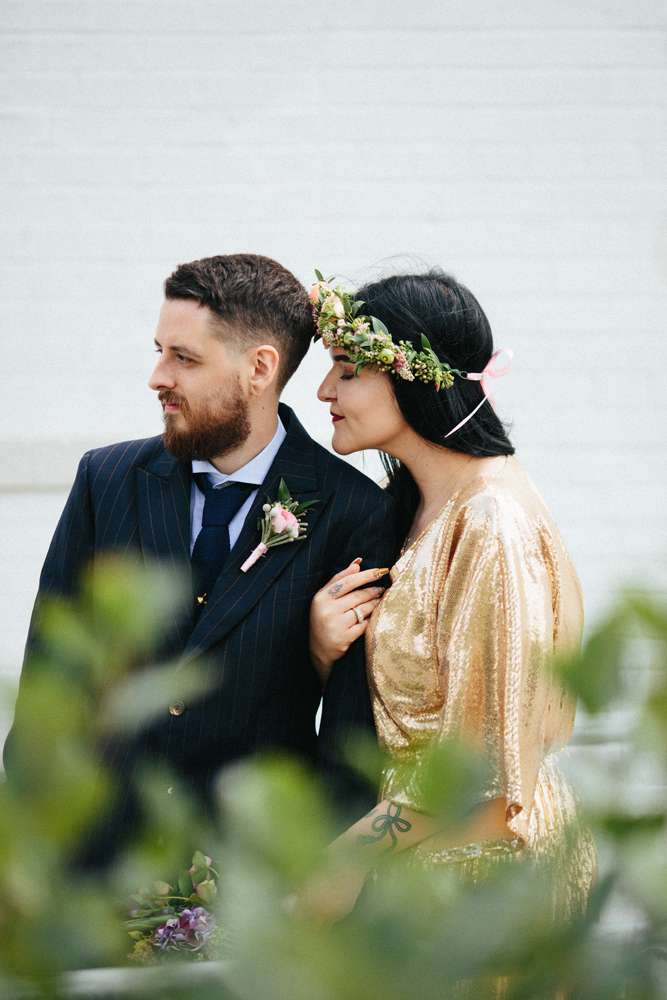 Both lovers of vintage style, this was also reflected in the outfits they both wore. Yvette’s stunning gold sequin dress was made in a kimono style by Hayley at Glory Days in York. Her shoes were rose gold Vivienne Westwood x Melissa numbers and her jewellery was a 1930s gold locket (with a curl of Rob’s hair inside) and an opal 1930s ring which was a gift from Rob. Rob also matched the gold theme by rocking a gold pinstriped suit from Vivienne Westwood.