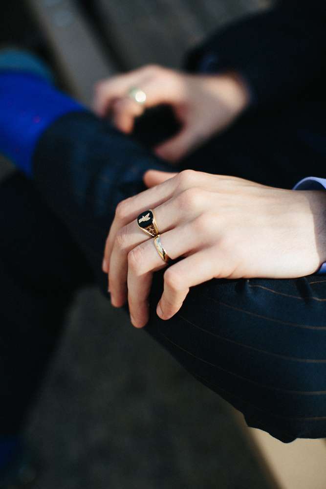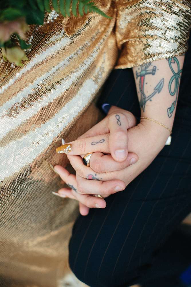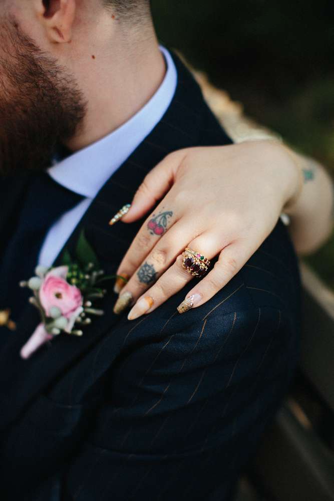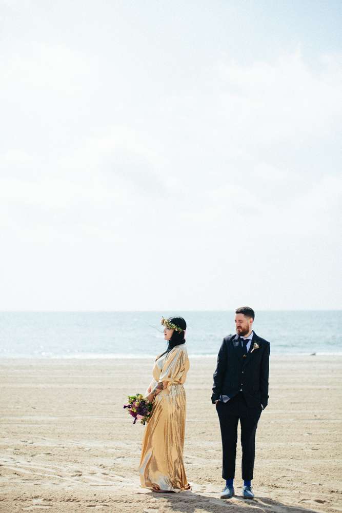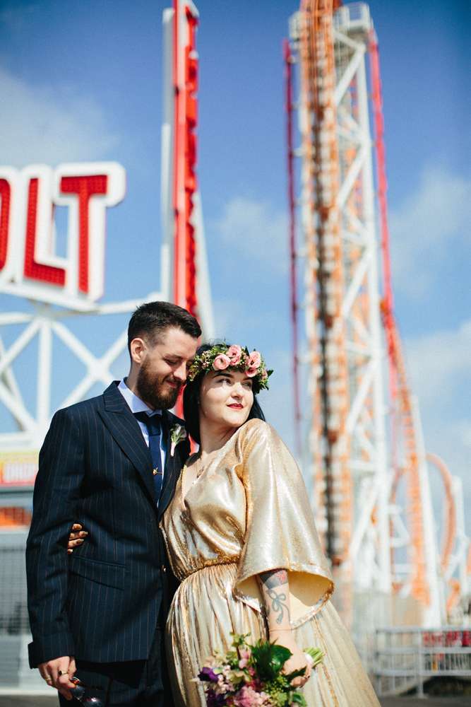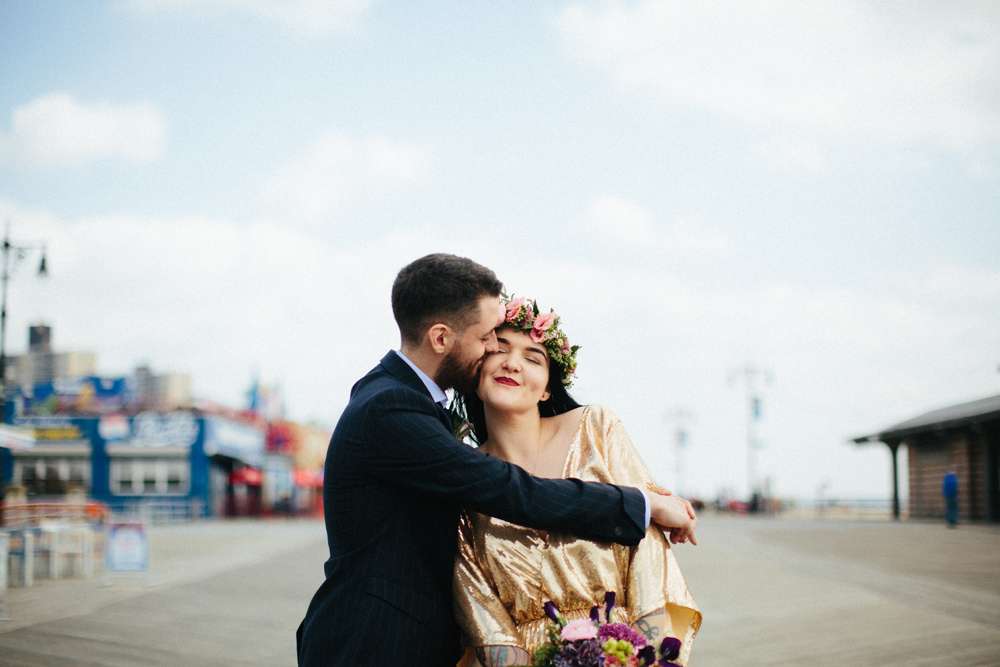 Both lovers of vintage style, this was also reflected in the outfits they both wore. Yvette’s stunning gold sequin dress was made in a kimono style by Hayley at Glory Days in York. Her shoes were rose gold Vivienne Westwood x Melissa numbers and her jewellery was a 1930s gold locket (with a curl of Rob’s hair inside) and an opal 1930s ring which was a gift from Rob. Rob also matched the gold theme by rocking a gold pinstriped suit from Vivienne Westwood.