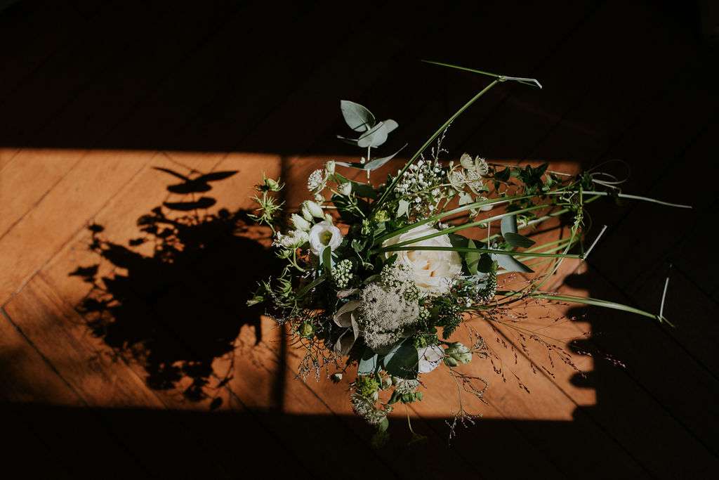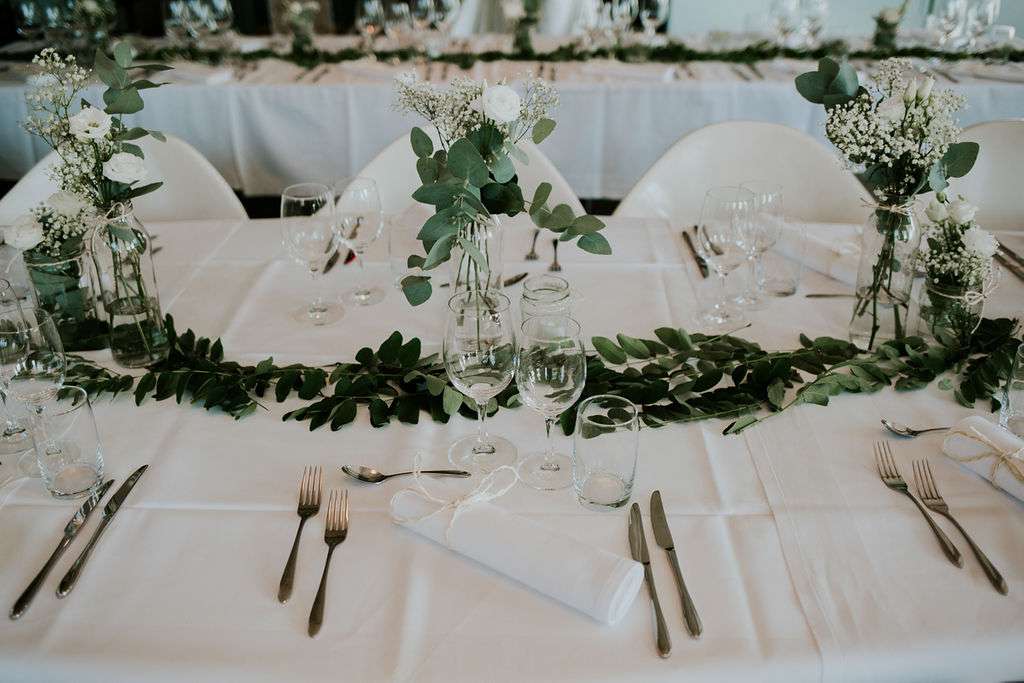 They didn’t have a massive budget so decided to go DIY or skip a lot of the extras. There was no cake or bridal party and they designed their own stationery and had them printed by Vista Print. The foliage on the tables were branches they’d cut the day before and added on top of homemade runners. They hired a local florist for the bouquet and buttonholes and a caterer and DJ, but everything else was homemade.