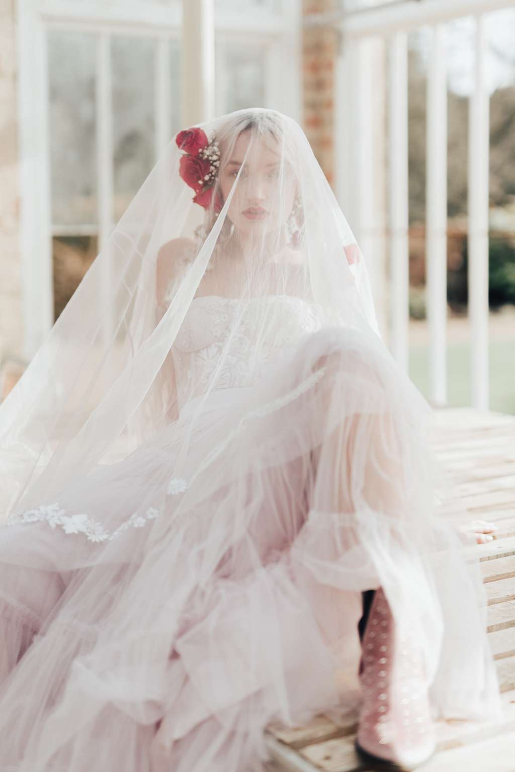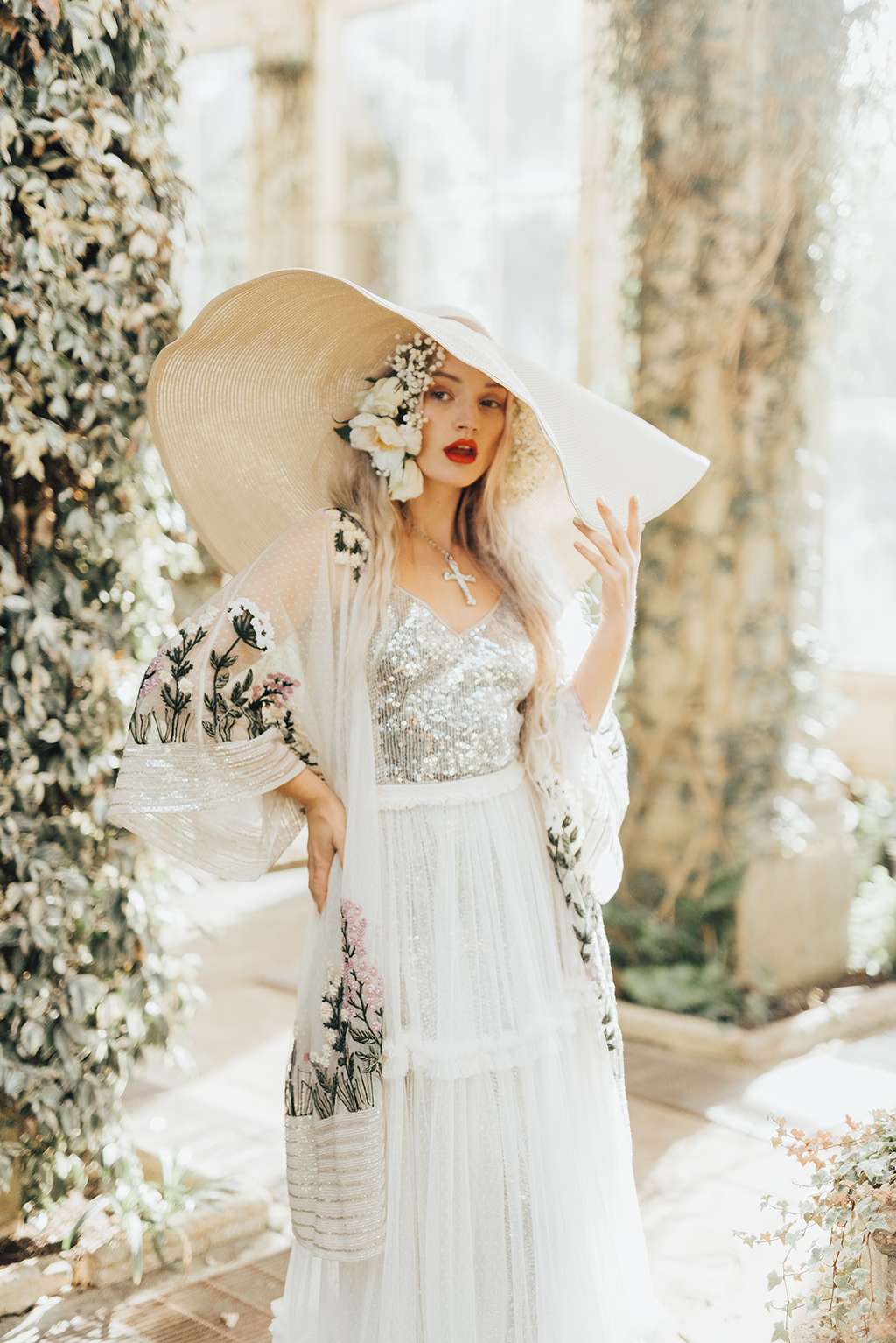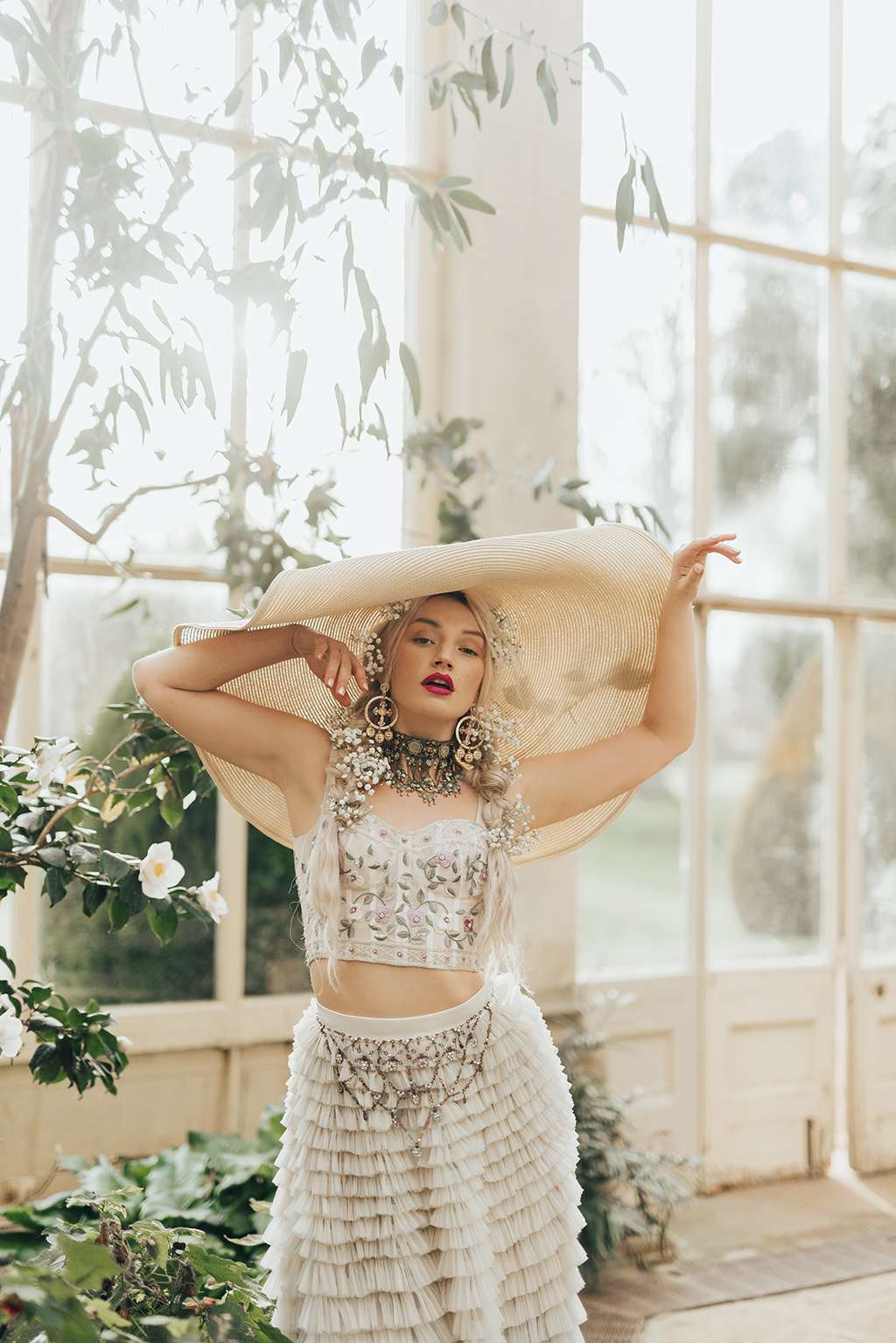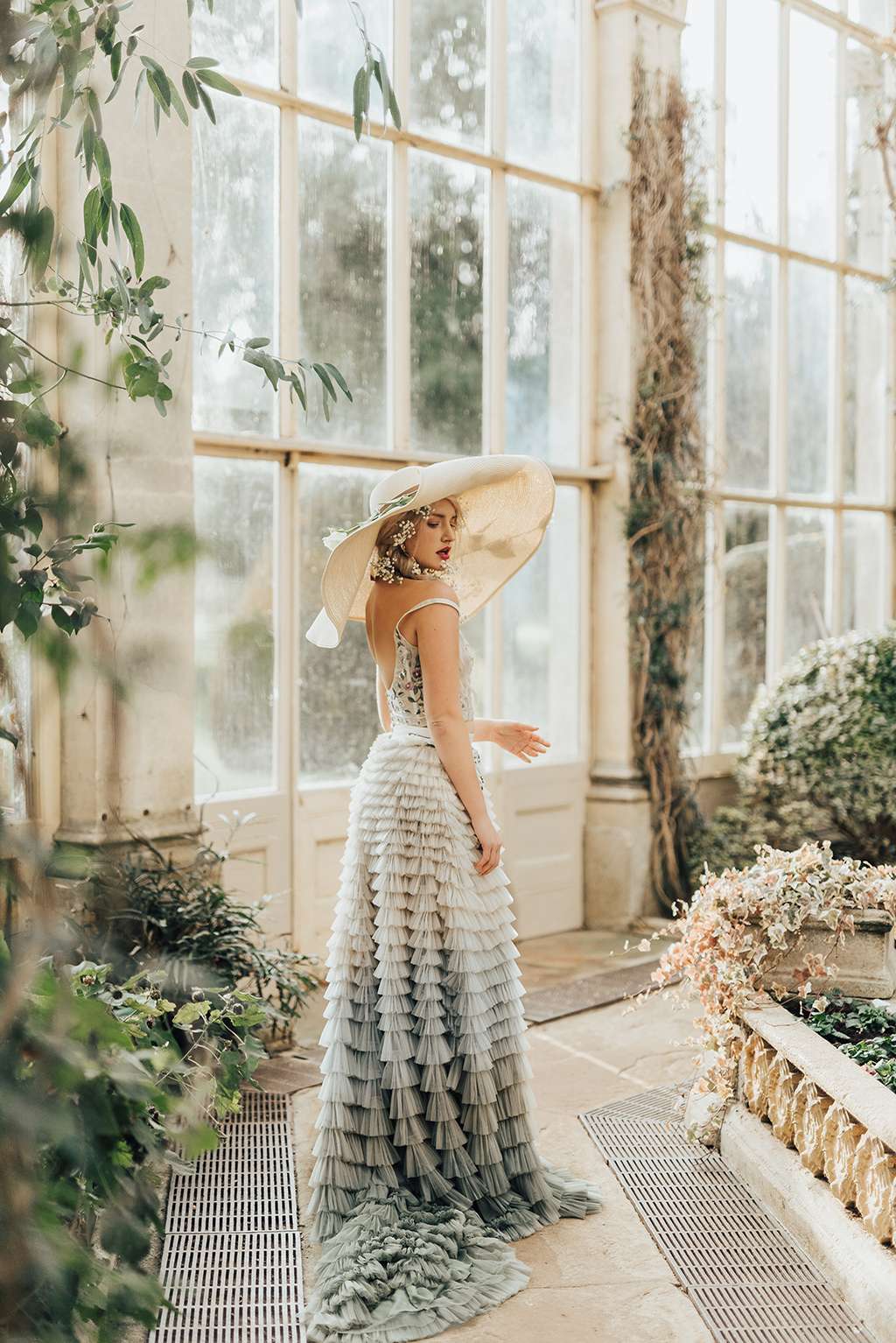 Shot at the orangery at Castle Ashby, Northamptonshire by Rebecca Carpenter, the team wanted to make the most of the natural light that fills the space and play with texture and layering to create modern bridal looks. From clashing prints, to layering up textures like sequins and spotted tulles with different floral patterns – more is definitely more in the Bowen Dryden camp!