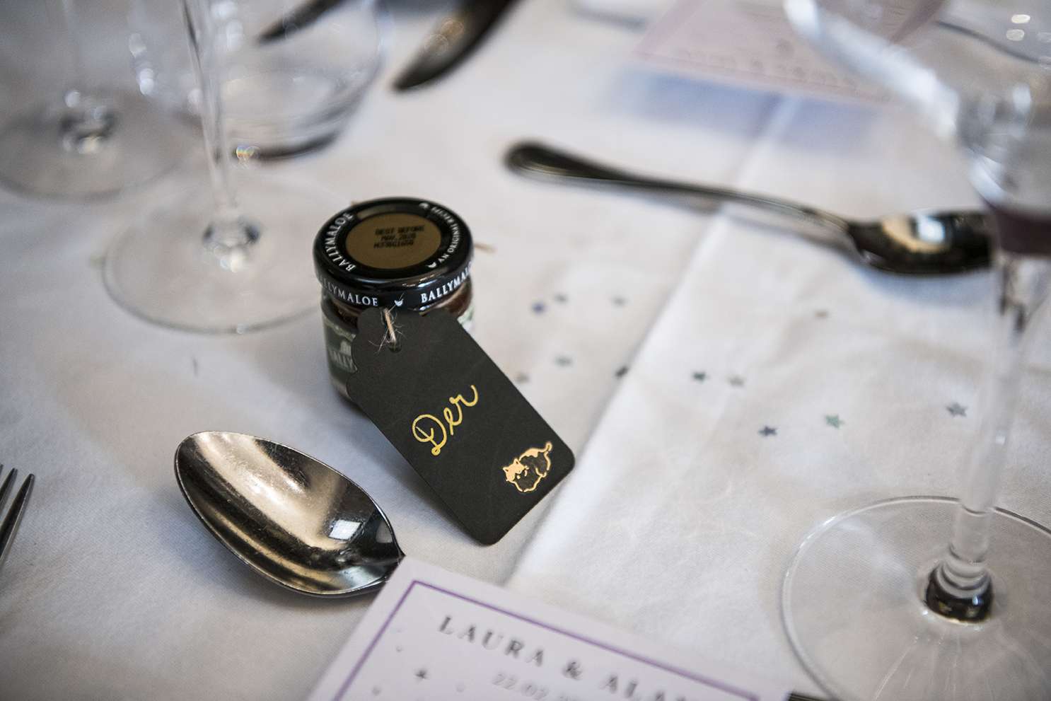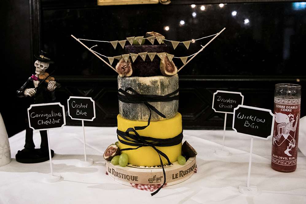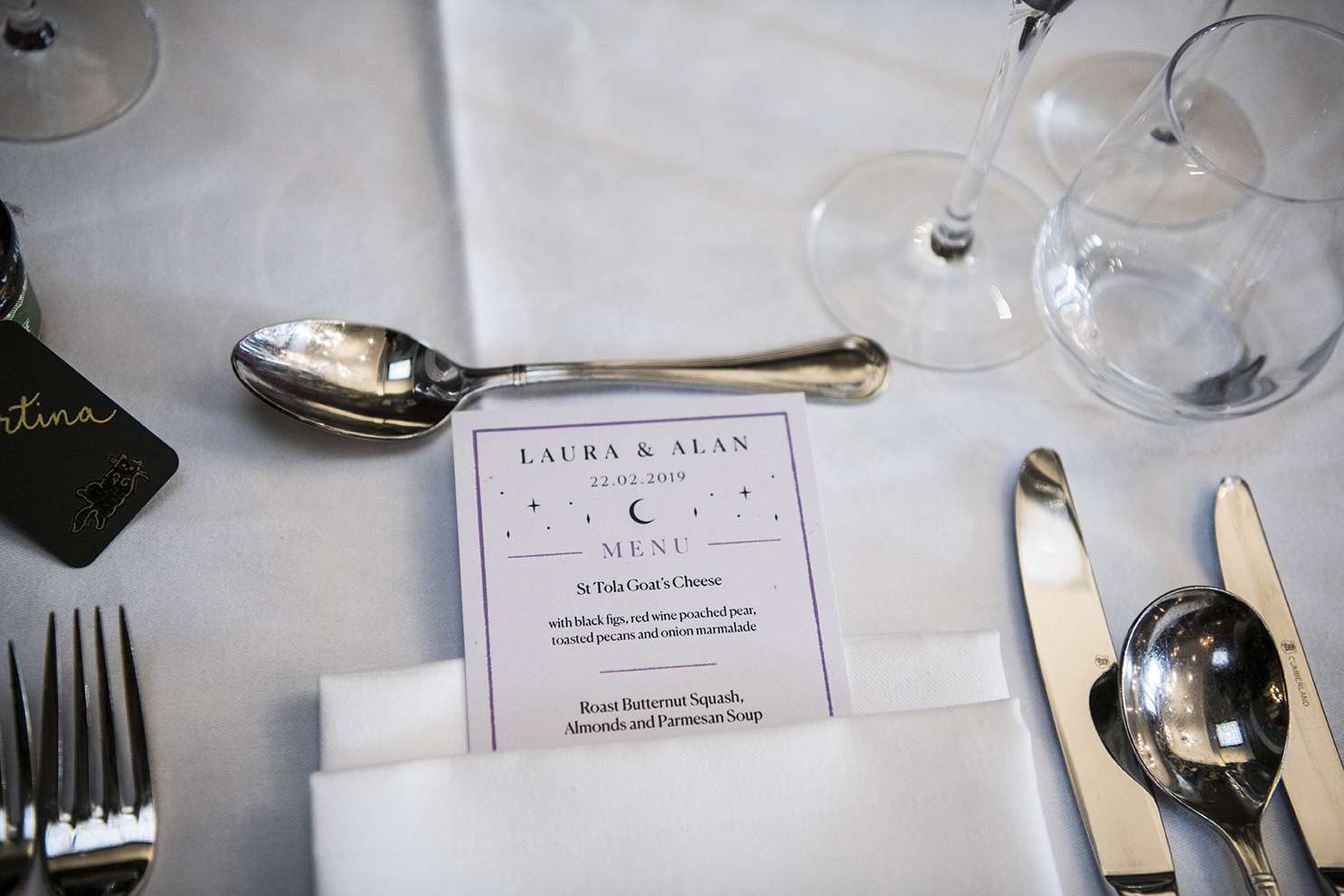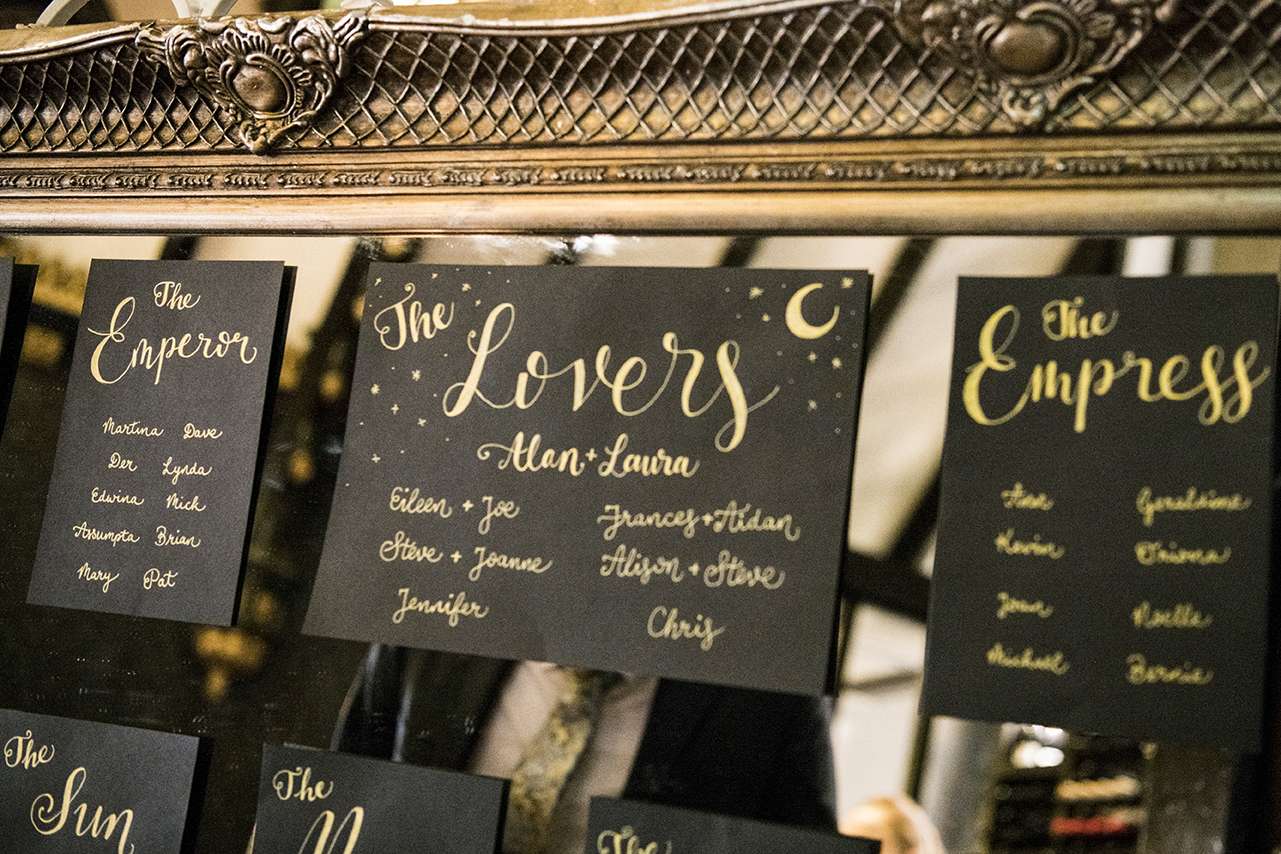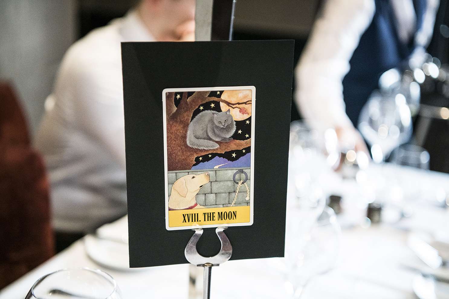 Laura practiced her calligraphy skills for the table plan and name cards, and they used their personal skull collection for centrepieces – topping up their stash with a dash round TK Maxx at Halloween for more spooky decor! The pièce de résistance was stumbling upon a set of perfect cat-themed Tarot cards to use as table names.